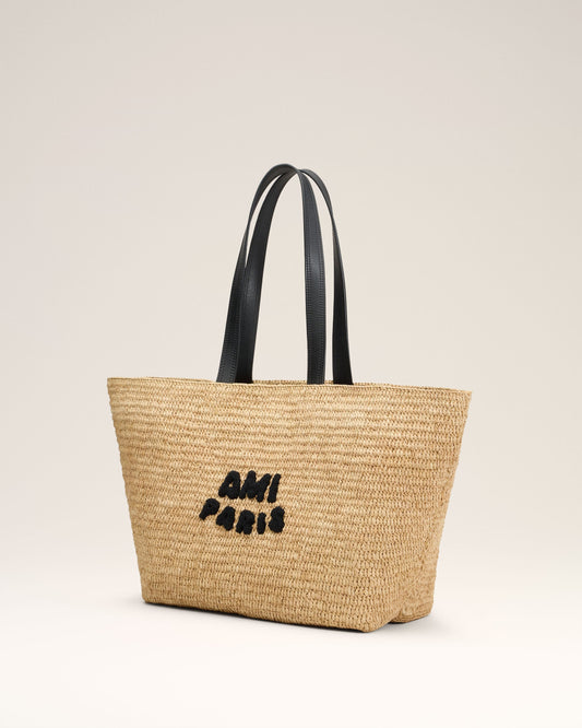 Tote bag in natural raffia. "Ami Paris" knitted patch One inside flying pocket in leather...