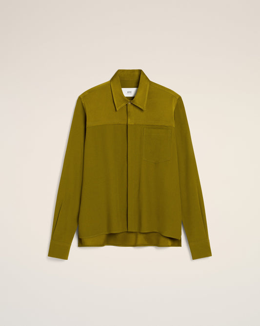 Long sleeve shirt with contrasted top in viscose and acetate crepe with satin back. Classic...