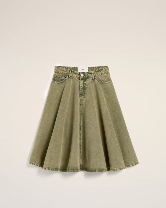 Midi skirt with godets in washed colored cotton twill. 35 cm middle back length...