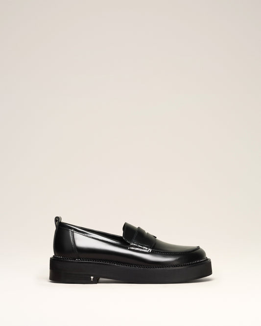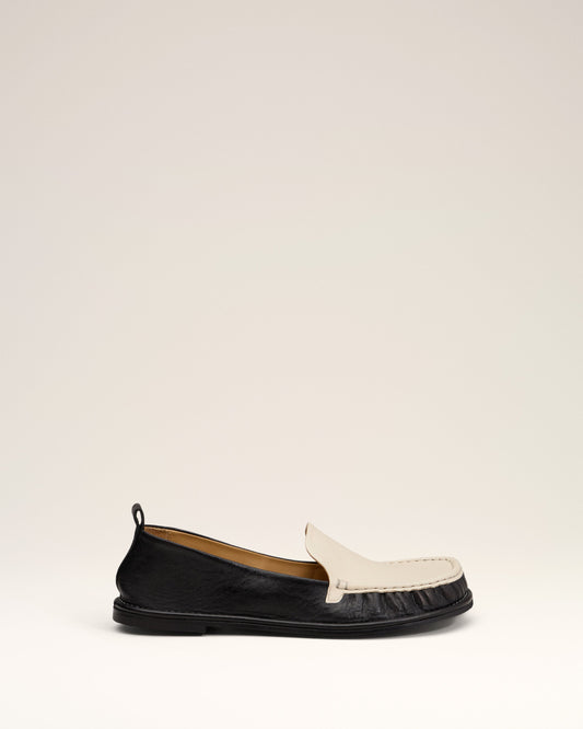 Bicolor anatomical-toe loafer in shiny crispy leather. Shiny smooth leather lining Tonal embossed "ami alexandre...