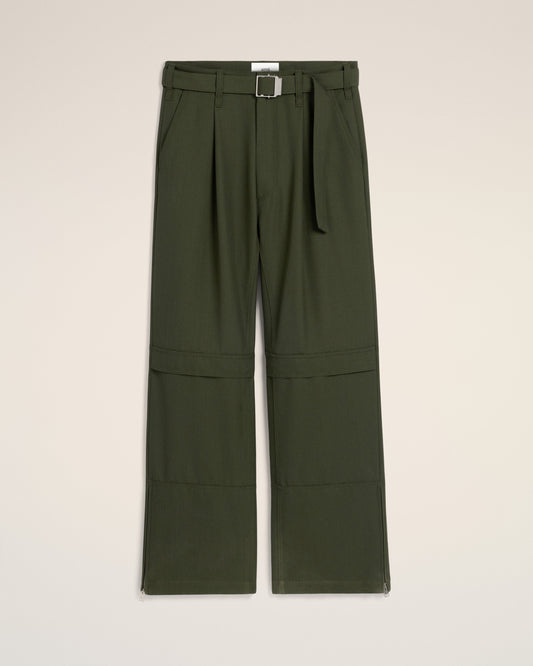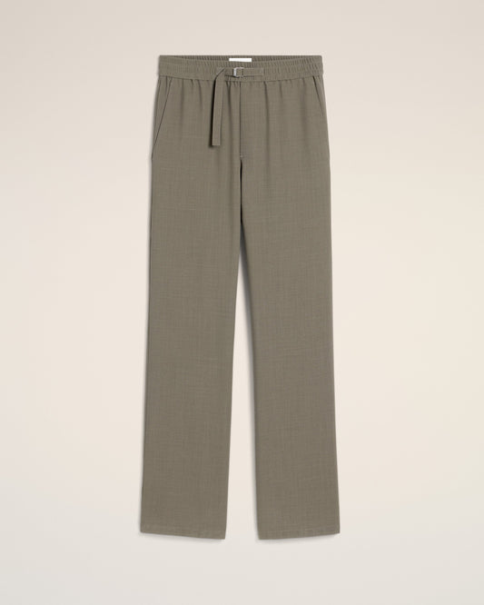 Elasticated waist in wool canvas. Straight fit 19 cm leg opening Elasticated belt with button...