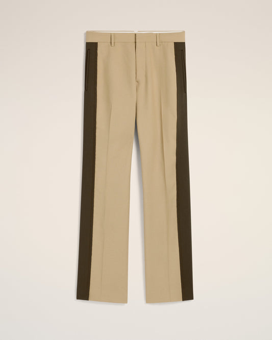 Contrasted band straight trousers in wool gabardine. Straight fit 23 cm bottom leg width...