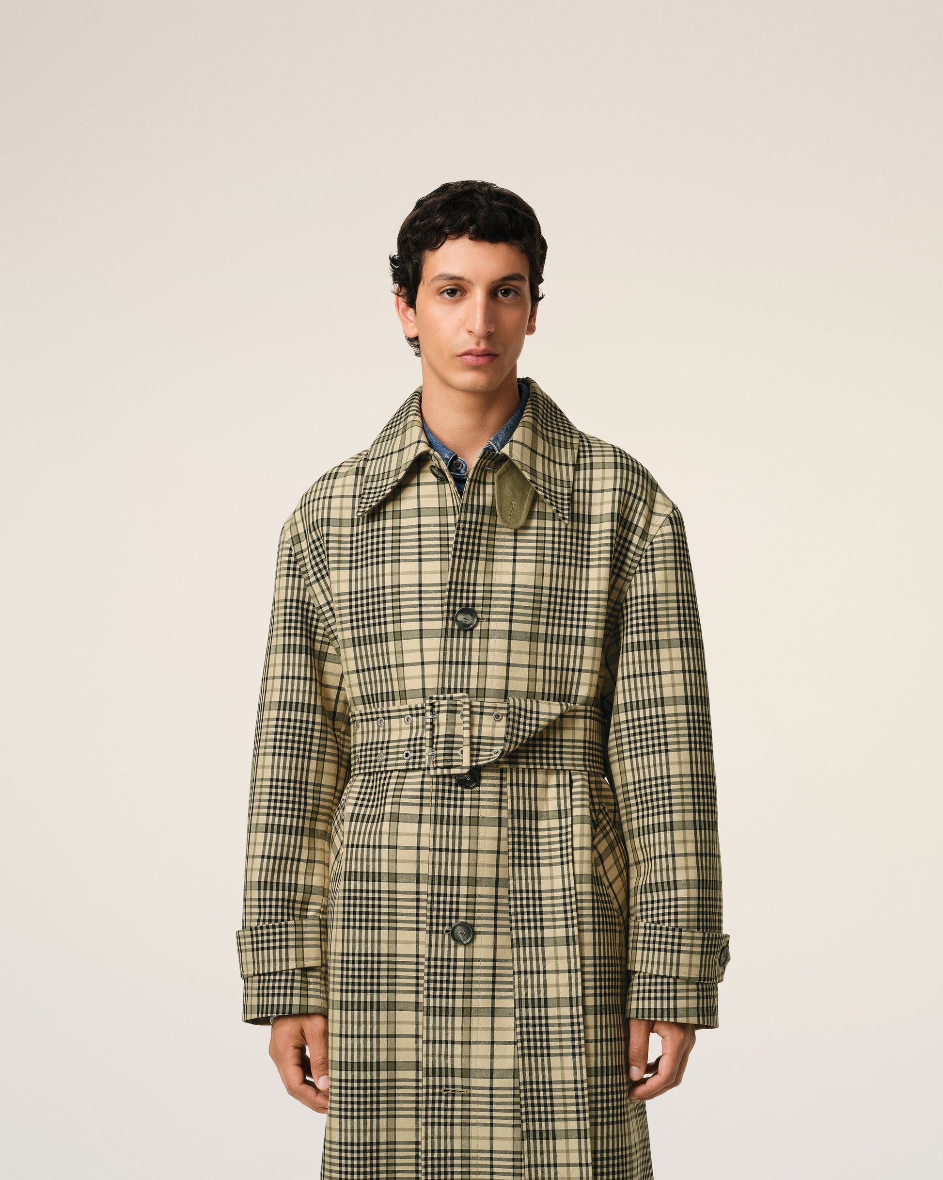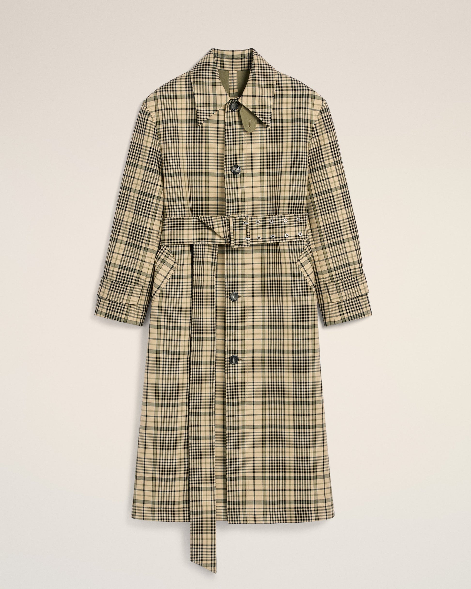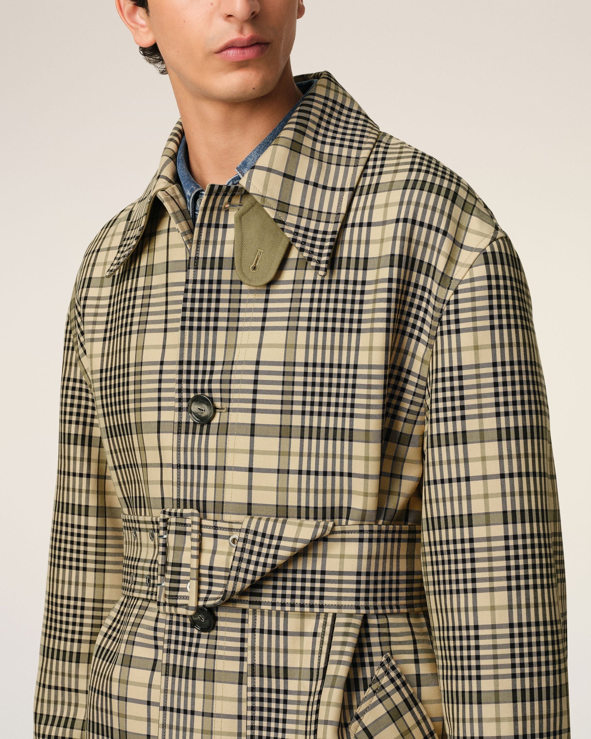 Belted mac in checks macintosh bounded. 102 cm center back length (size M) Water-repellent fabric Inside of the fabric with a contrasted color Front opening with horn buttons with metal eyelets Belt and buckle in main fabric with metal eyelets Adjustable cuffs with horn buttons with metal eyelets Embossed Ami de Coeur at the back of the collar Made in Romania (with love) REF: HJK520.CO0111.7252