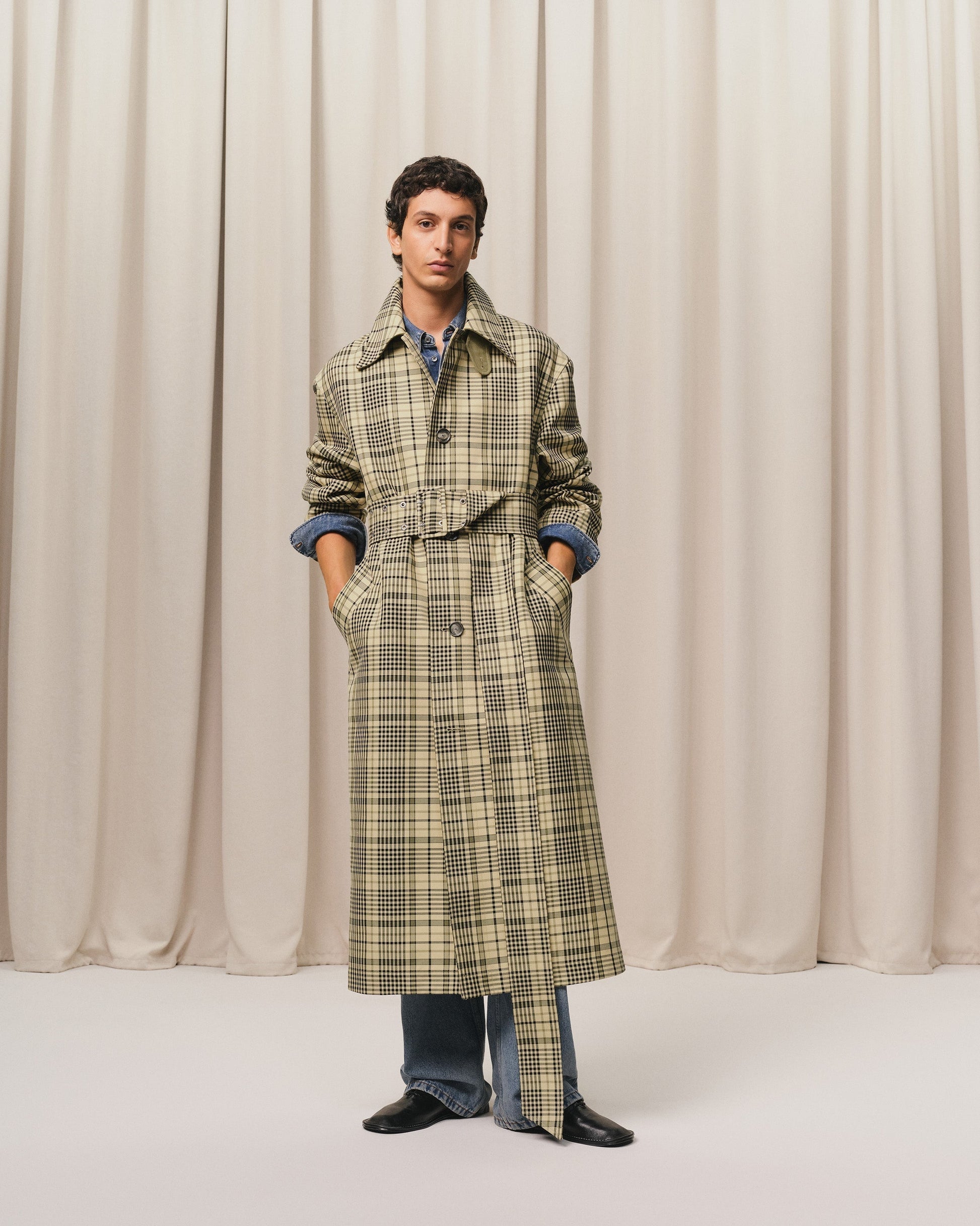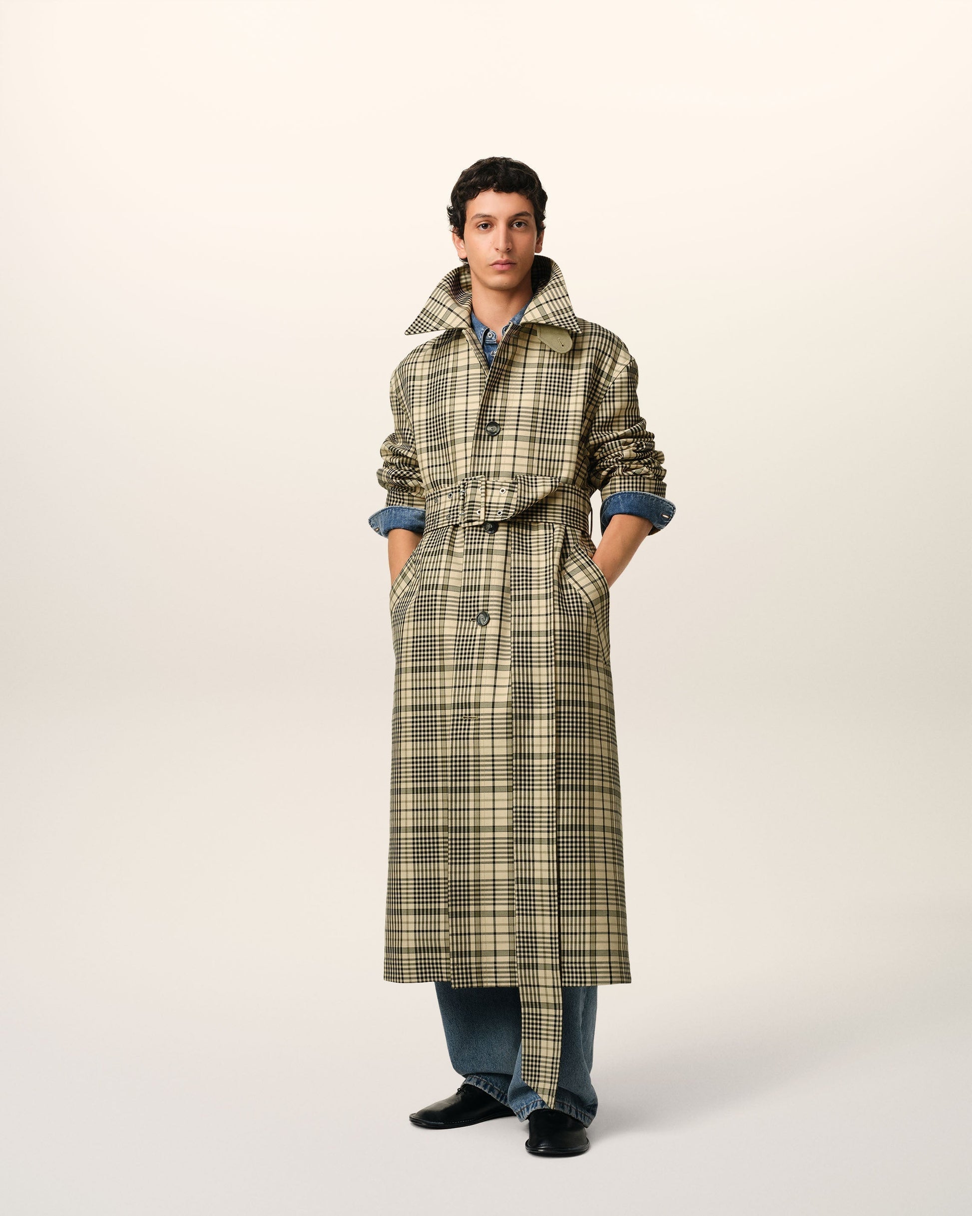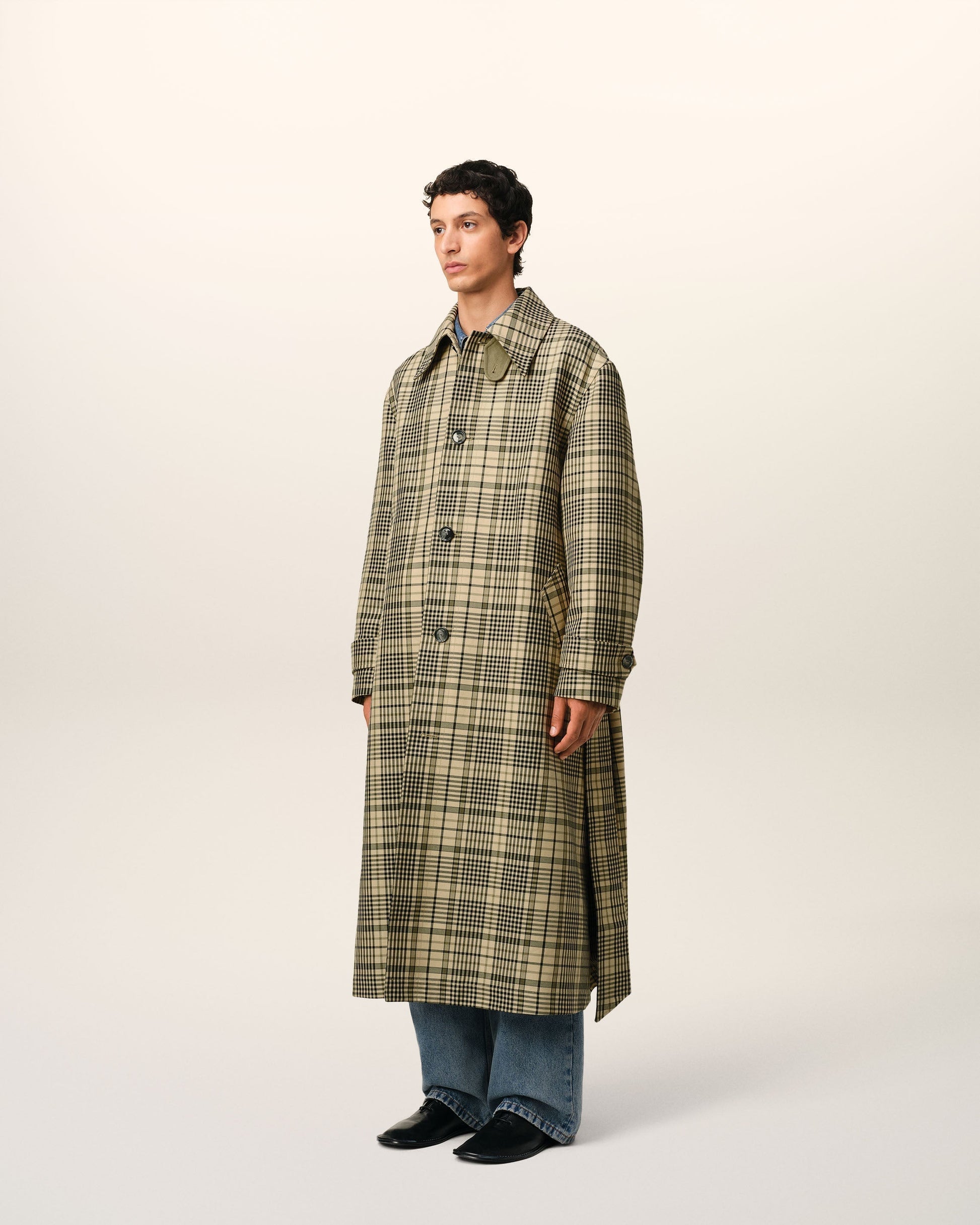 Belted mac in checks macintosh bounded. 102 cm center back length (size M) Water-repellent fabric Inside of the fabric with a contrasted color Front opening with horn buttons with metal eyelets Belt and buckle in main fabric with metal eyelets Adjustable cuffs with horn buttons with metal eyelets Embossed Ami de Coeur at the back of the collar Made in Romania (with love) REF: HJK520.CO0111.7252