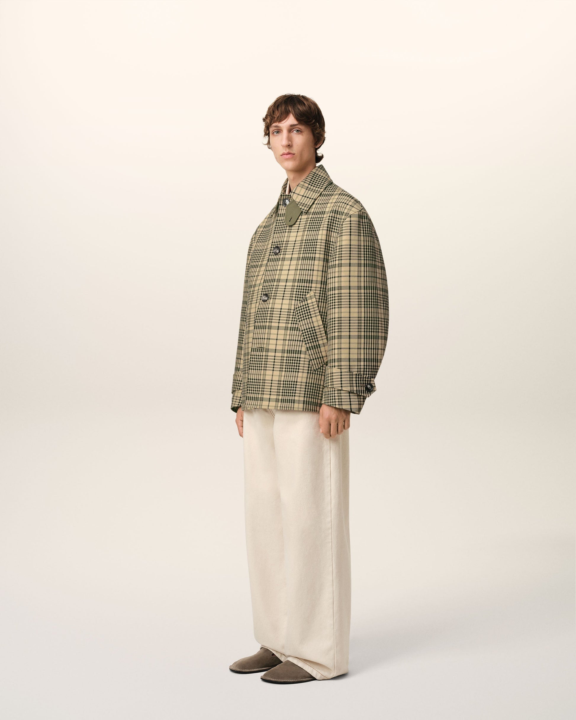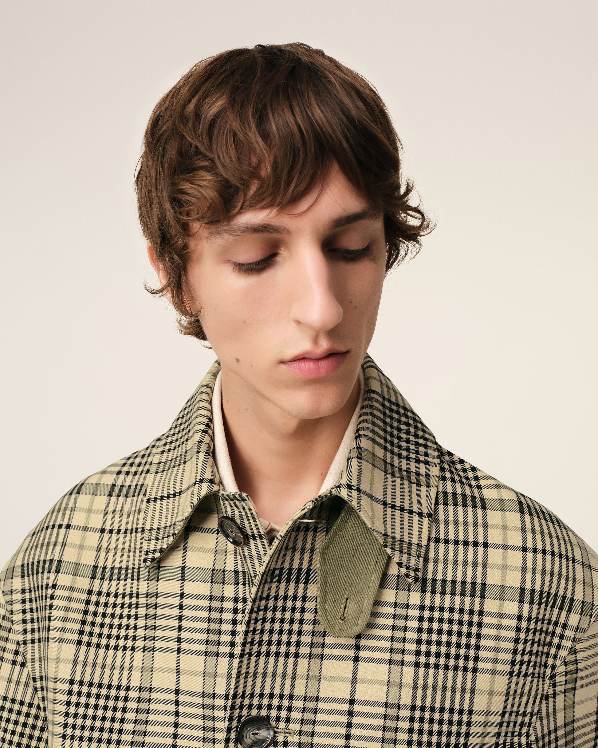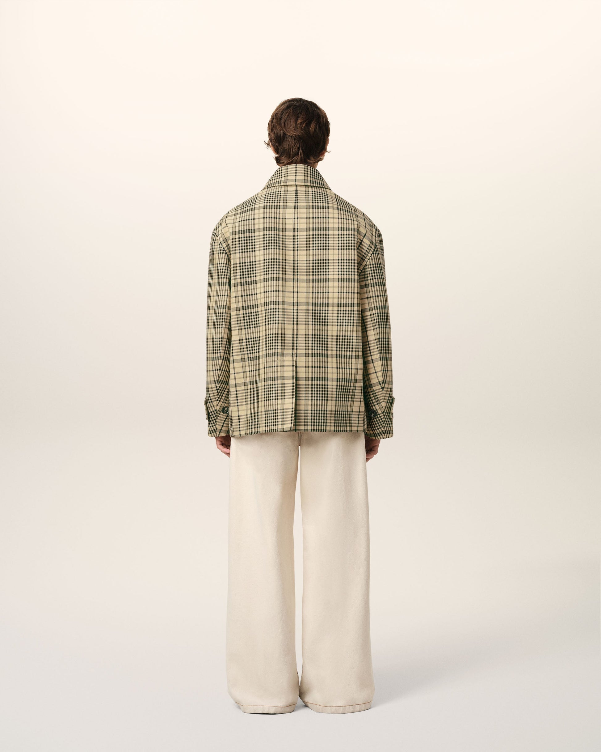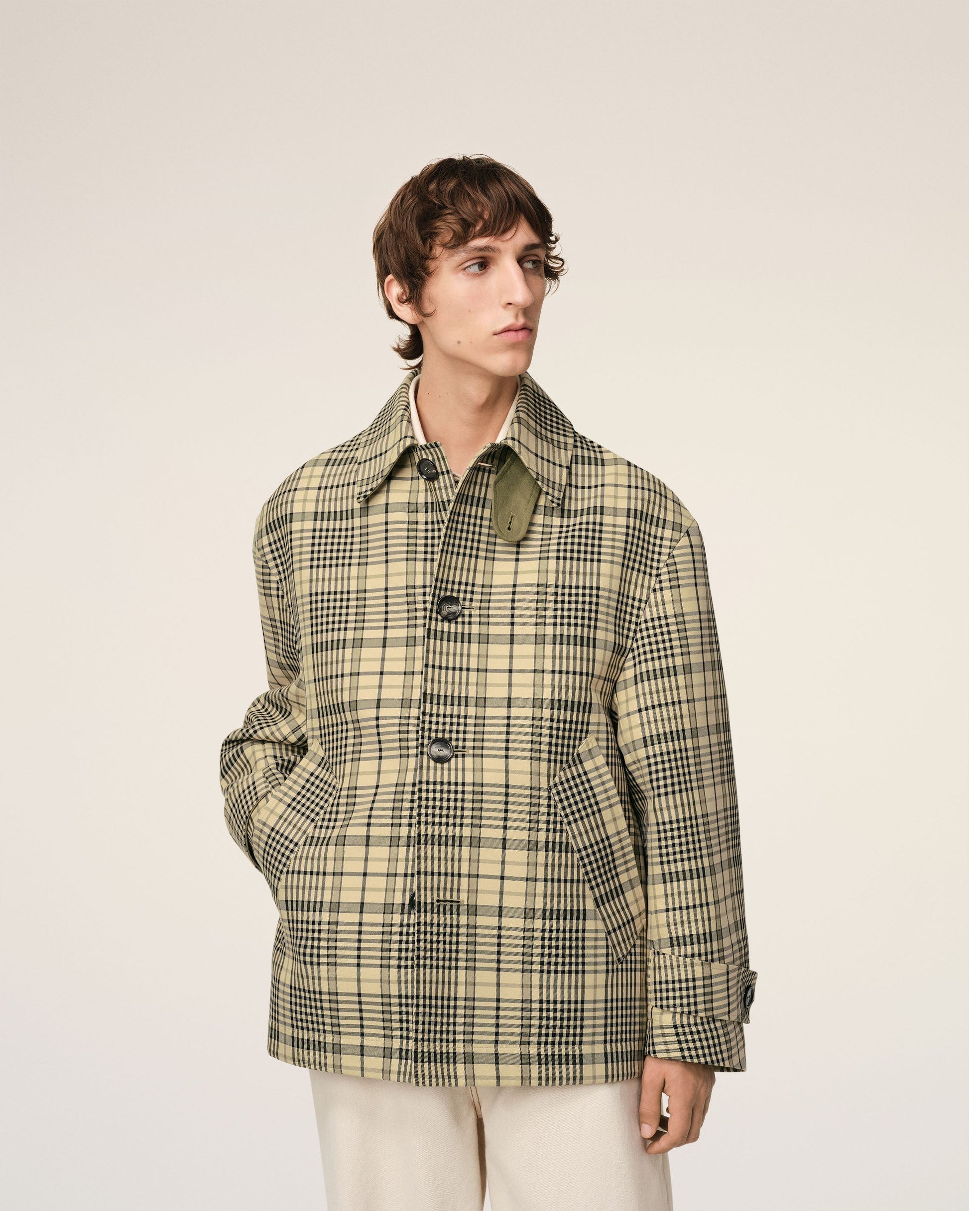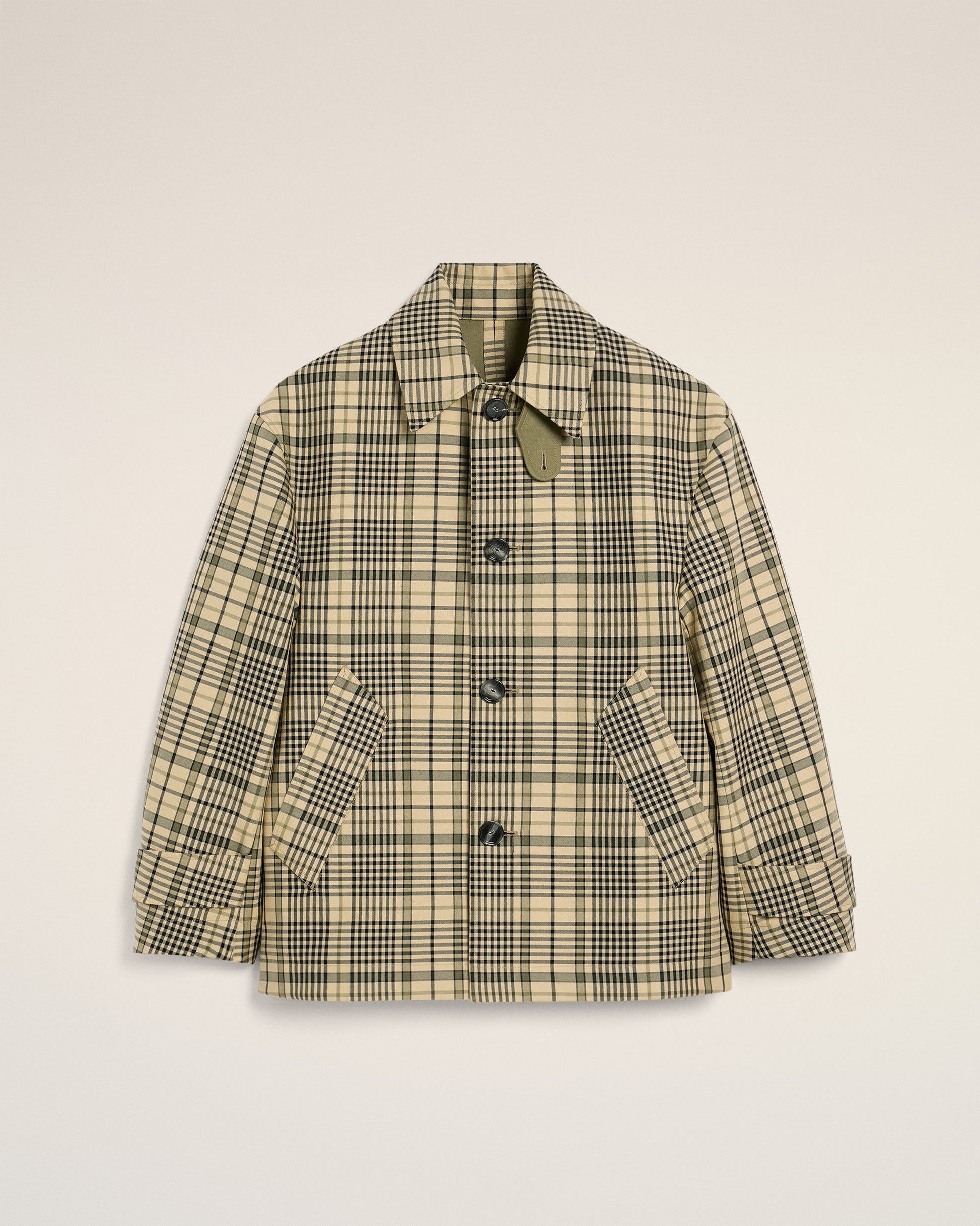 Buttoned jacket in checks macintosh bounded. 75 cm center back length (size M) Water-repellent fabric Inside of the fabric with a contrasted color Front opening with horn buttons with metal eyelets Adjustable cuffs with horn buttons with metal eyelets Embossed Ami de Coeur at the back of the collar Made in Romania (with love) REF: HJK072.CO0111.7252
