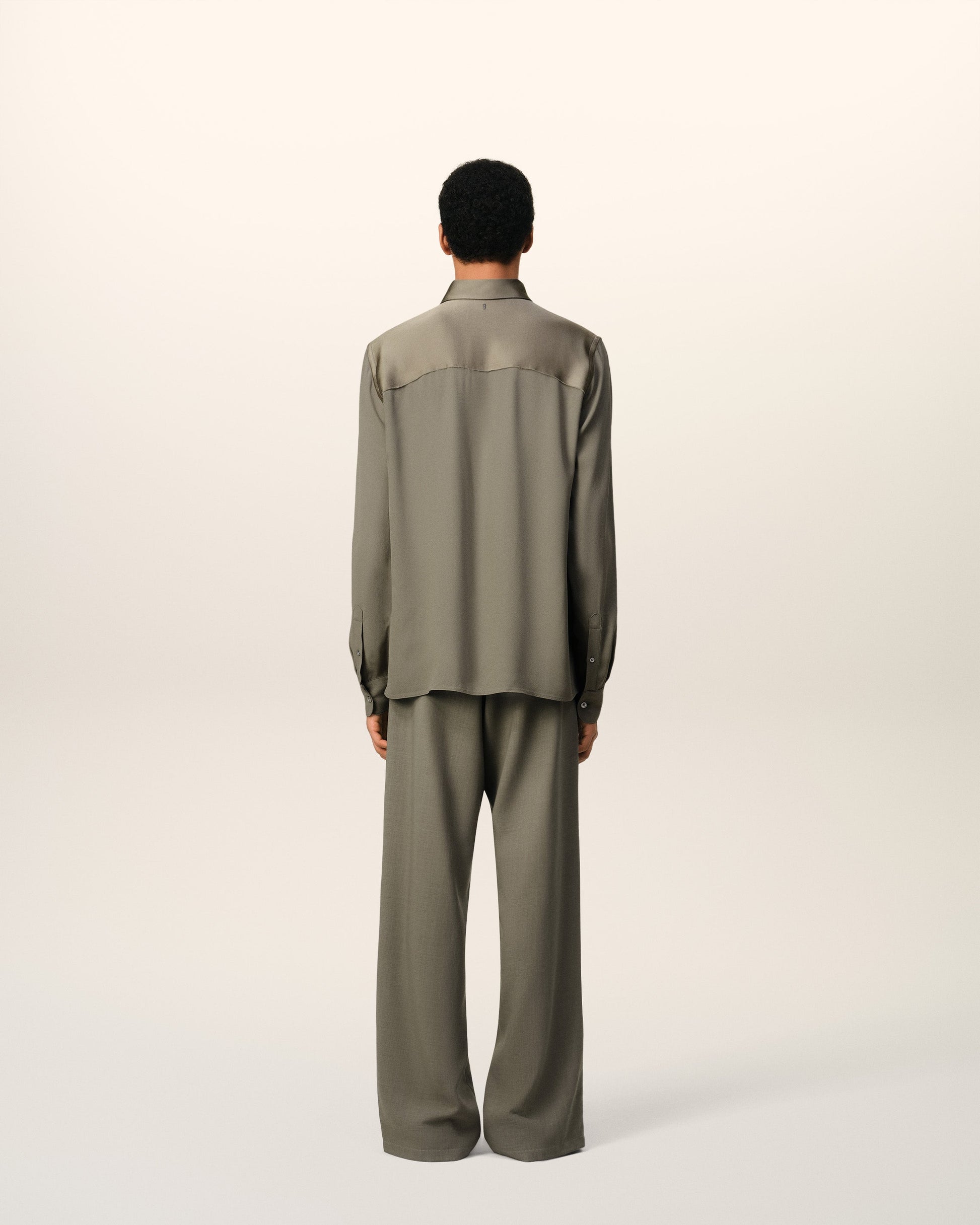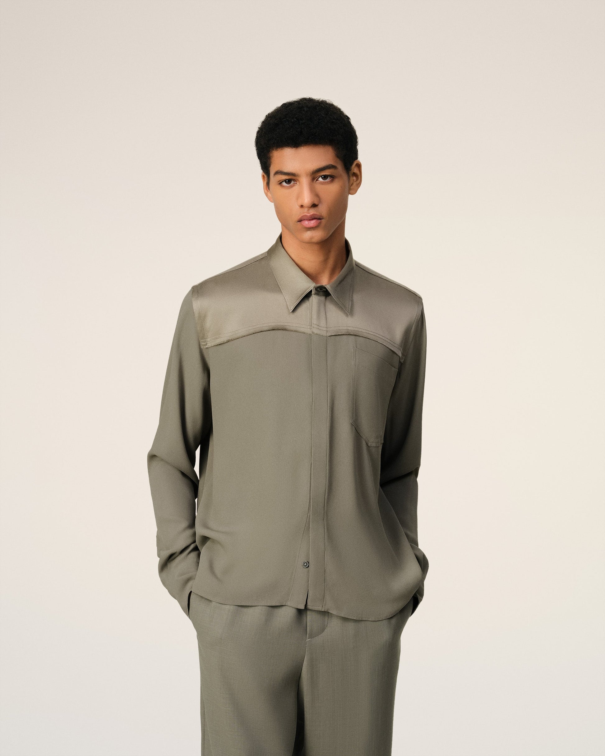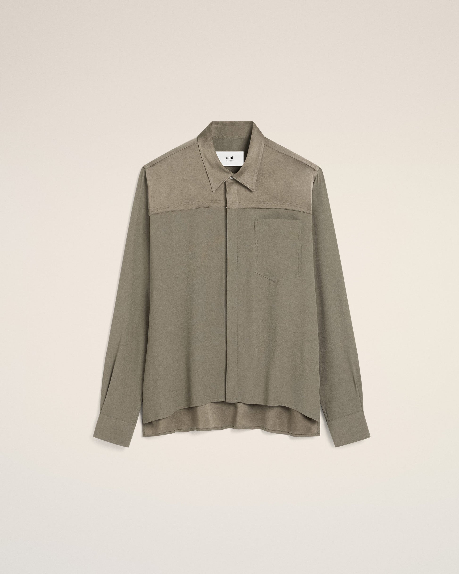 Long sleeve shirt with contrasted top in viscose and acetate crepe with satin back. Classic fit 74 cm center back length (taille 40) Contrast with the shine of the fabric Mini Ami de Coeur engraved metal plate under collar Classic collar Chest patch pocket Hidden tab and cuffs buttoned Metal buttons Made in Portugal (with love) REF: HSH020.AC0014.0952