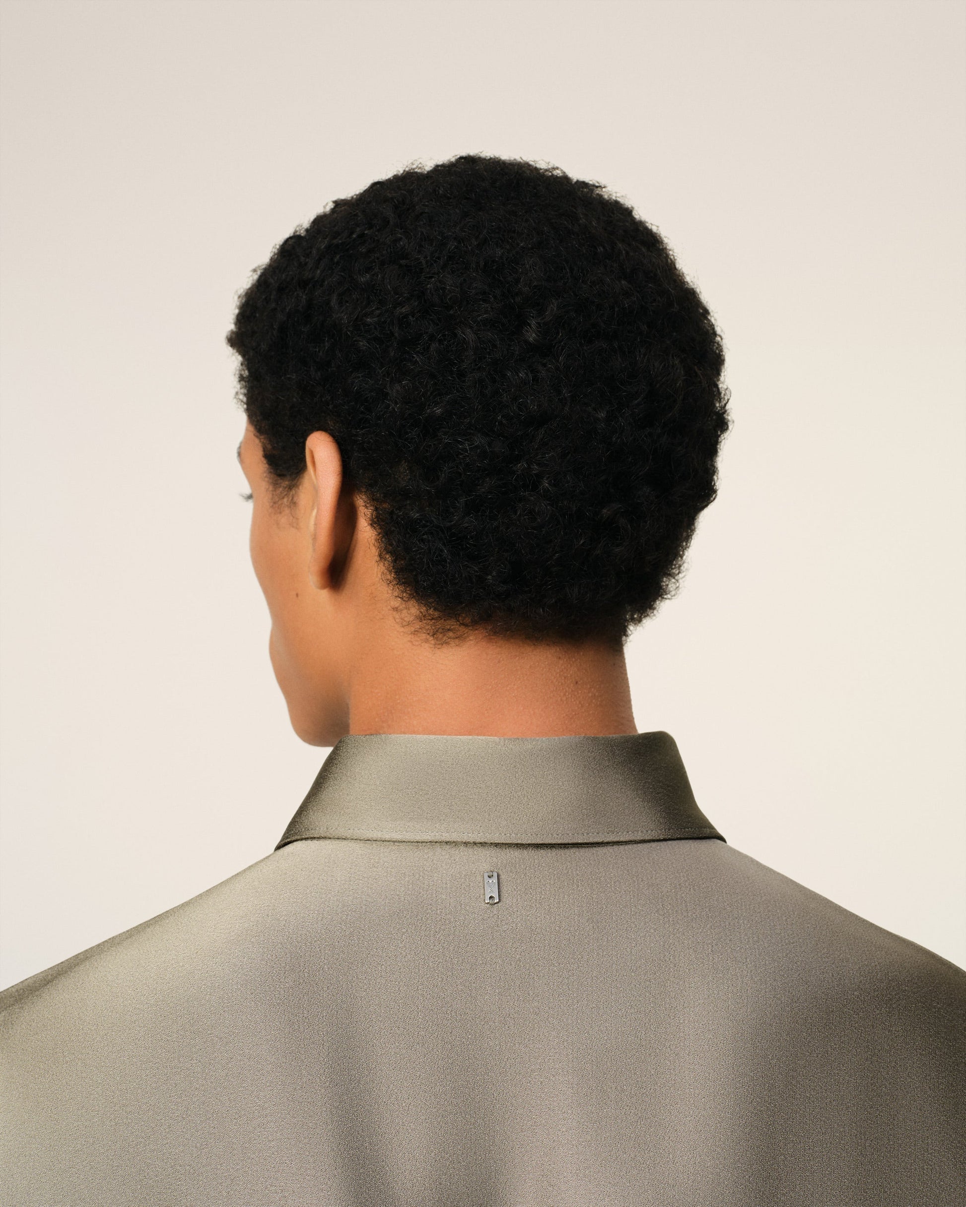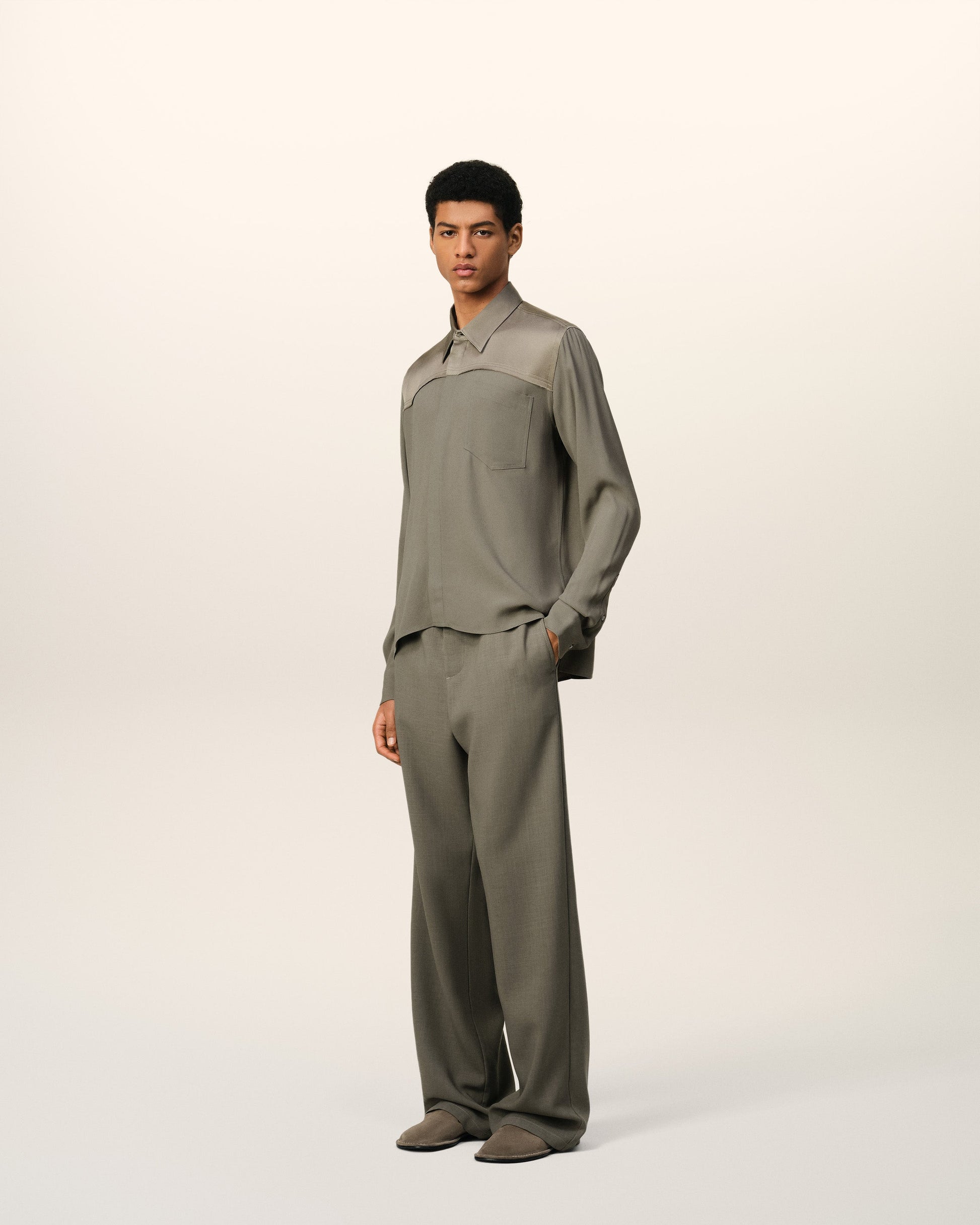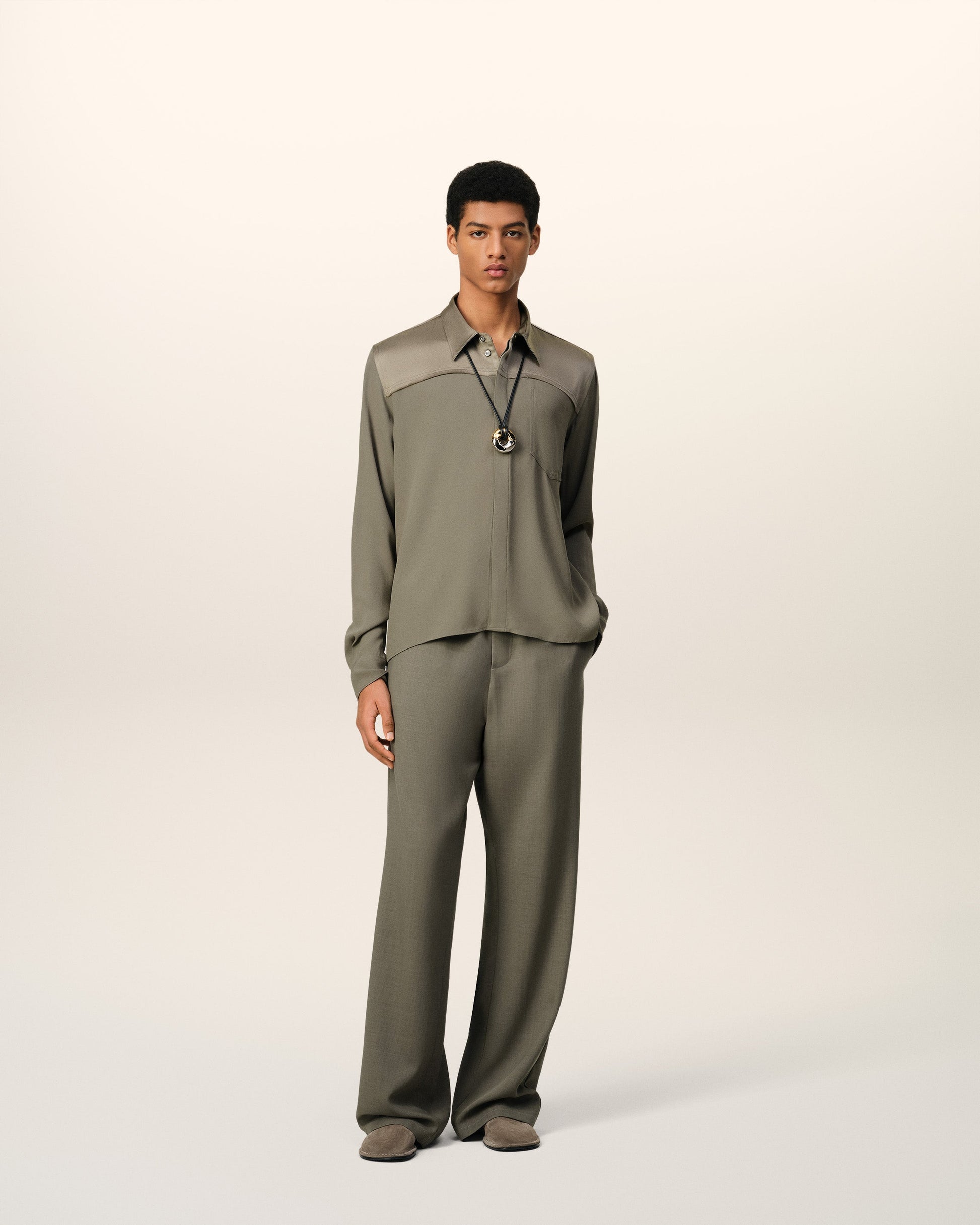 Long sleeve shirt with contrasted top in viscose and acetate crepe with satin back. Classic fit 74 cm center back length (taille 40) Contrast with the shine of the fabric Mini Ami de Coeur engraved metal plate under collar Classic collar Chest patch pocket Hidden tab and cuffs buttoned Metal buttons Made in Portugal (with love) REF: HSH020.AC0014.0952