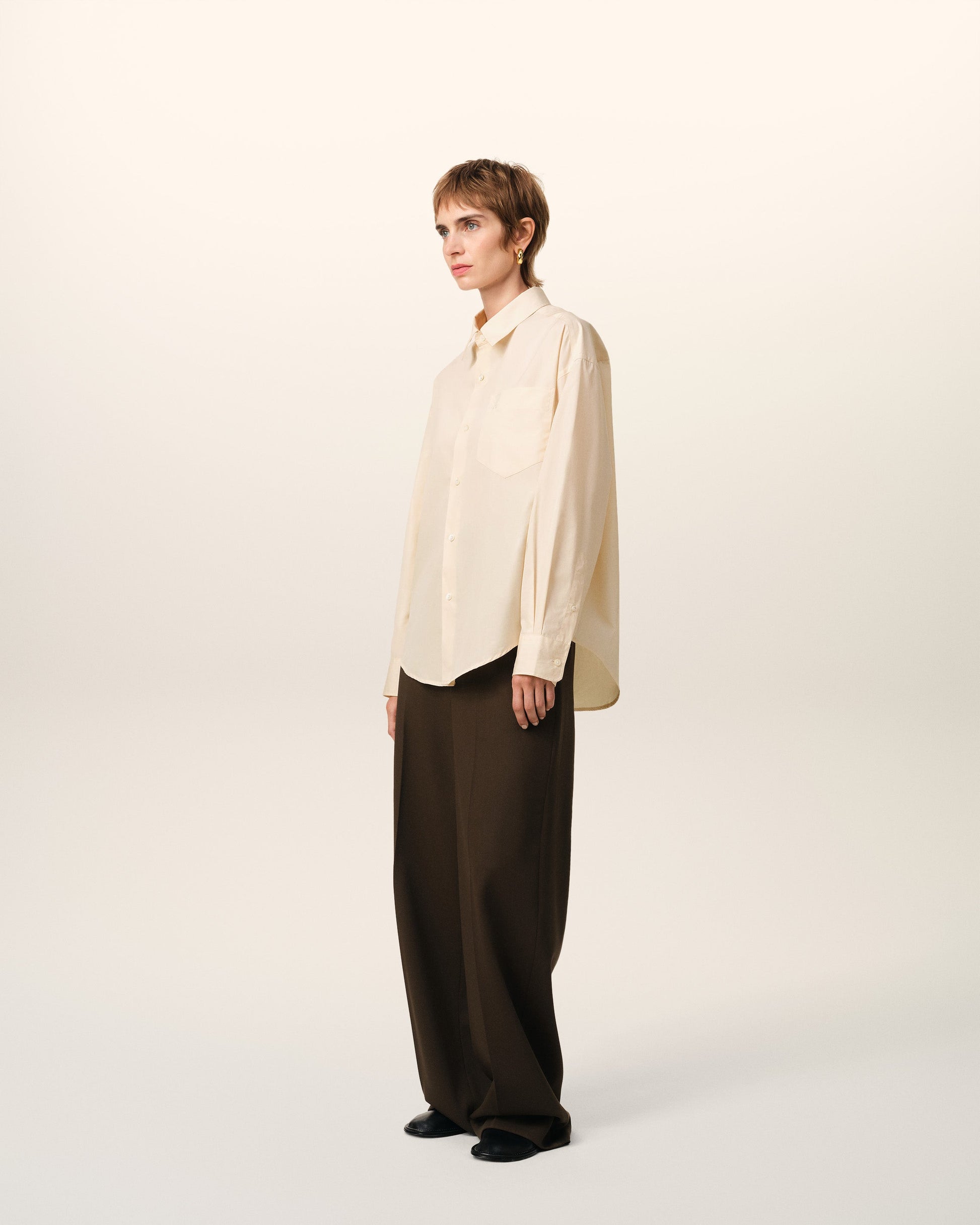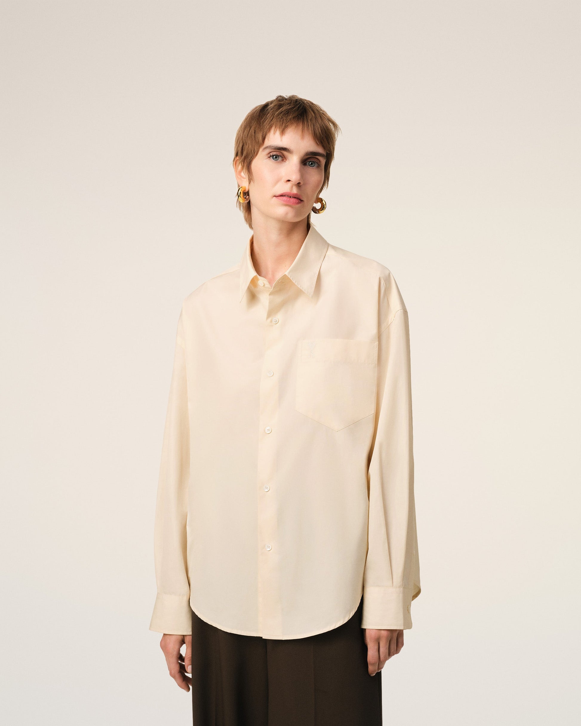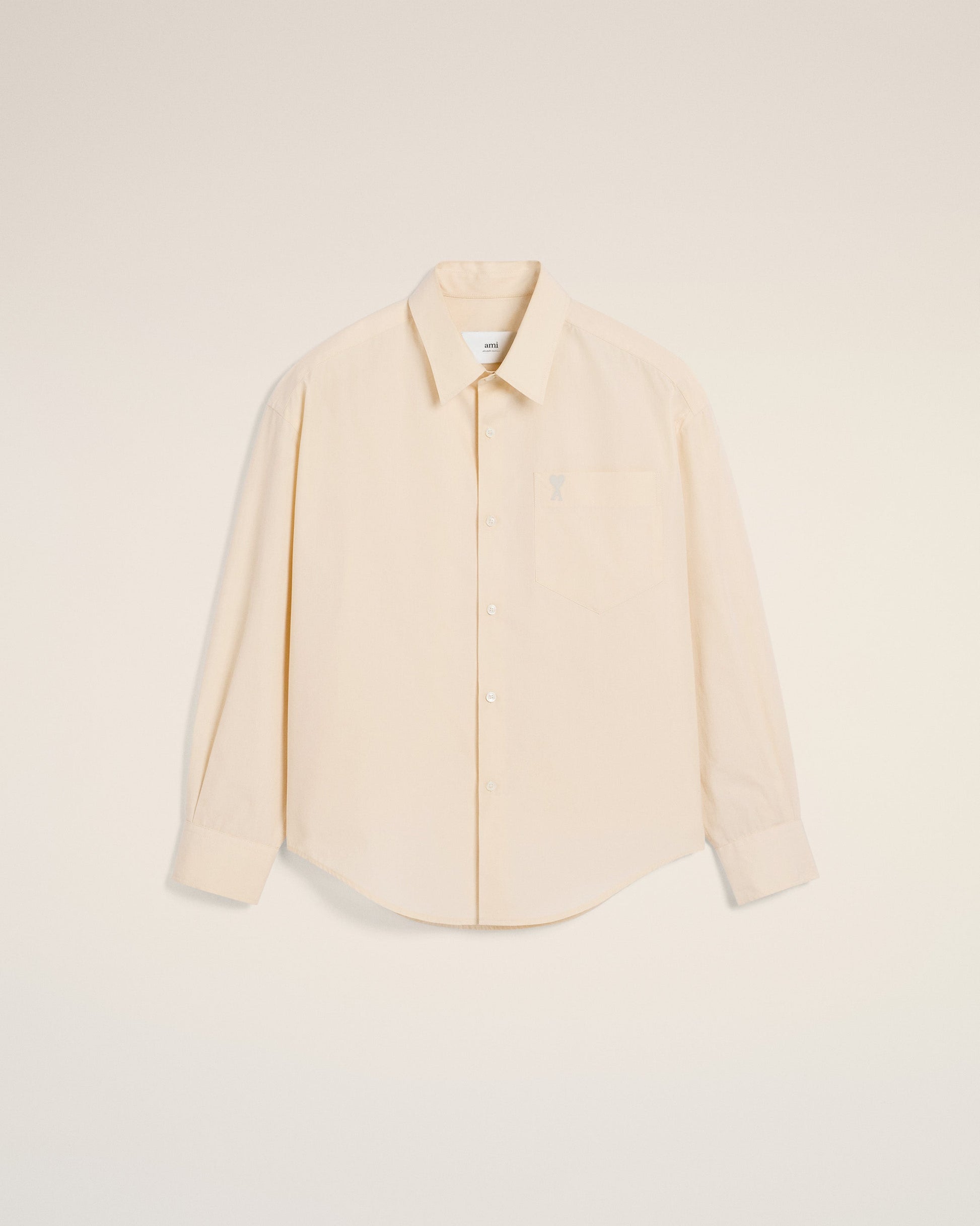 Tonal Ami de Coeur boxy shirt in cotton poplin. Boxy fit Unisex product 75 cm center back length (size XS) 78 cm center back length (size M) Classic collar Embossed and topstitched Ami de Coeur on pocket Patch pocket Buttoned tab on front and cuffs Mother-of-pearl buttons Made in Portugal (with love) REF: USH145.CO0076.136
