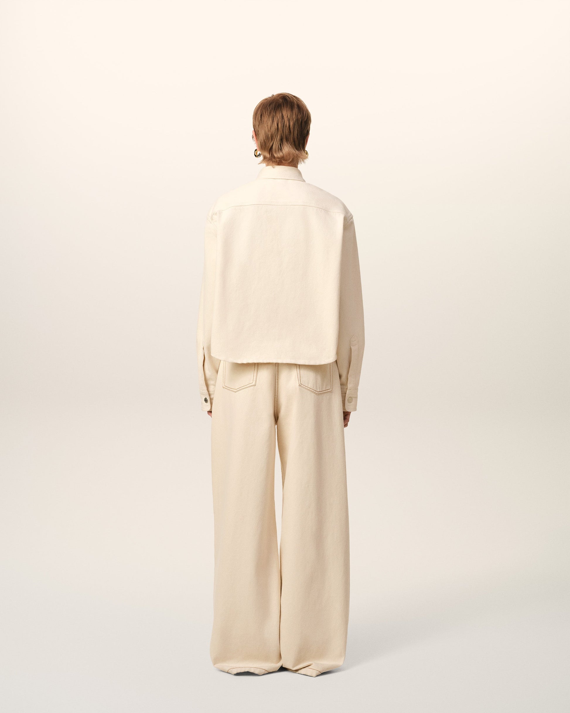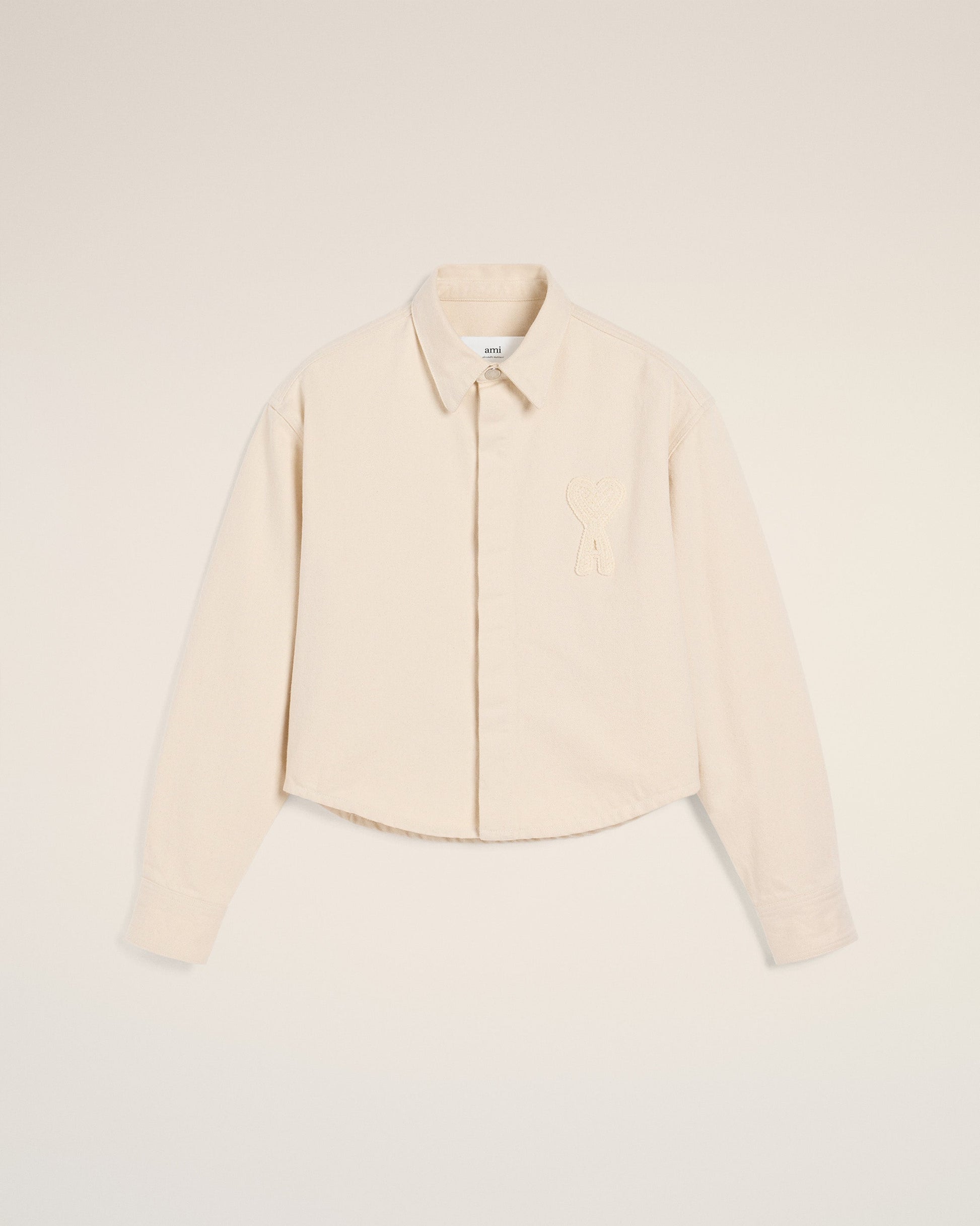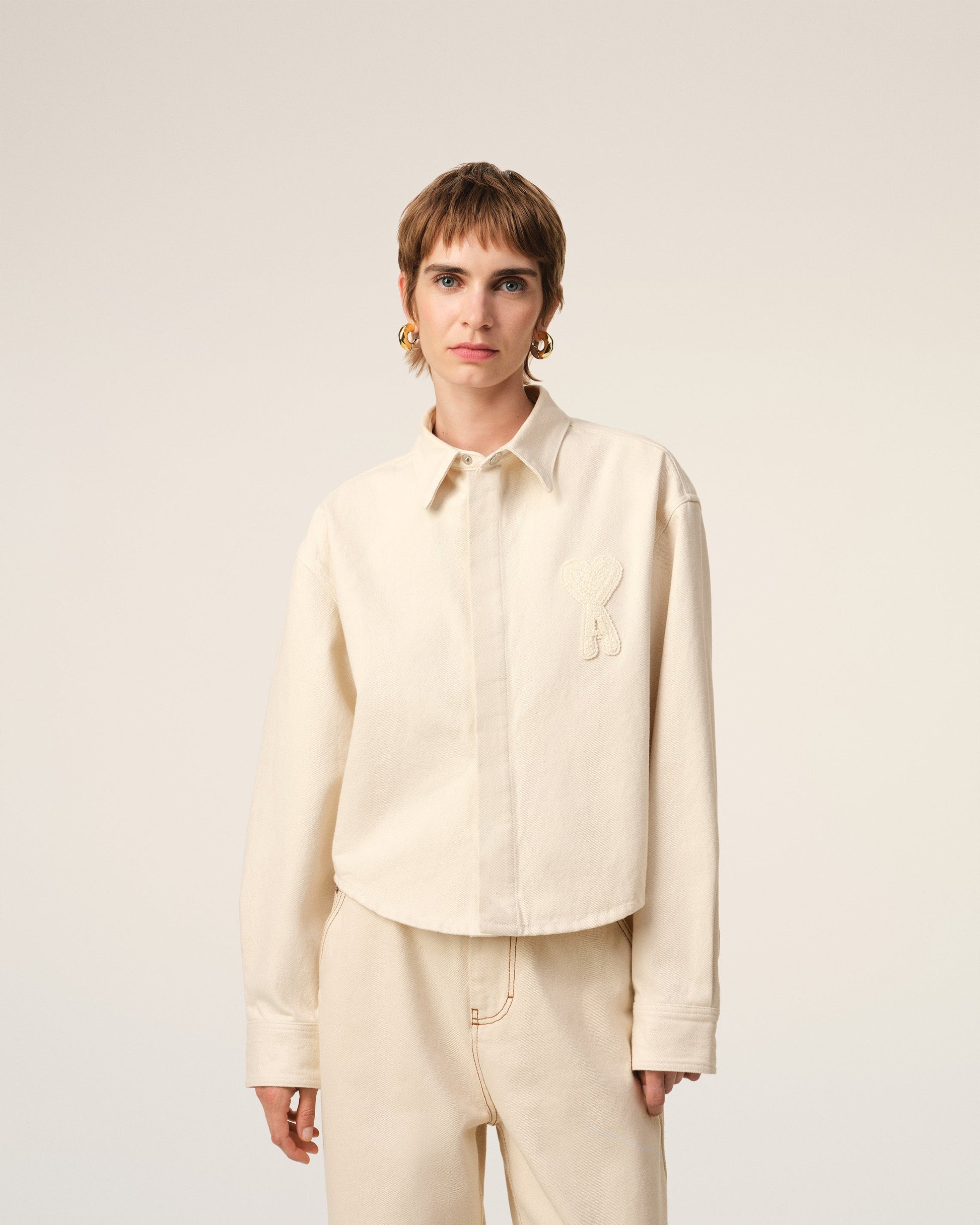 Cropped shirt in colored cotton twill. Cropped fit 60 cm center back length (size S) Tonal Ami de Coeur knitted patch embroidered on the chest Denim snap buttons in nickel color Tobacco topstitches Made in Portugal (with love) REF: FSH168.DE0039.136