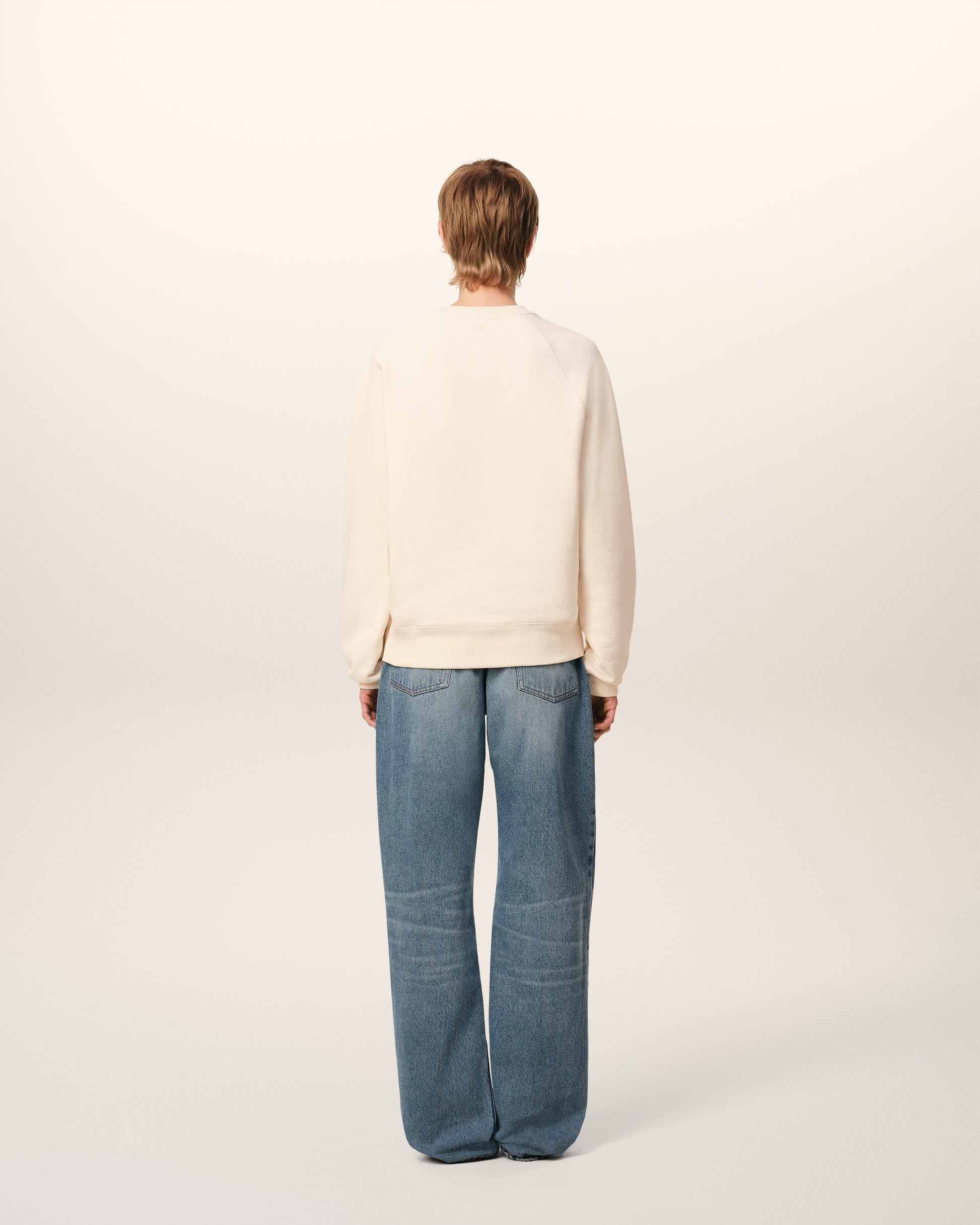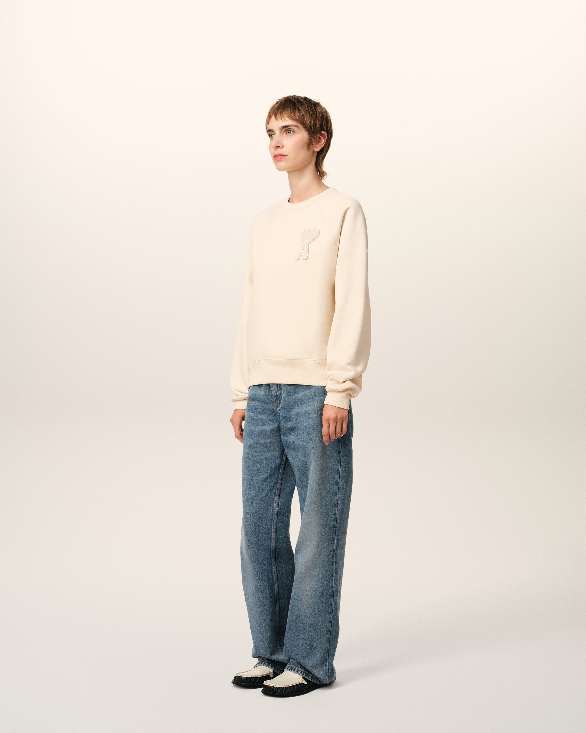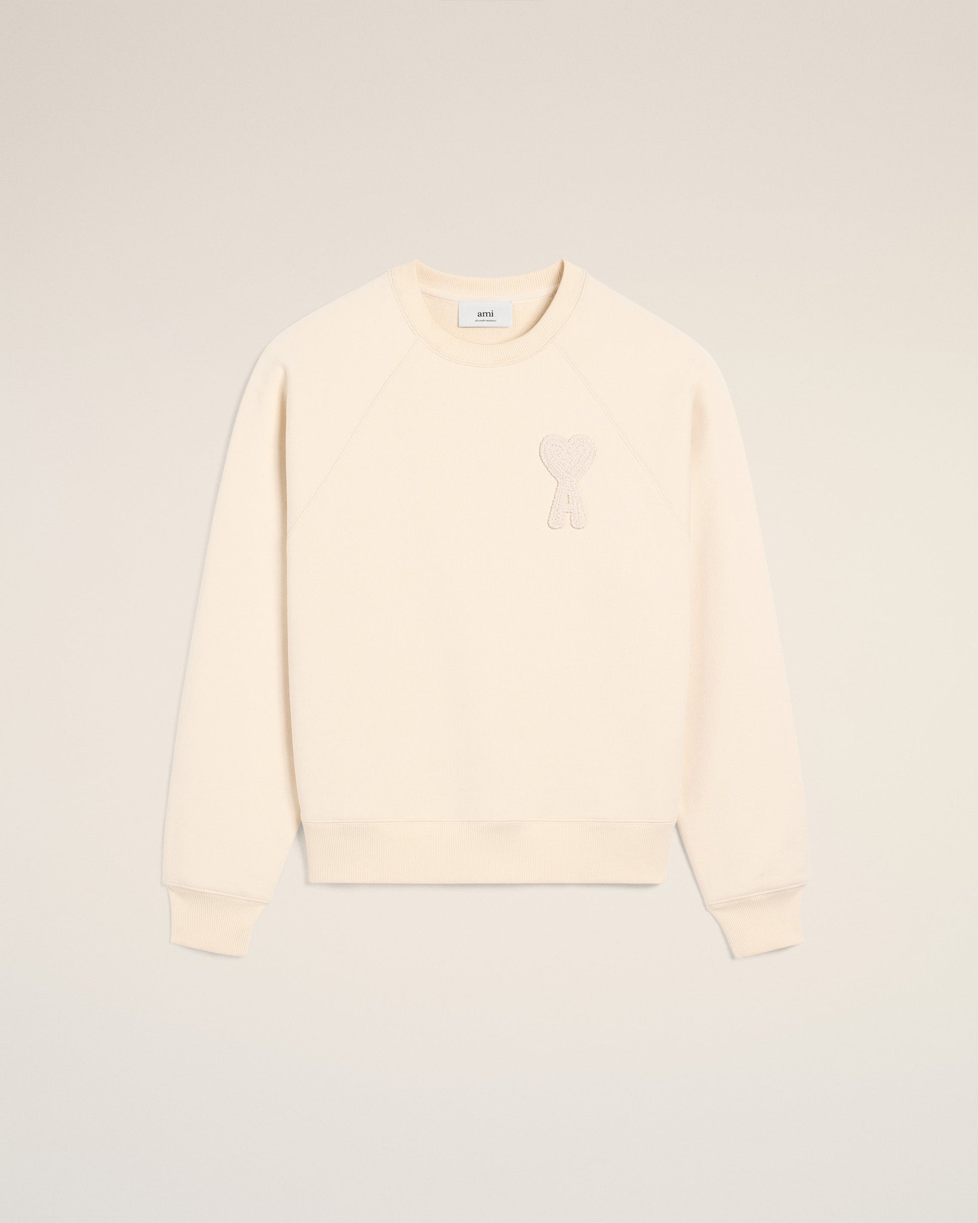 Ami de Coeur sweatshirt in heavy loopback organic cotton fleece. Boxy fit Unisex product 61 cm center back length (XS size) 65 cm center back length (M size) Tonal Ami de Coeur knitted patch Tonal "AMI" embroidery under back neckline Raglan sleeves Made in Portugal (with love) REF: USW055.747.136