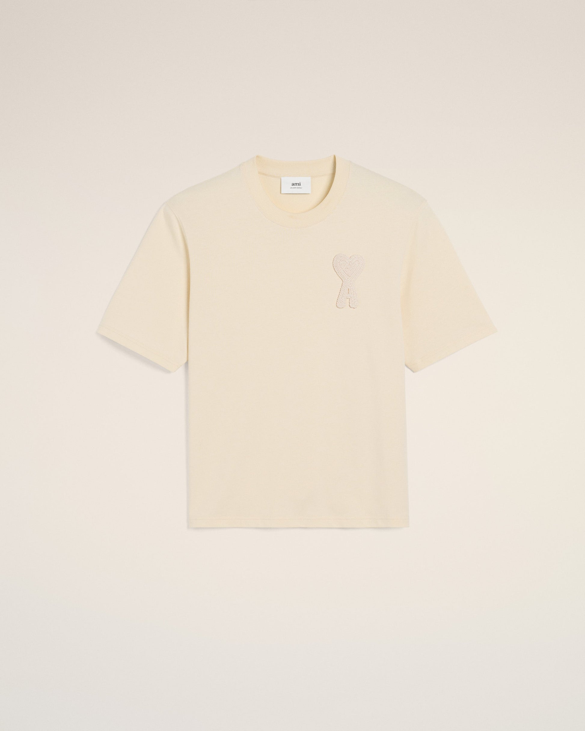 Ami de Coeur t-shirt in organic cotton jersey. Boxy fit 70 cm center back length (size M) Tonal Ami de Coeur knitted patch Tonal "AMI" embroidery under back neckline Made in Portugal (with love) REF: HTS055.726.136