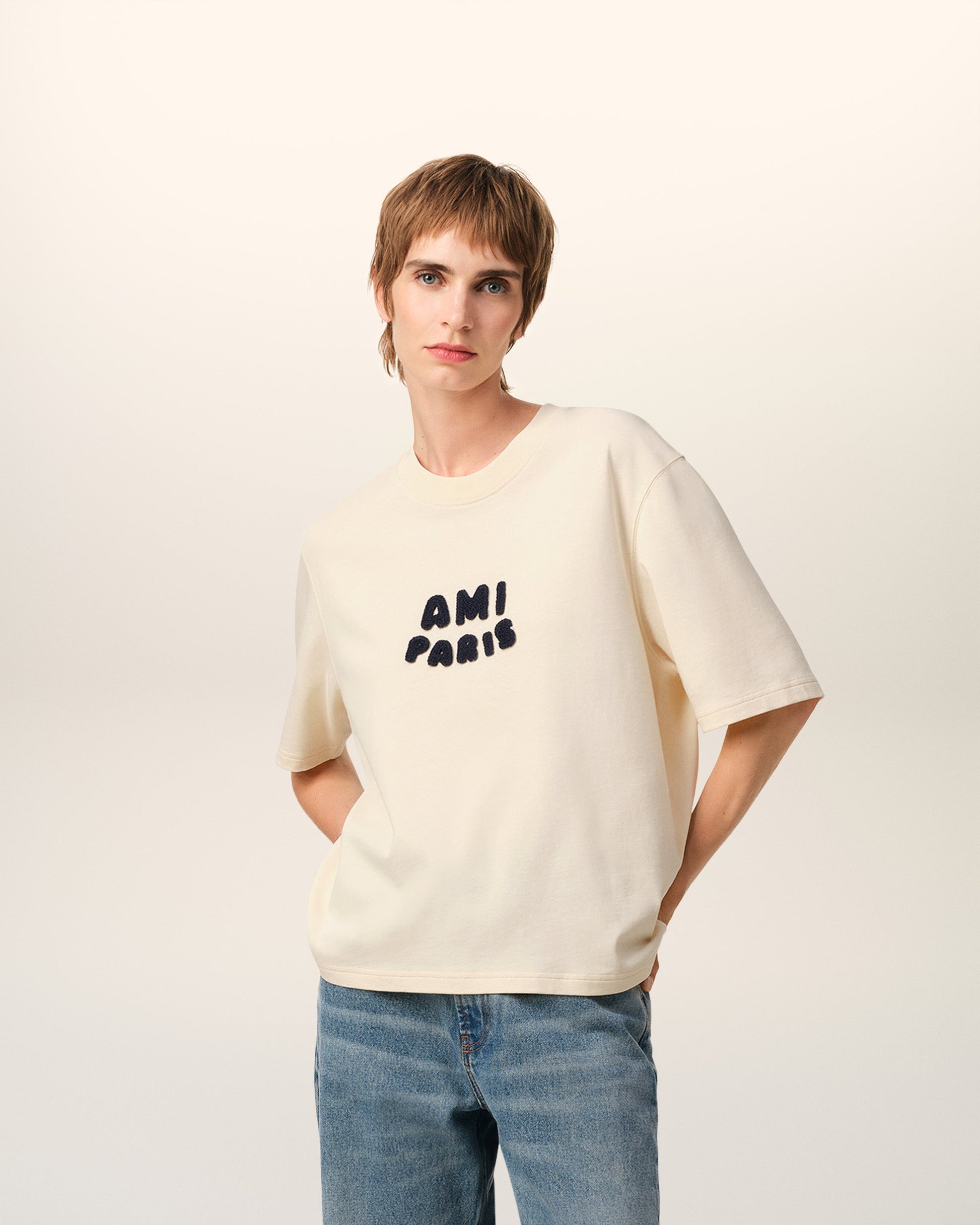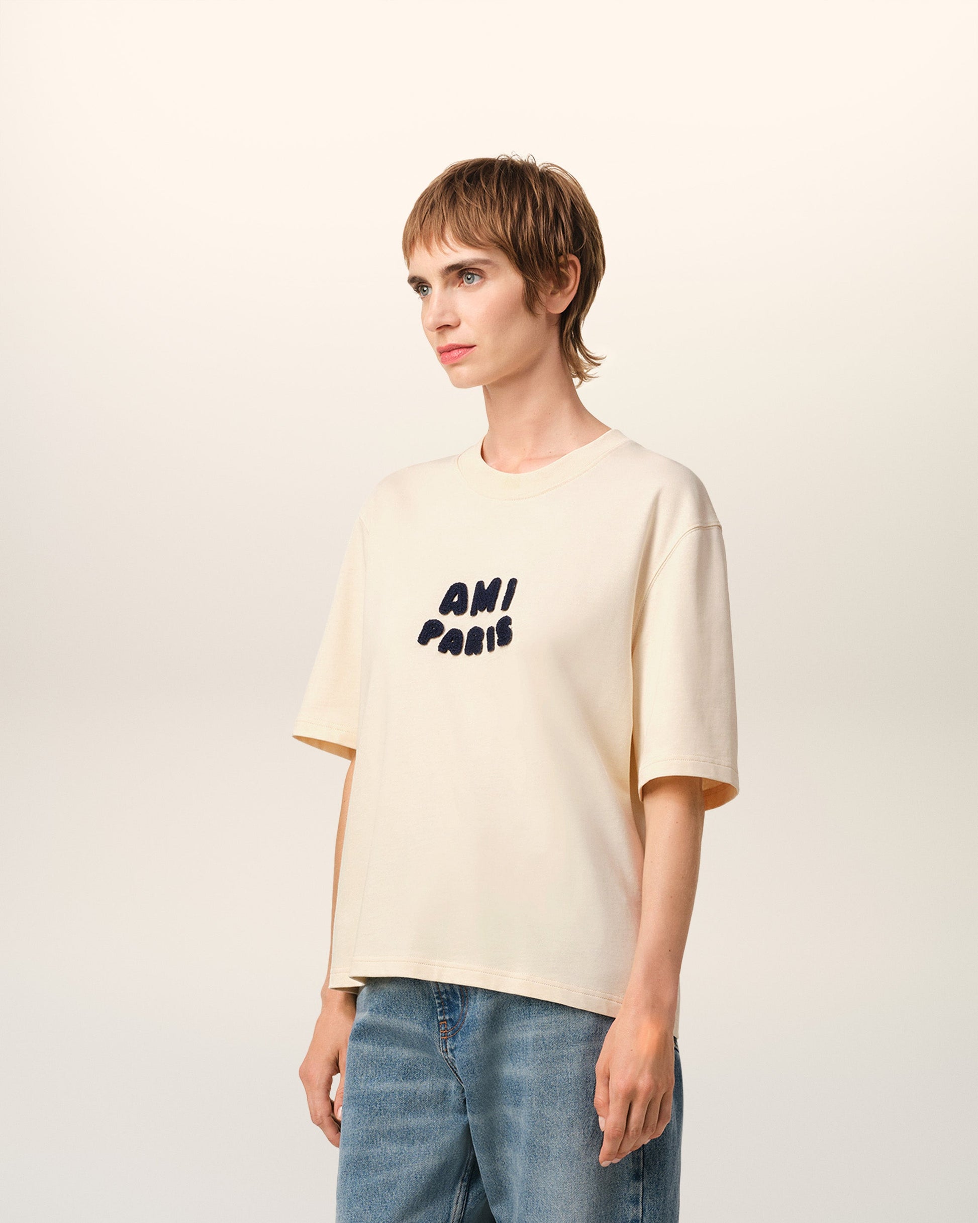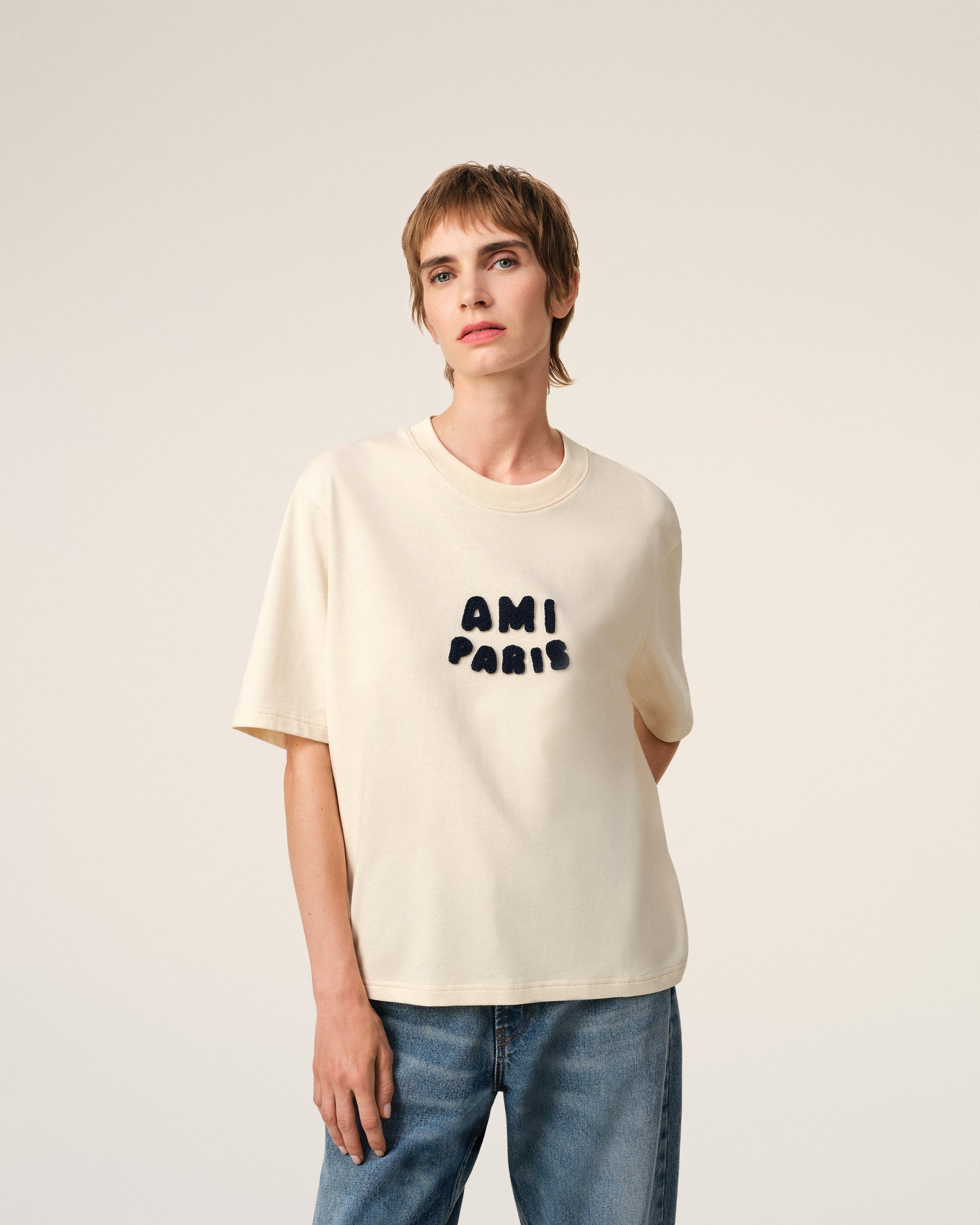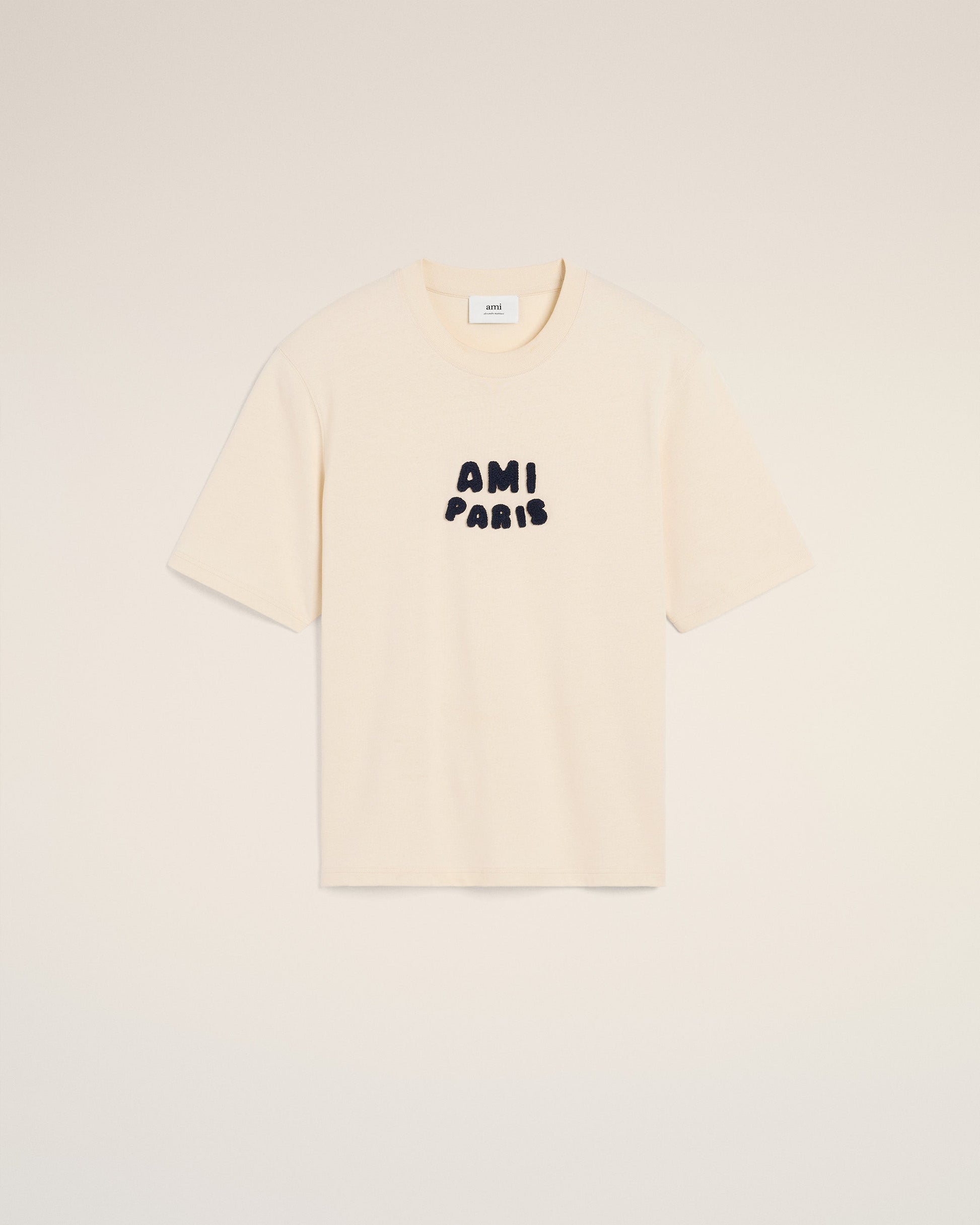 Ami Paris t-shirt in organic cotton jersey. Boxy fit Unisex product 62 cm center back length (size XS) 70 cm center back length (size M) Ami Paris knitted patch Tonal "AMI" embroidery under back neckline Made in Portugal (with love) REF: UTS075.726.136