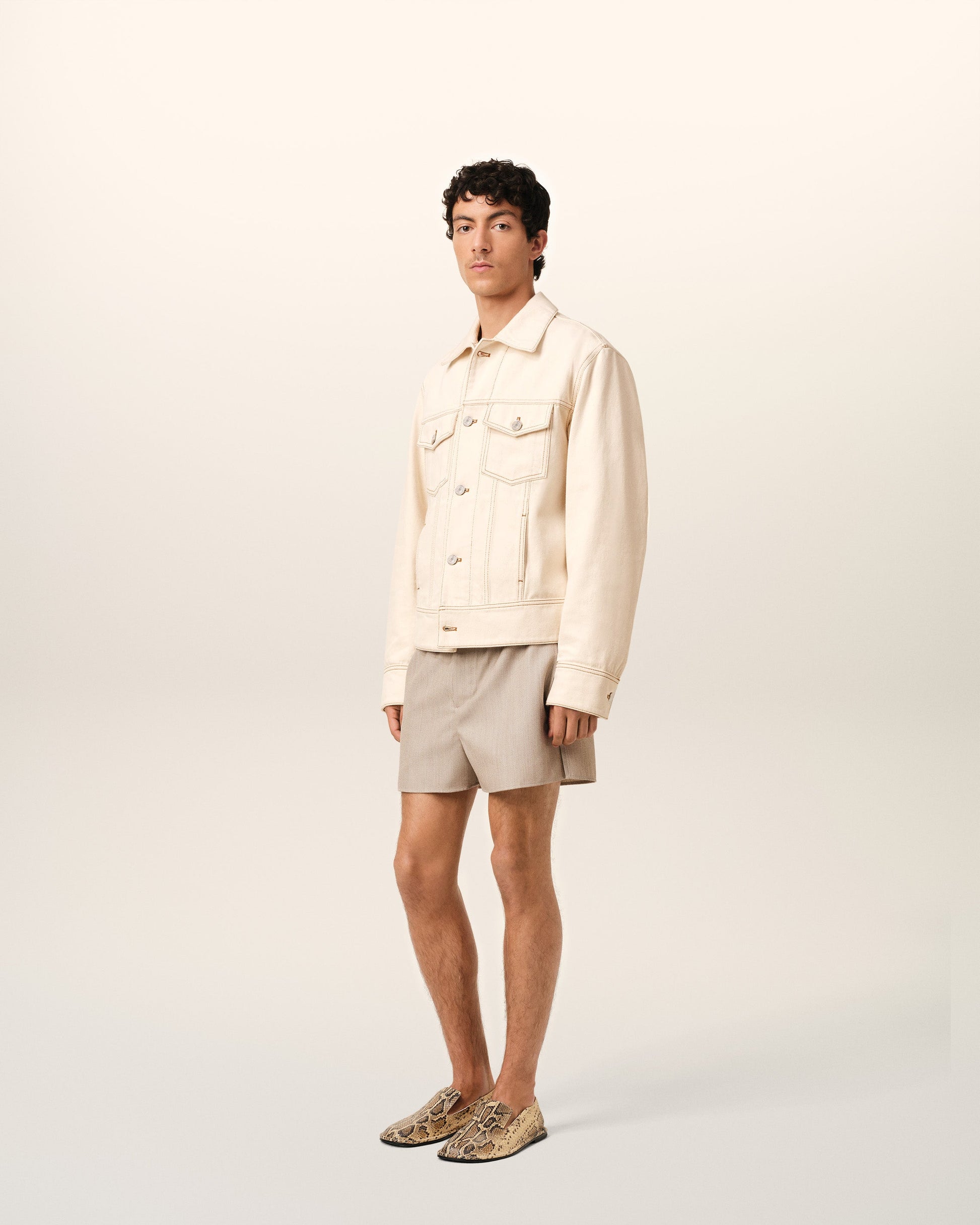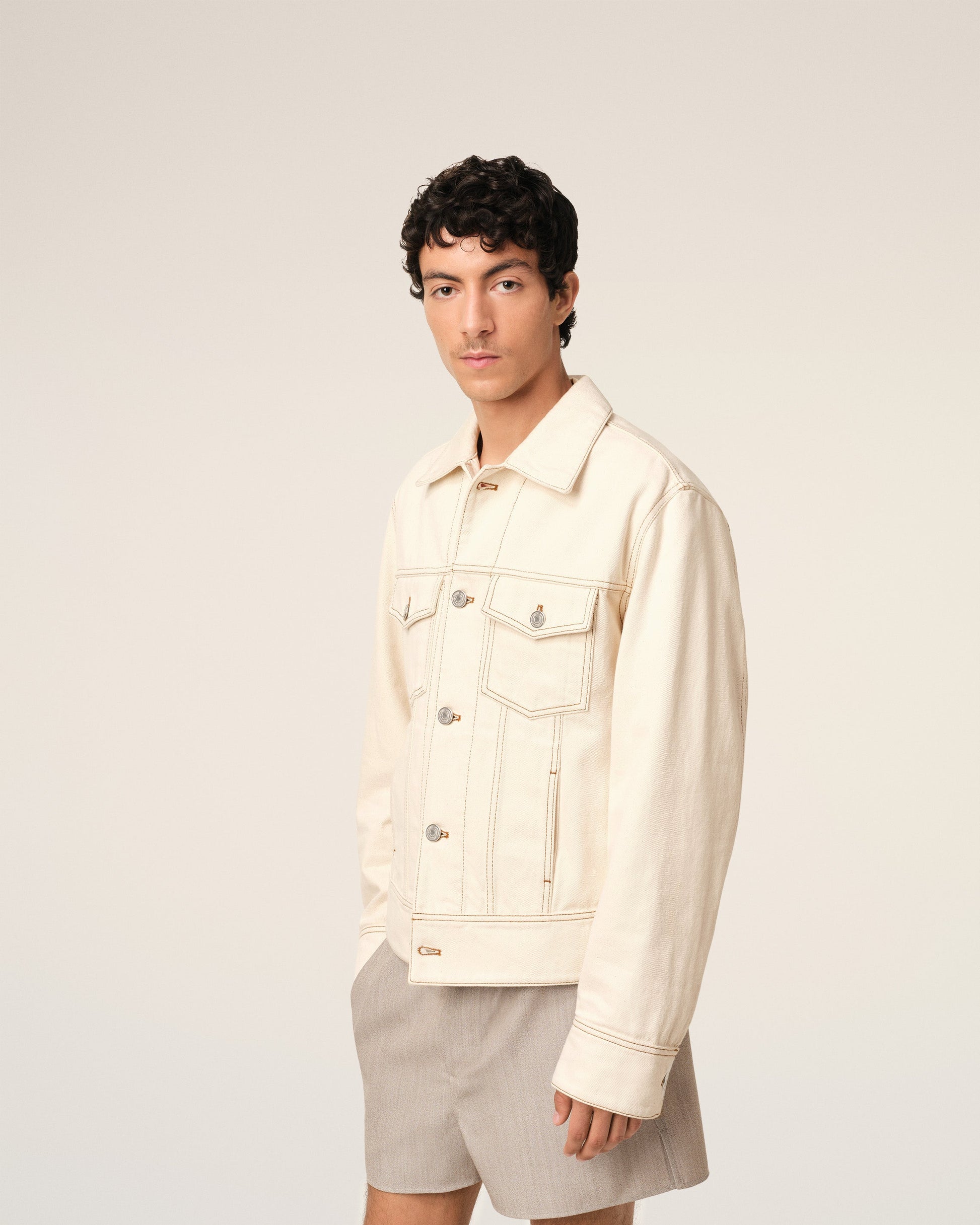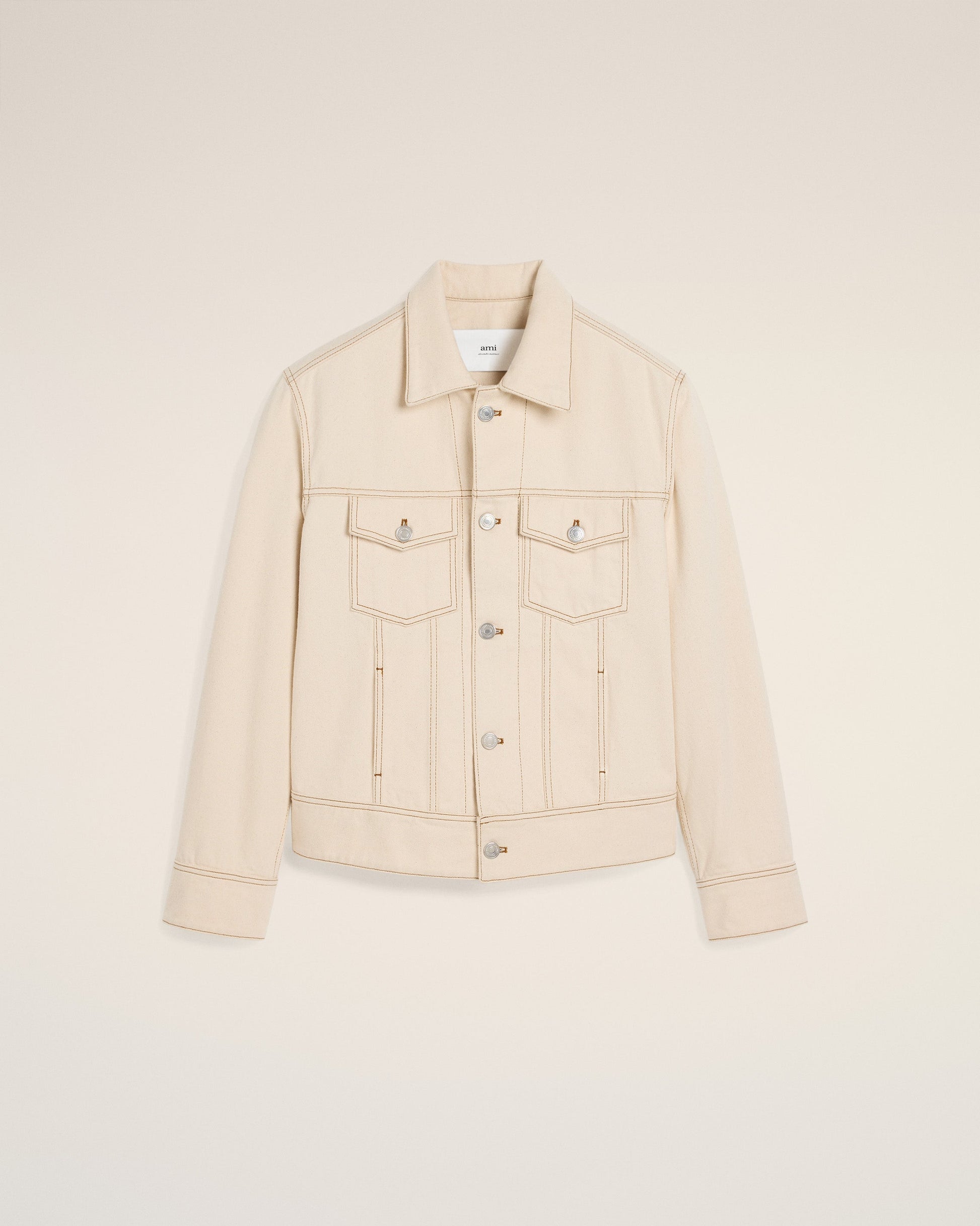Trucker jacket in colored cotton twill. Classic fit 57 cm center back length (size M) Flap pockets with denim buttons in nickel color Front closure and cuffs with denim buttons in nickel color Body bottom belt with denim buttons on the back in nickel color Denim rivet in nickel color at the cuffs "ami alexandre mattiussi" patch on the back "AMI Paris" knitted patch embroidered on the back Tobacco topstitches Made in Tunisia (with love) REF: HJK247.DE0039.136