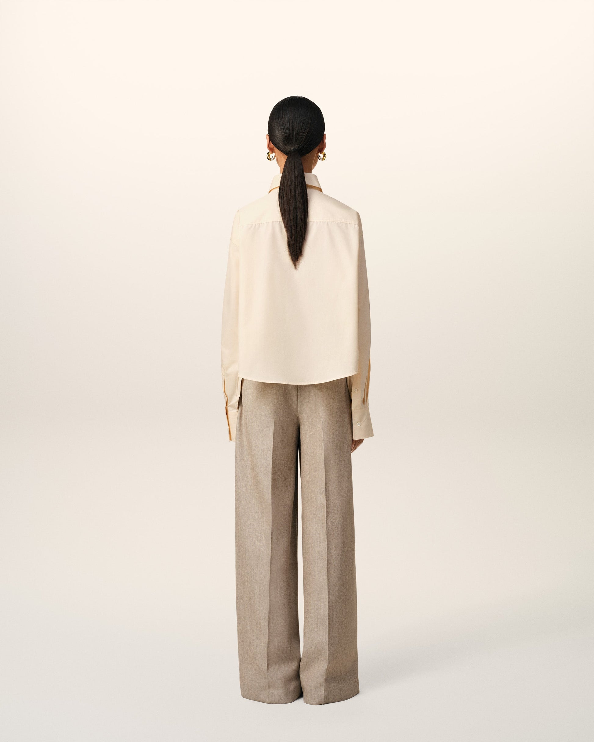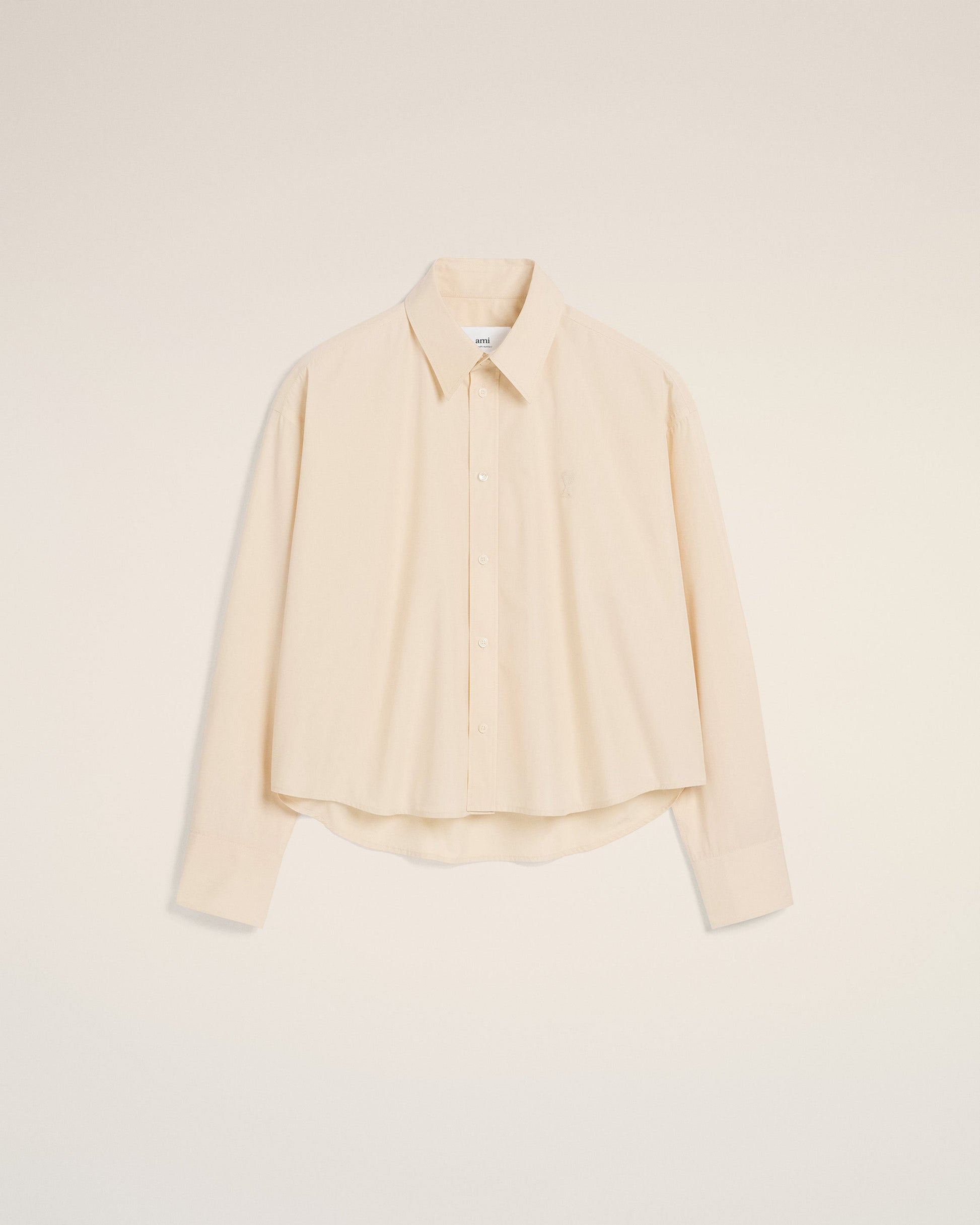 Cropped shirt in cotton poplin. Cropped oversized fit Unisex product 58 cm center back length (size XS) 66 cm center back length (size M) Tonal Ami de Coeur embroidery on the chest Classic collar Buttoned tab on front and cuffs Mother-of-pearl buttons Made in Poland (with love) REF: USH120.CO0076.136
