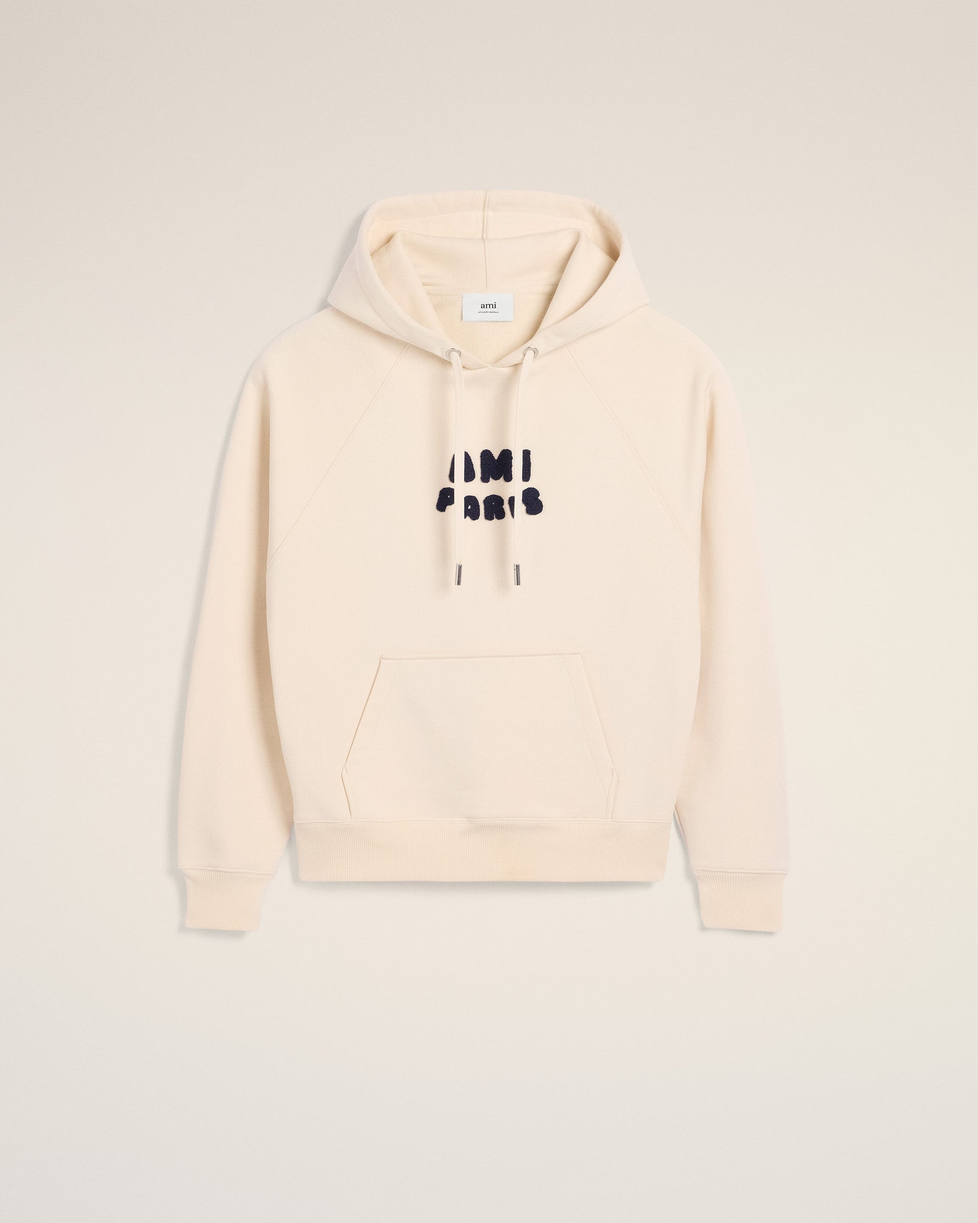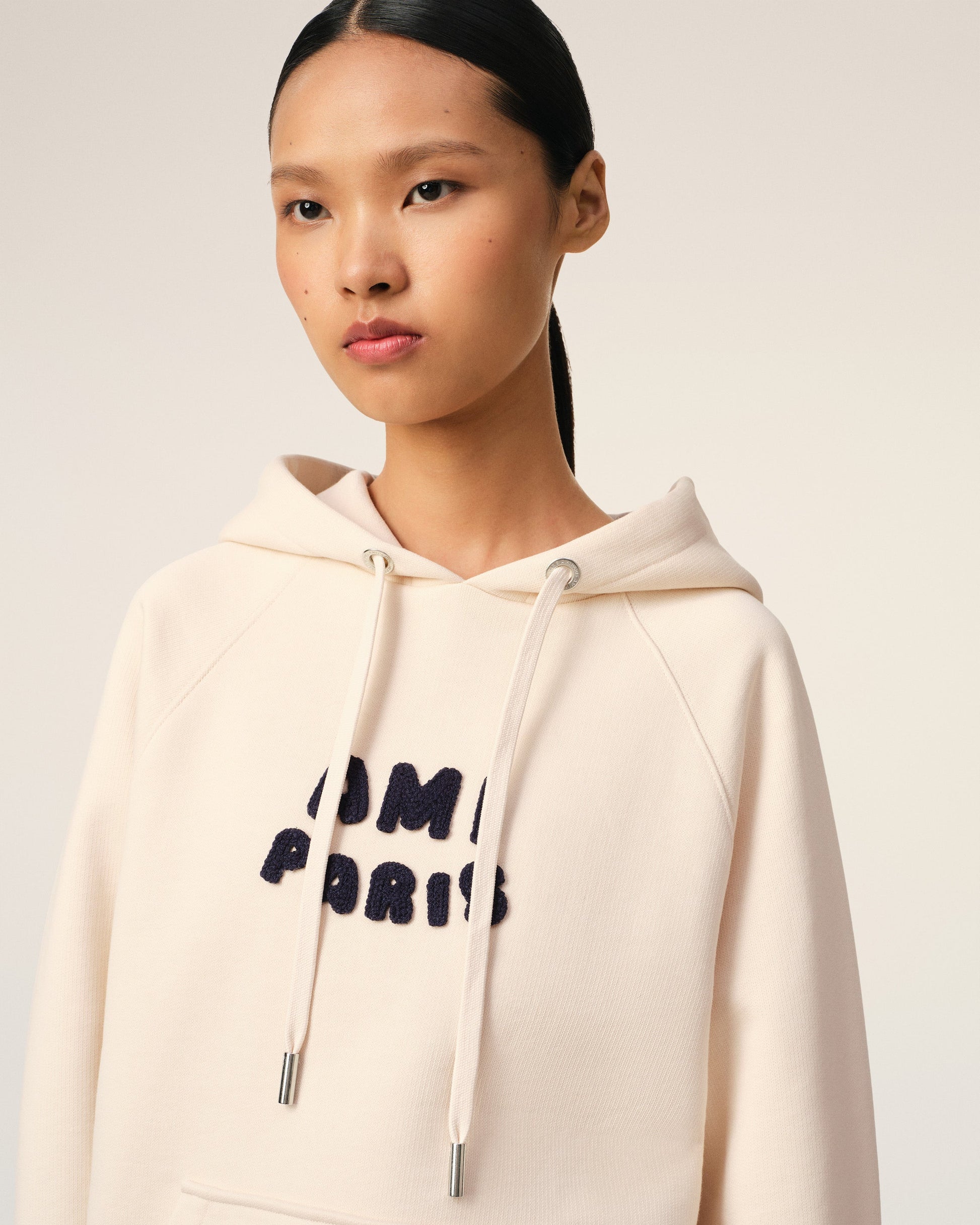 Ami Paris hoodie in heavy loopback organic cotton fleece. Boxy fit Unisex product 61 cm center back length (XS size) 65 cm center back length (M size) "Ami Paris" knitted patch Tonal "AMI" embroidery on the back Raglan sleeves Nickel color metal ends and "ami" engraved eyelets Made in Portugal (with love) REF: USW275.747.136