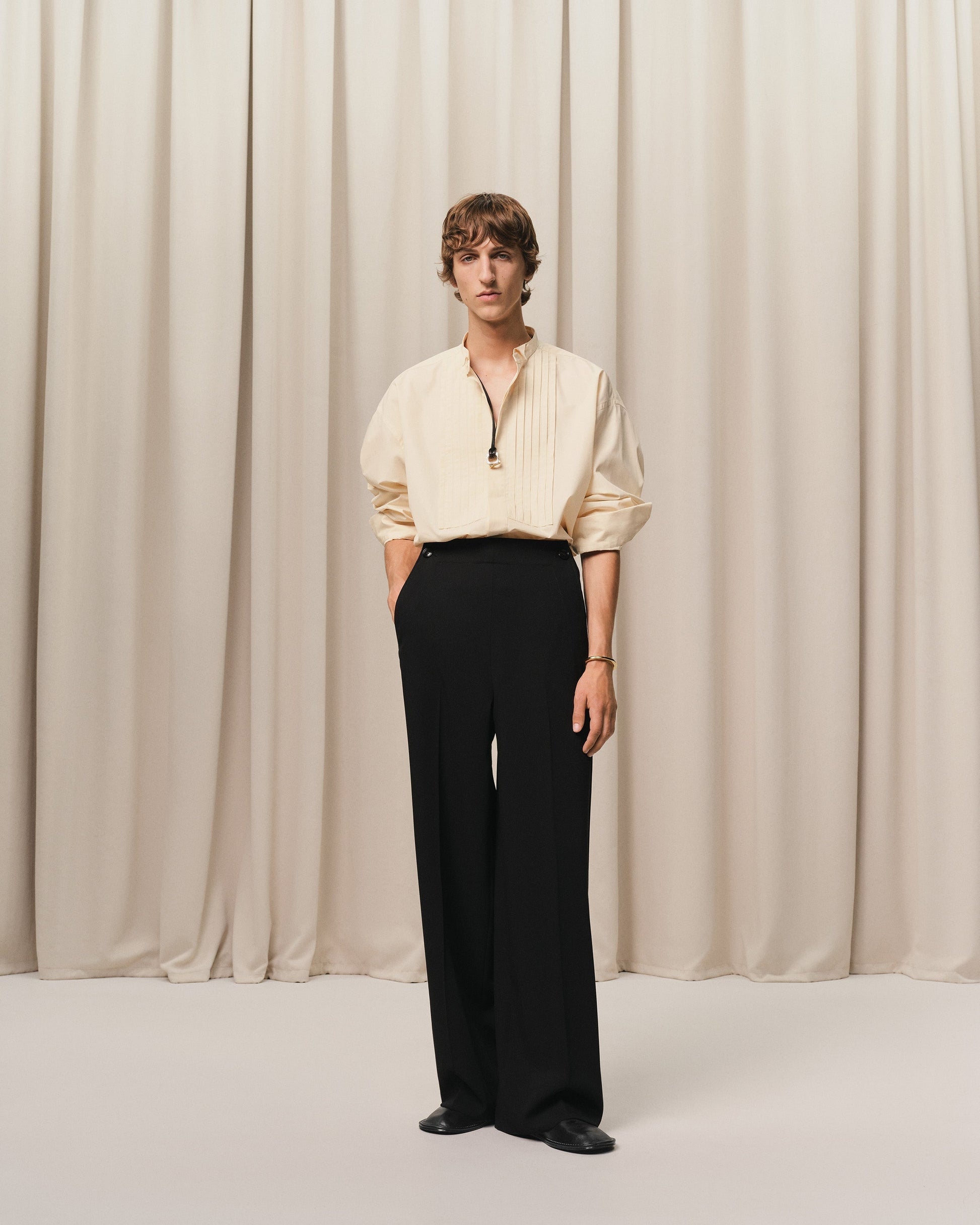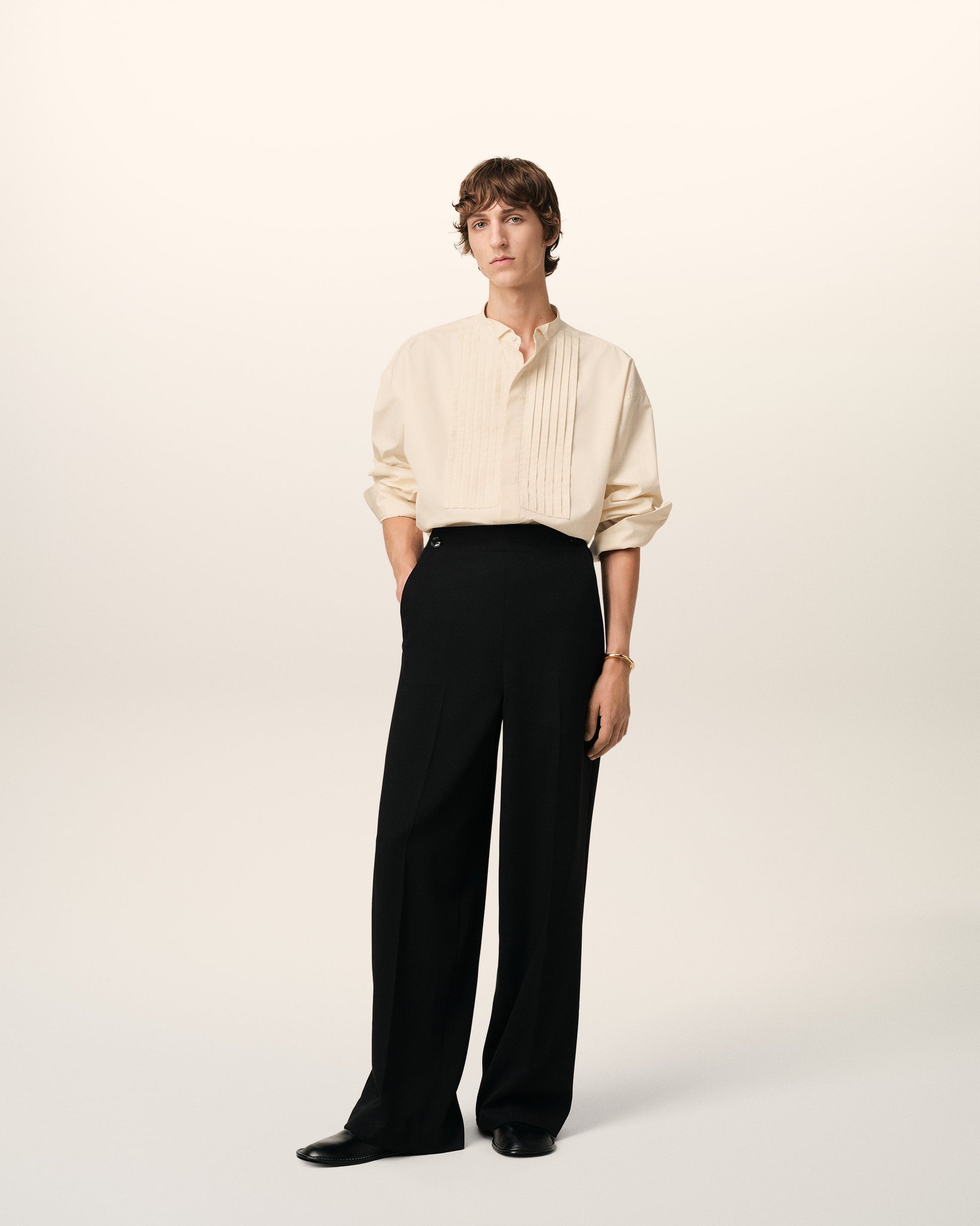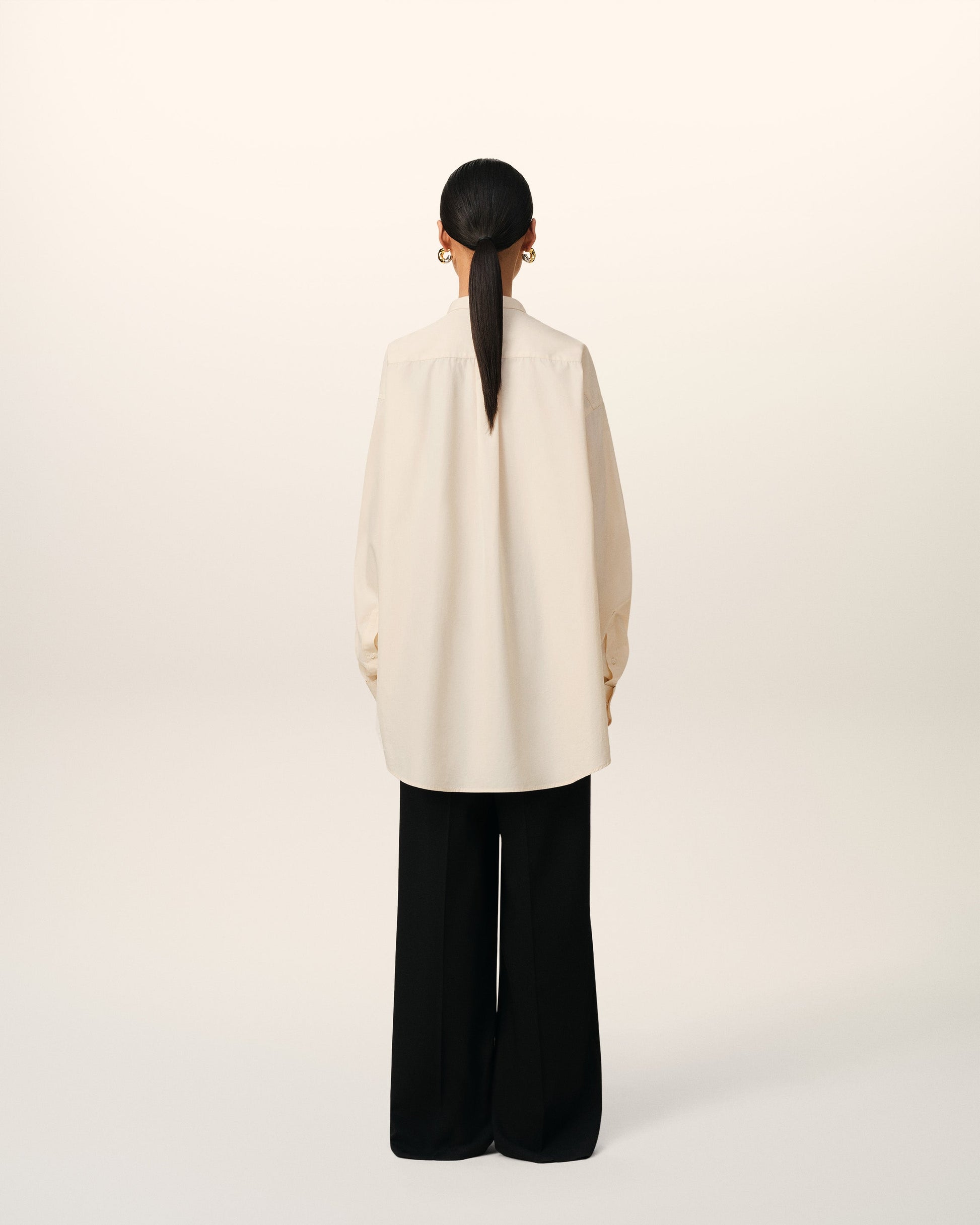 Shirt with pleated bib in cotton poplin. Oversized fit Unisex product 88 cm center back length (size 36) Pleated bib Wingtip collar Hidden buttoned tab on front French buttonned cuffs Mother-of-pearl buttons Made in Bulgaria (with love) REF: USH180.CO0076.136