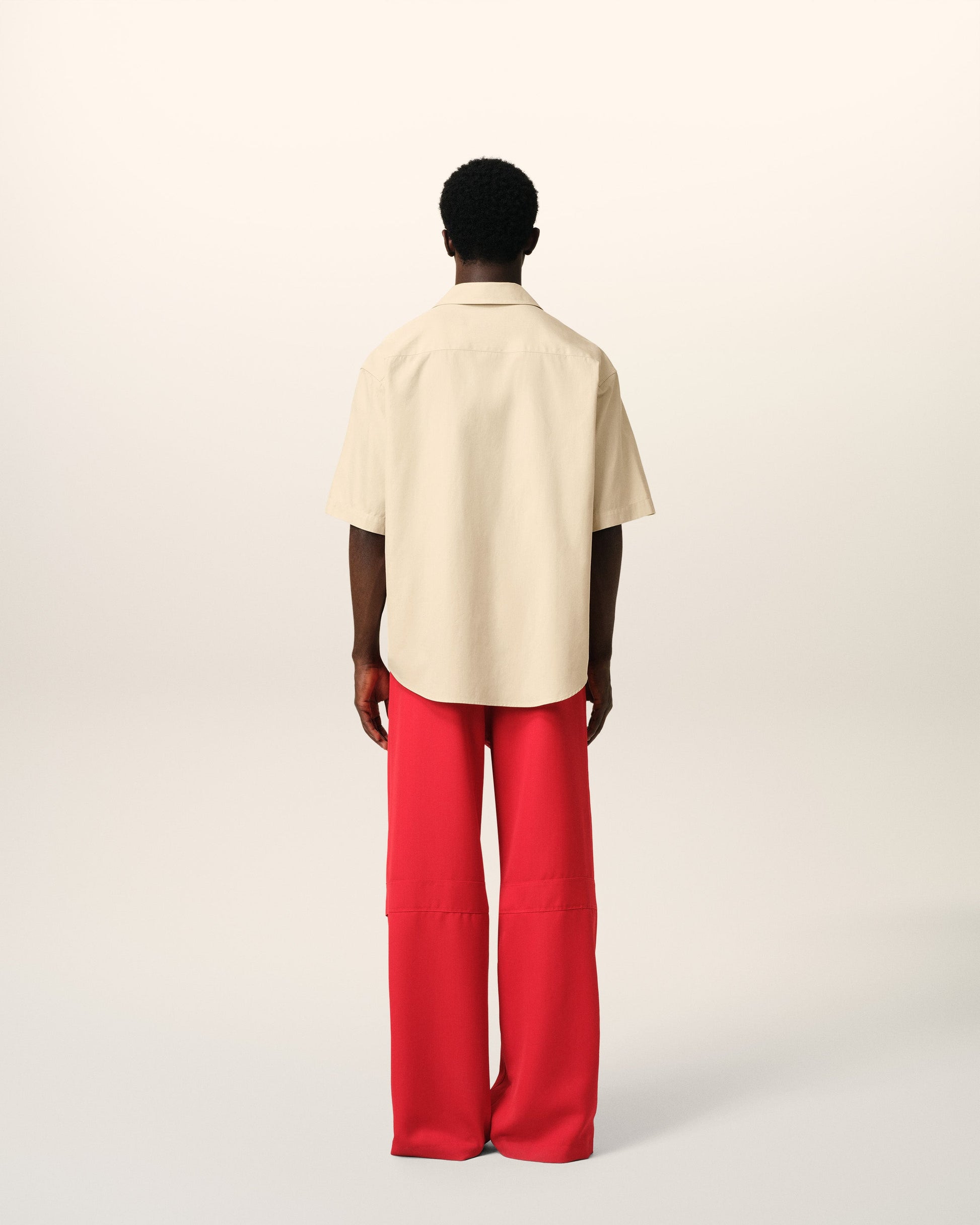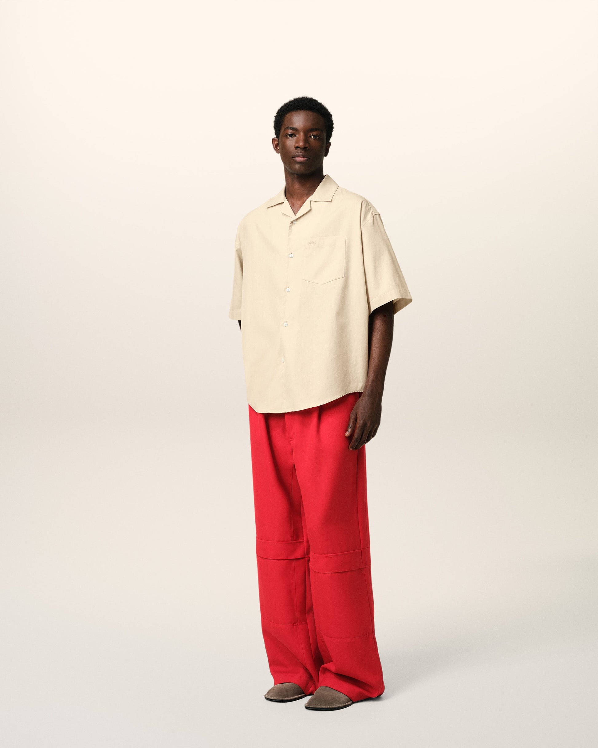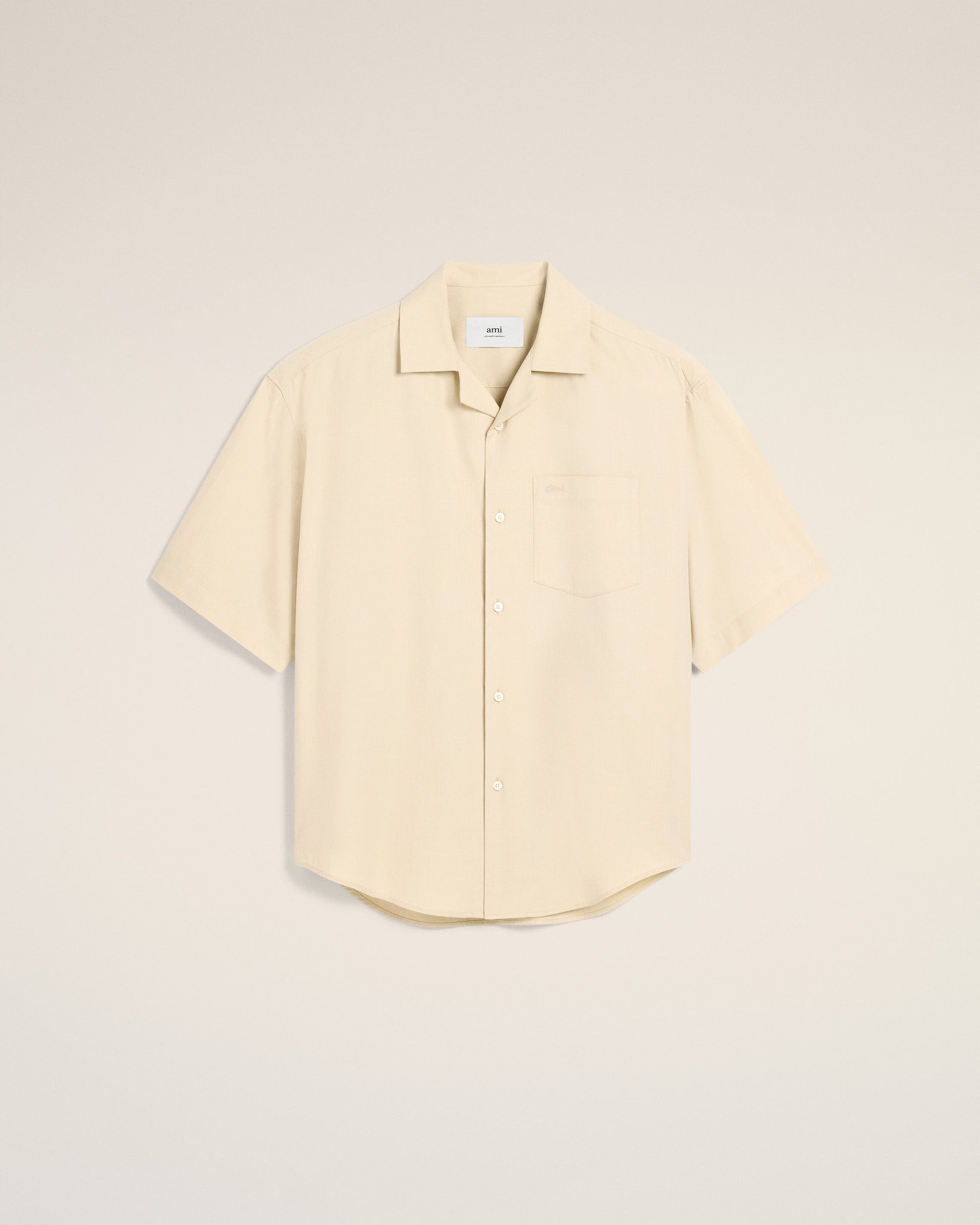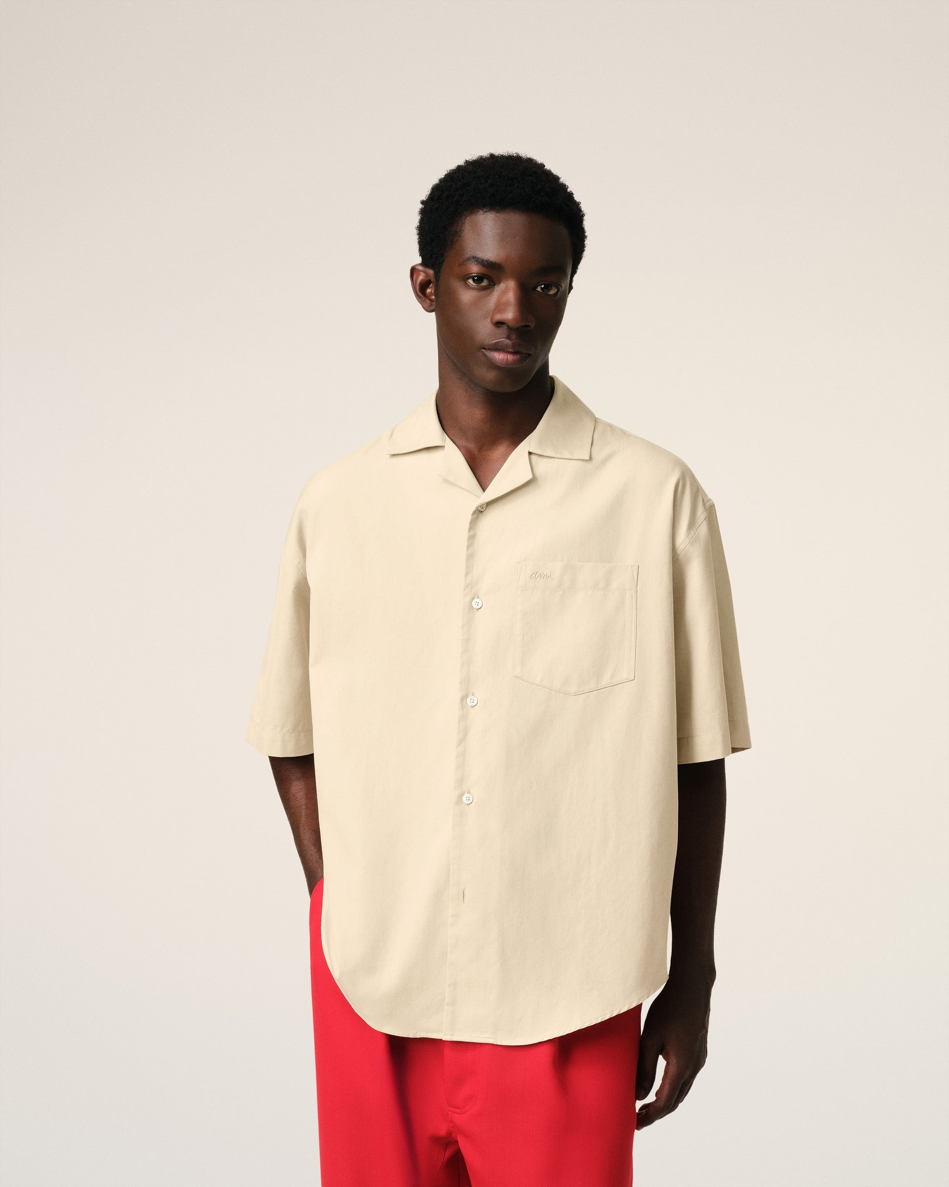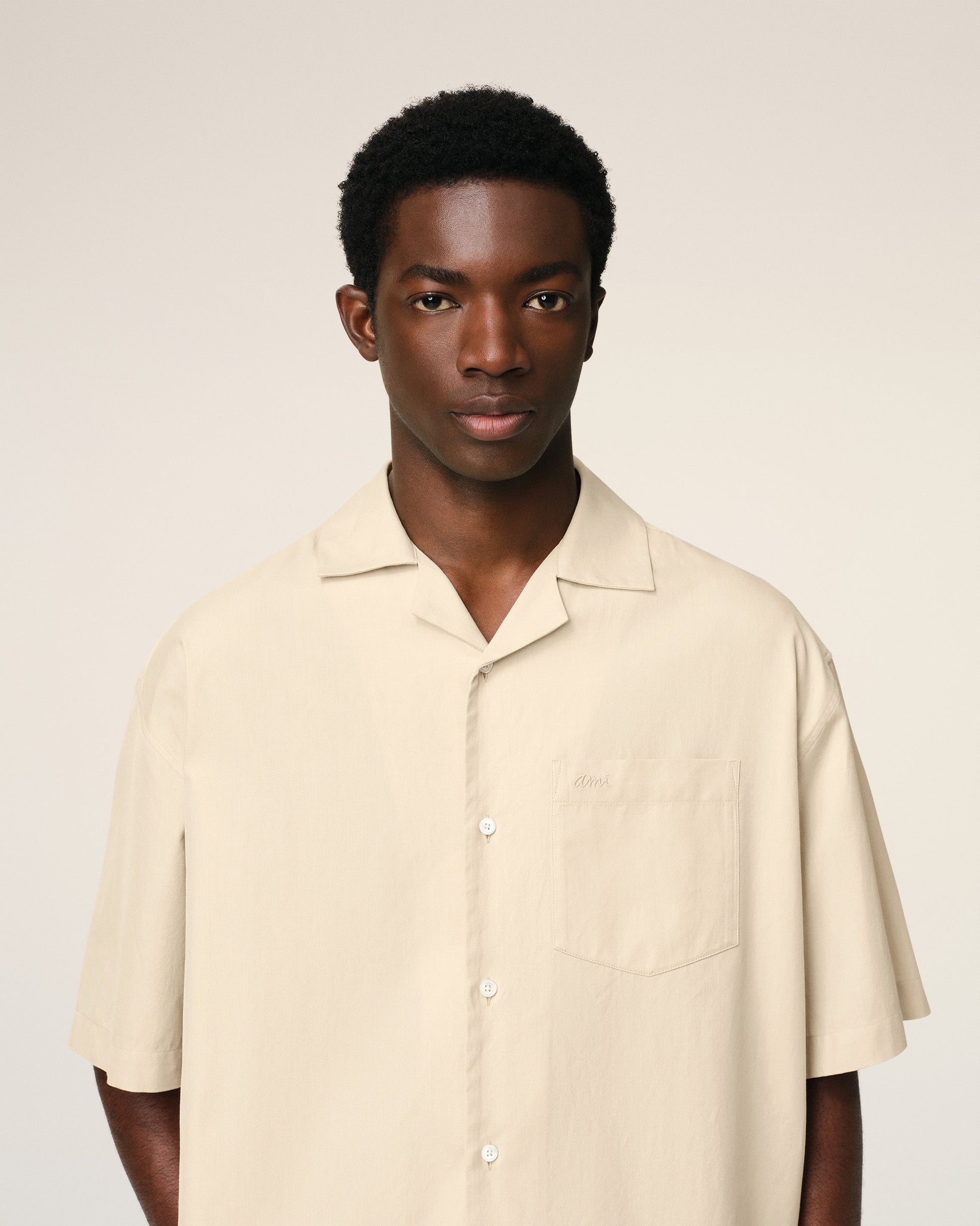 Tonal Ami short sleeves shirt in light cotton gabardine. Boxy fit 78 cm center back length (size 40) Open collar Chest pocket with tonal ami embroidery Mother-of-pearl buttons Made in Portugal (with love) REF: HSH236.CO0099.725