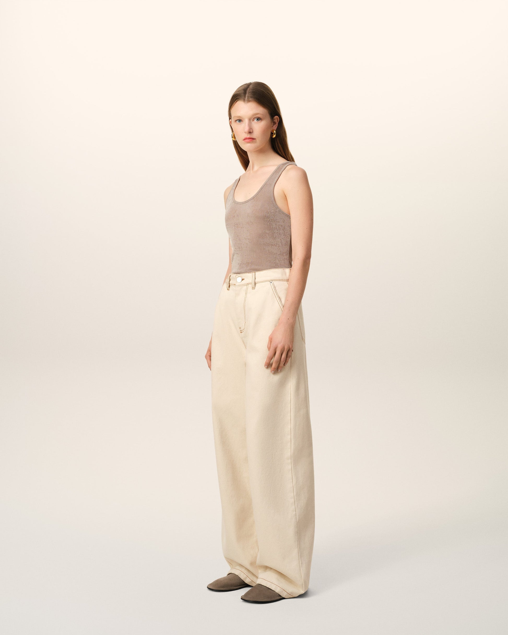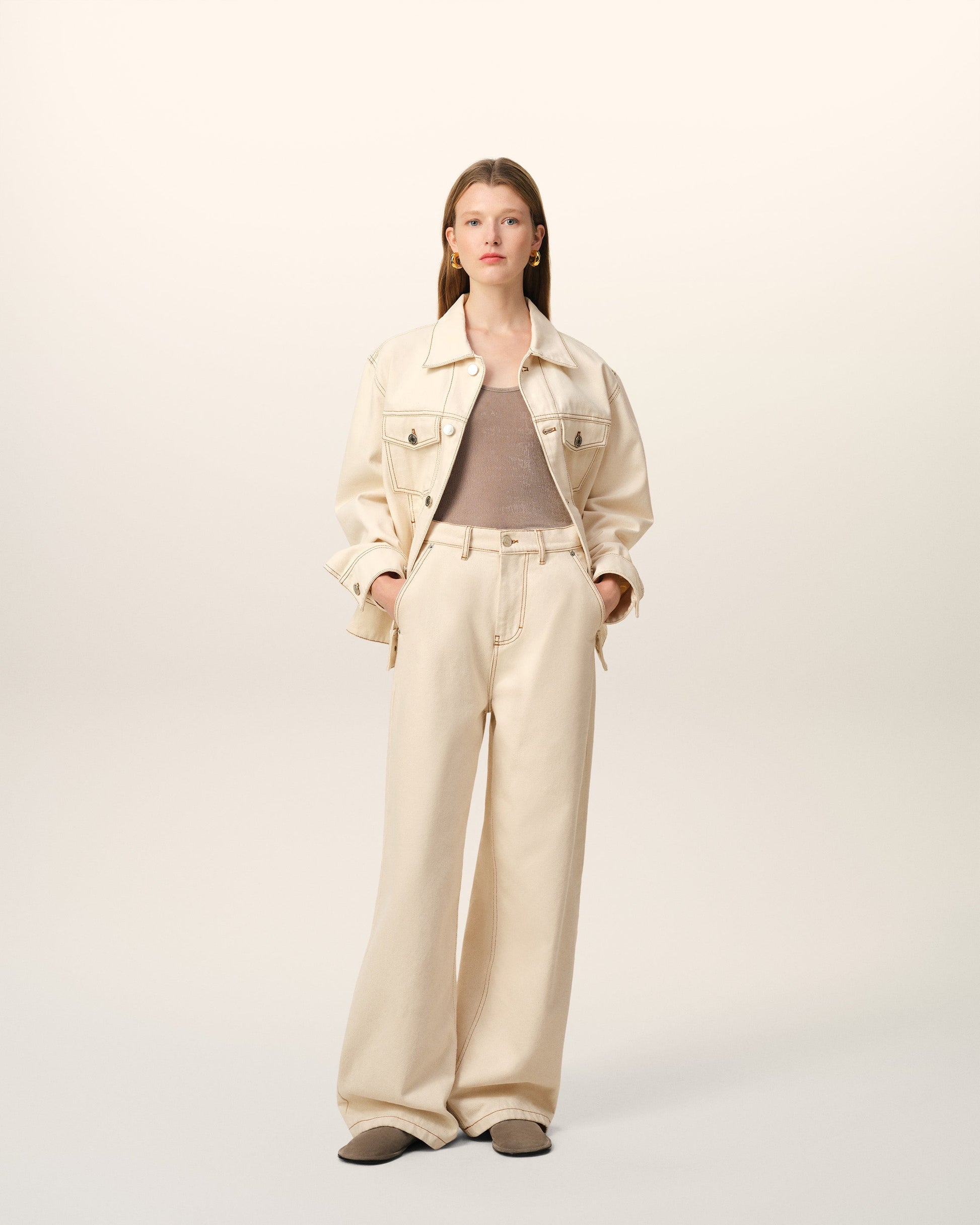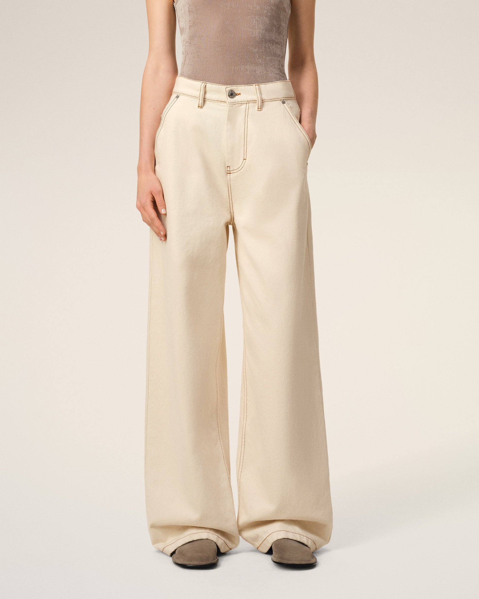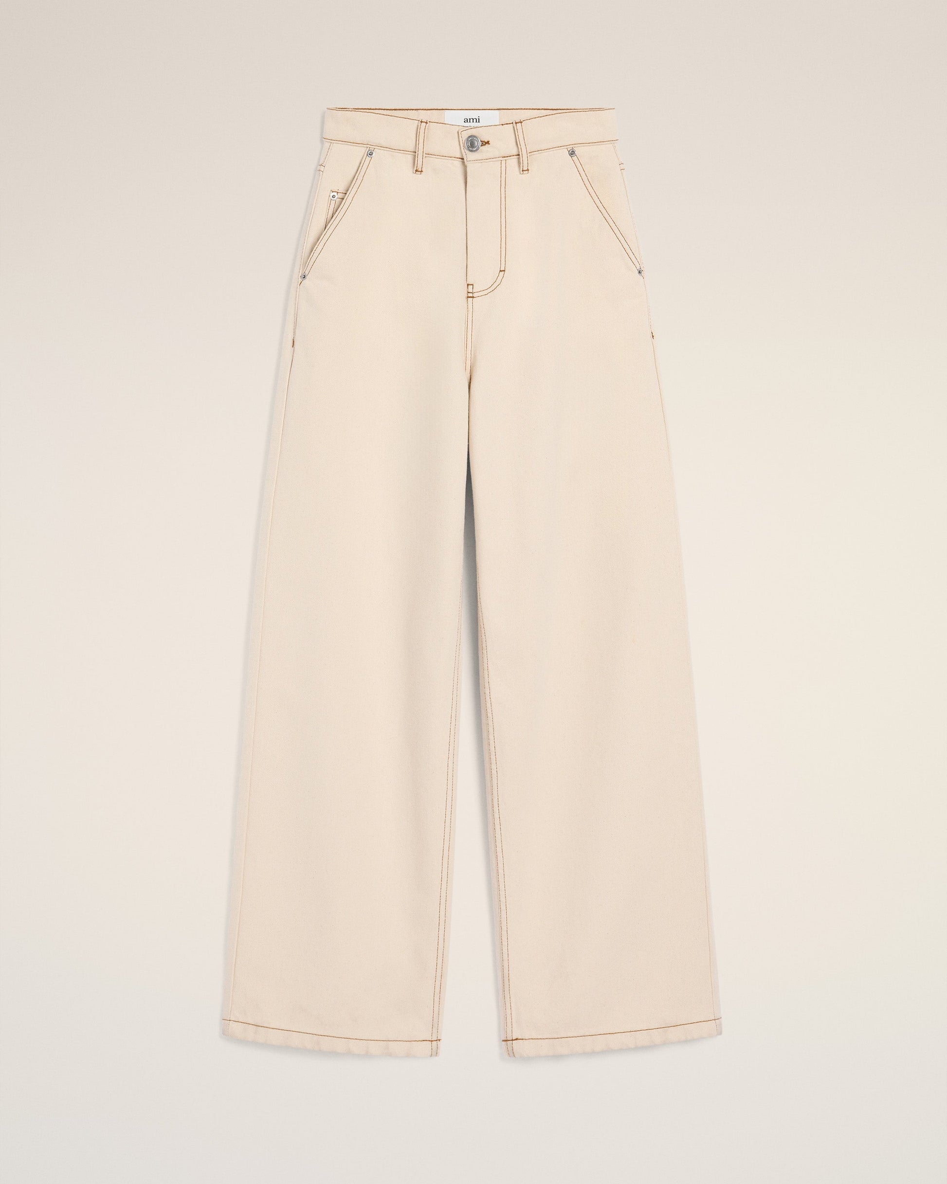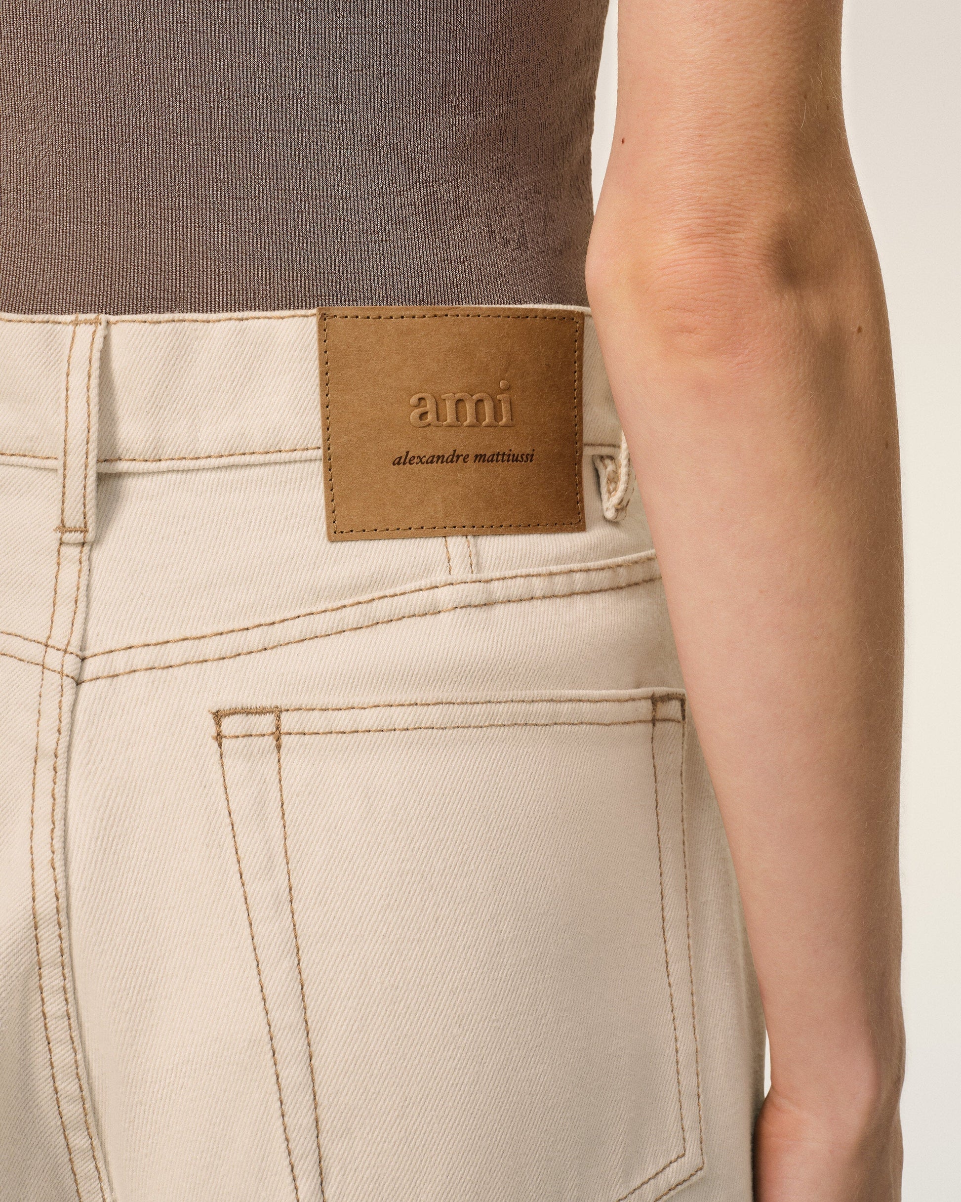 Wide fit jeans in colored cotton twill. Very large fit 30 cm bottom leg width (size 26) Classic waist Very large leg 5 pockets Zipped fly Denim metal rivets and buttons in nickel color "ami alexandre mattiussi" patch on the back Tobacco topstitches Made in Portugal (with love) REF: FTR456.DE0039.136