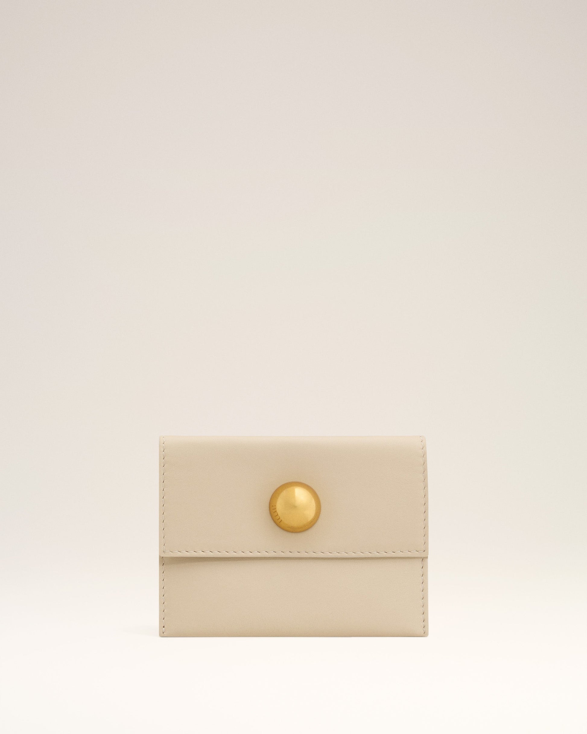 Carrousel card holder in smooth leather. Leather lining Domed metal stud with engraved "ami alexandre mattiussi" logo One main compartment, snap button fastening Metal hardware in vibrated brass color Size: 12x9 cm Made in Spain (with love) REF: USL005.AL0103.725