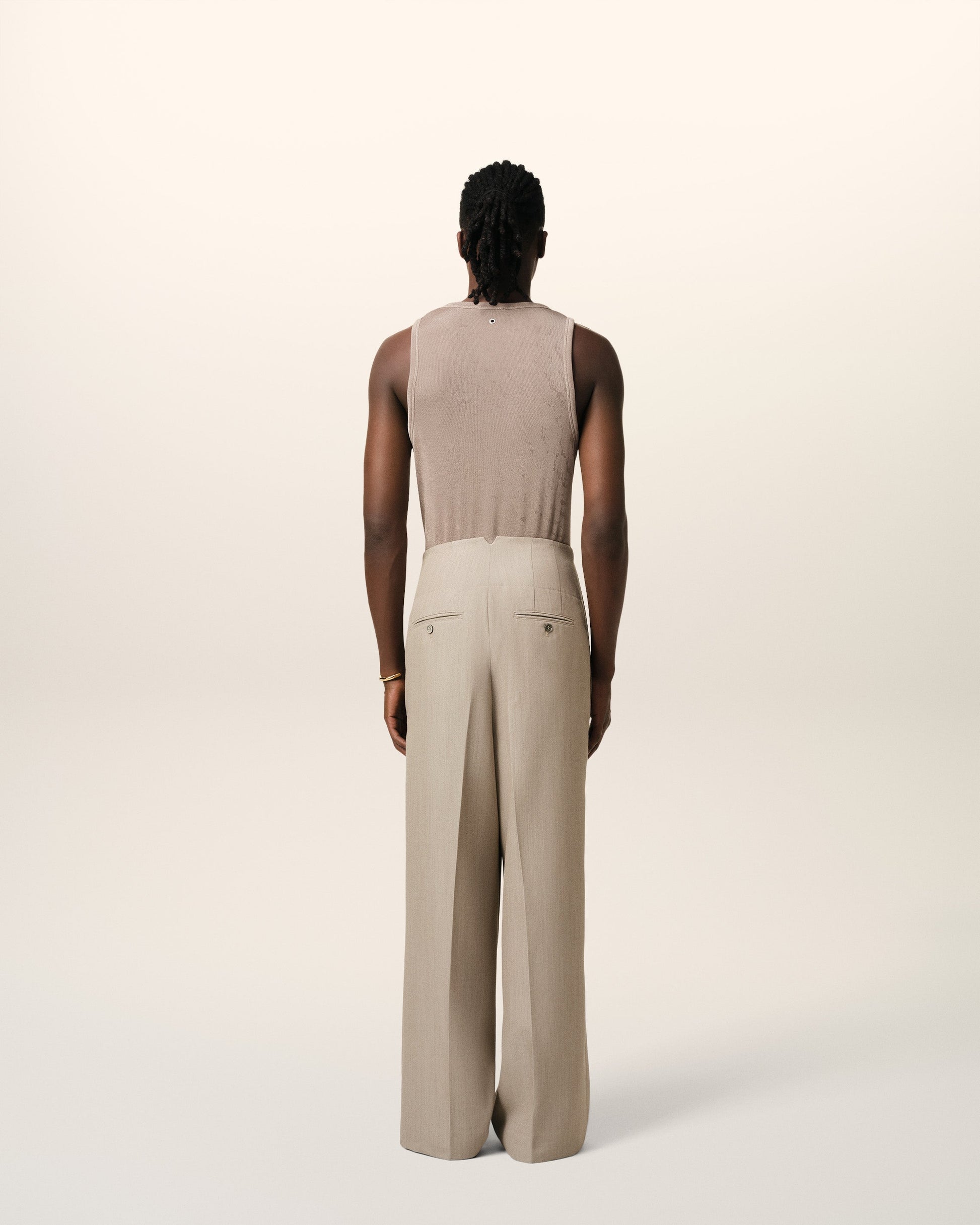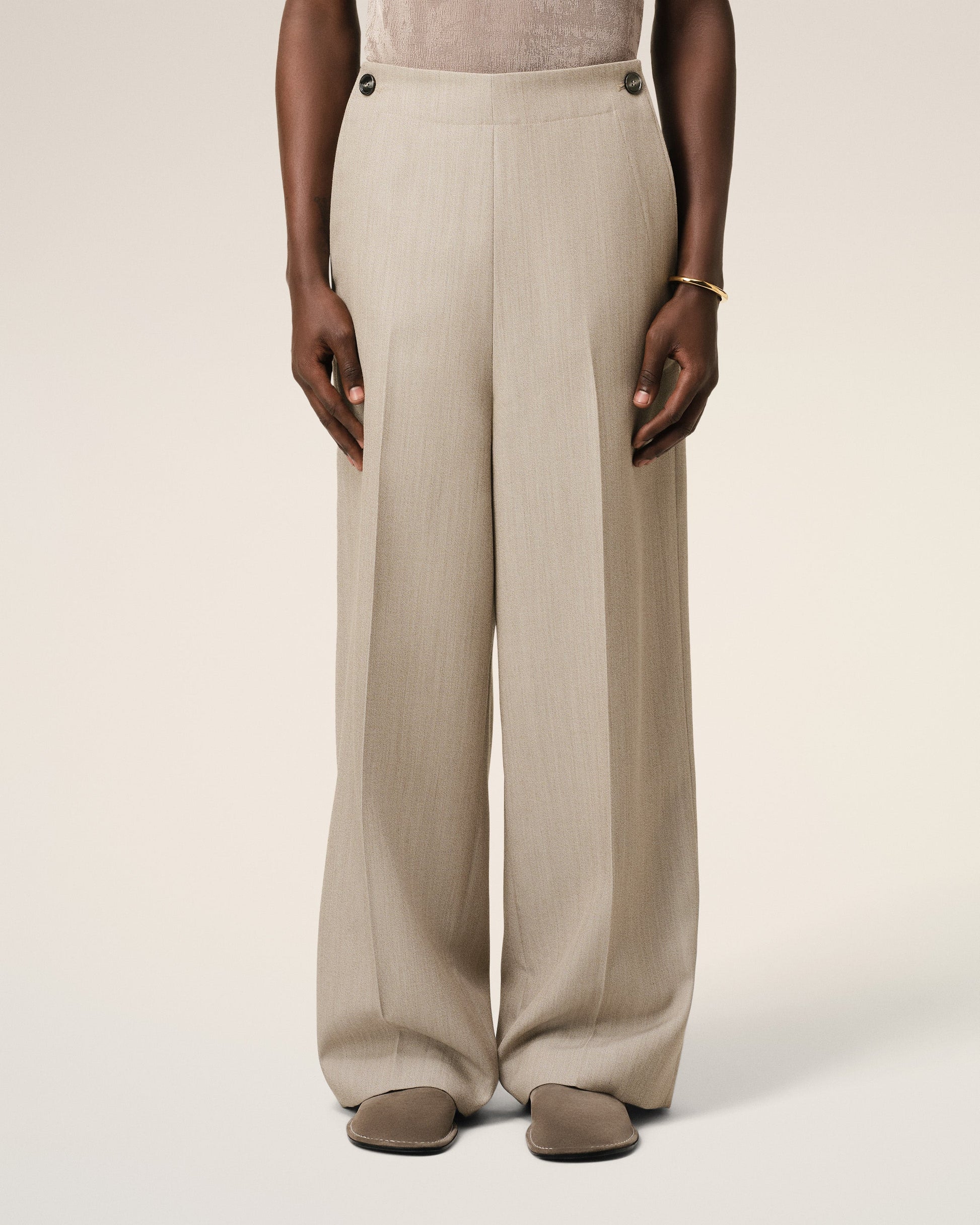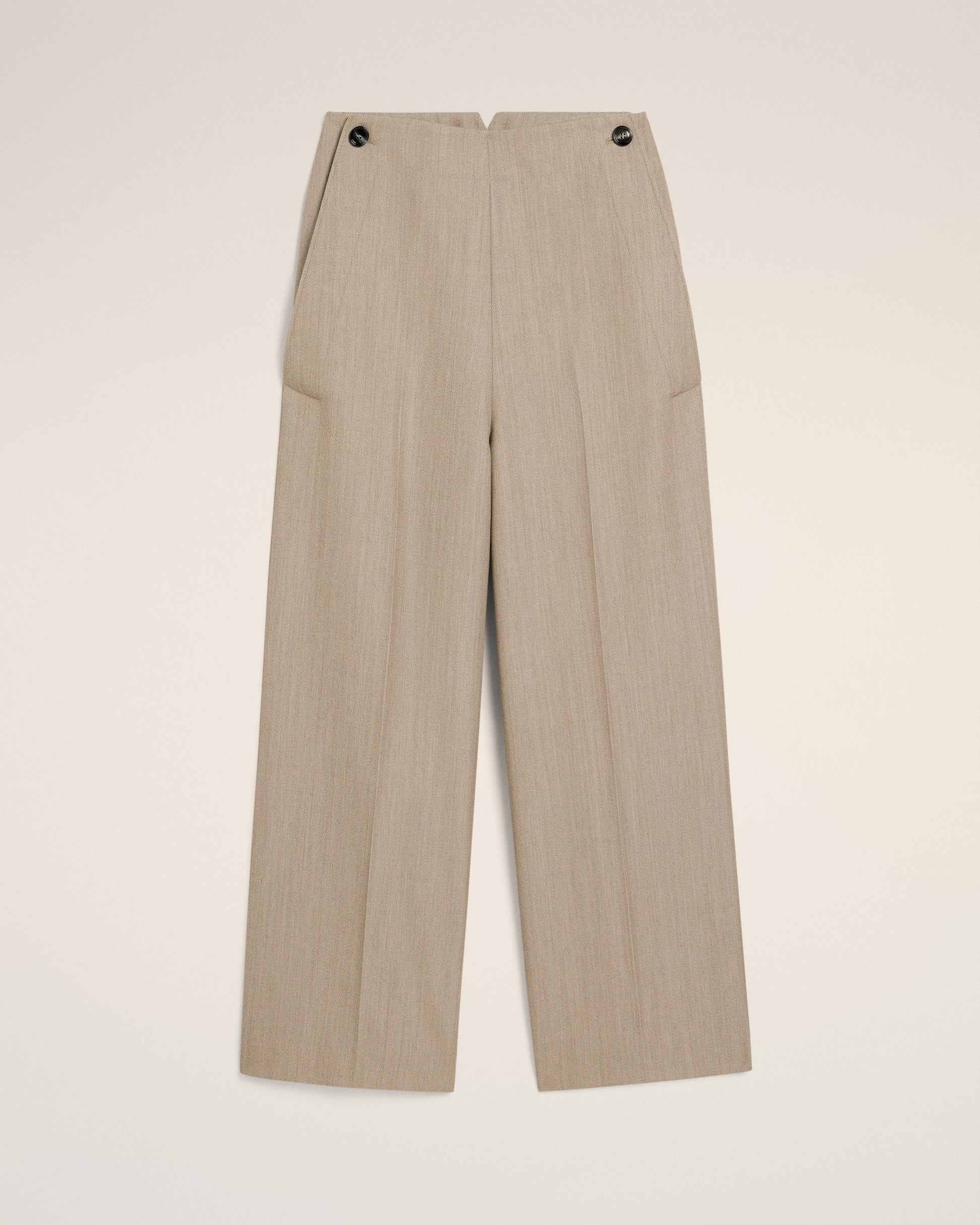 Sailor trousers in grain powder wool. Wide fit 31 cm bottom leg width (size 40) Front lining until knees Drop-front closure with buttons Side pockets Back piping pockets Horn buttons Made in Moldavia (with love) REF: HTR430.WV0065.725
