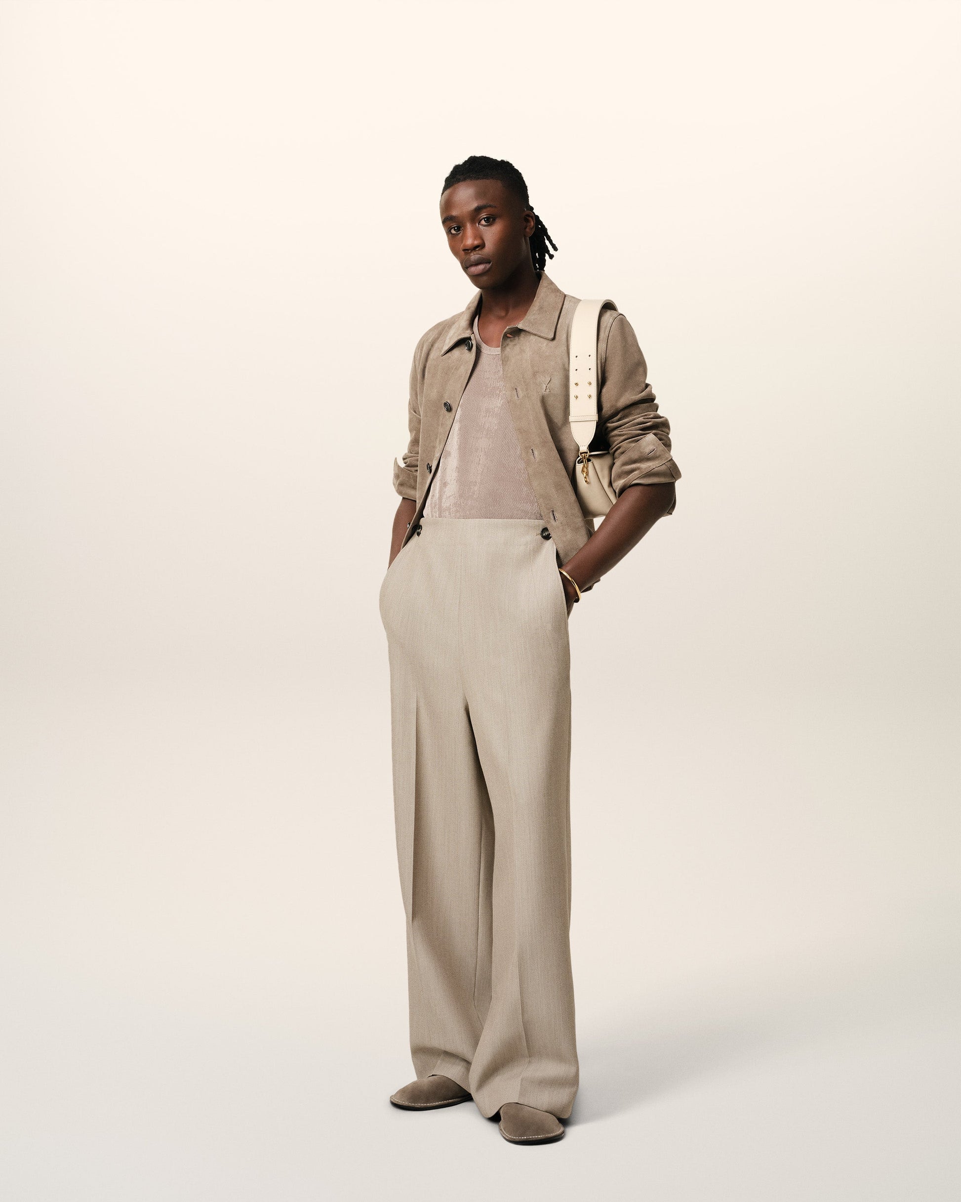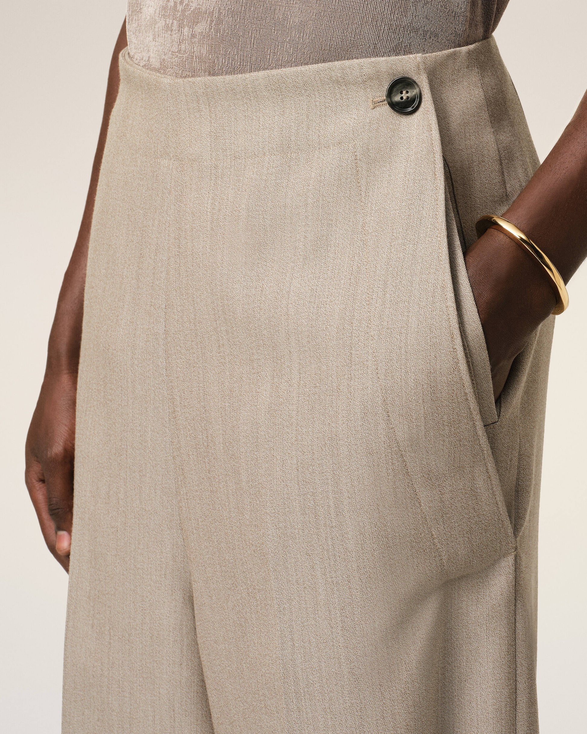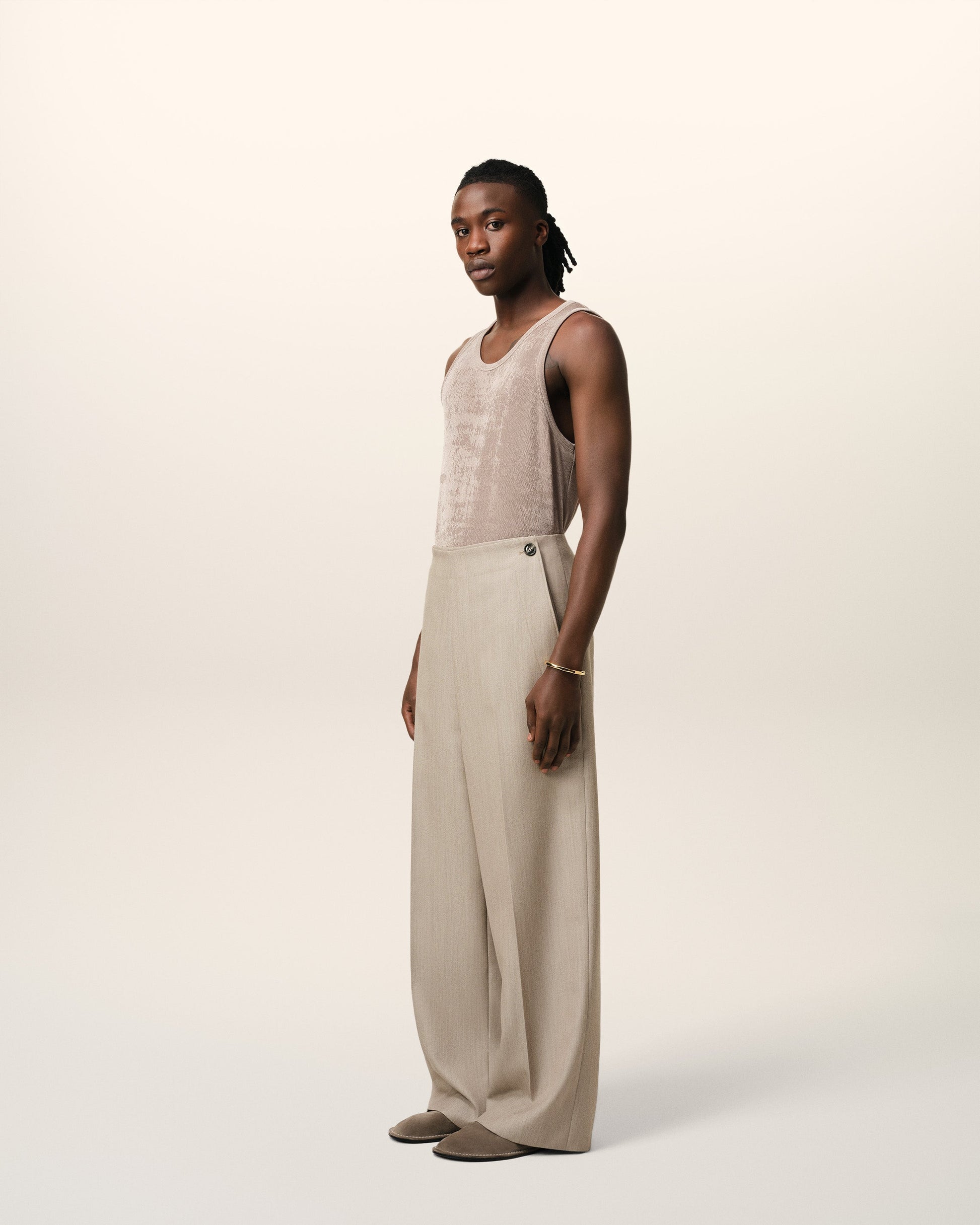Sailor trousers in grain powder wool. Wide fit 31 cm bottom leg width (size 40) Front lining until knees Drop-front closure with buttons Side pockets Back piping pockets Horn buttons Made in Moldavia (with love) REF: HTR430.WV0065.725