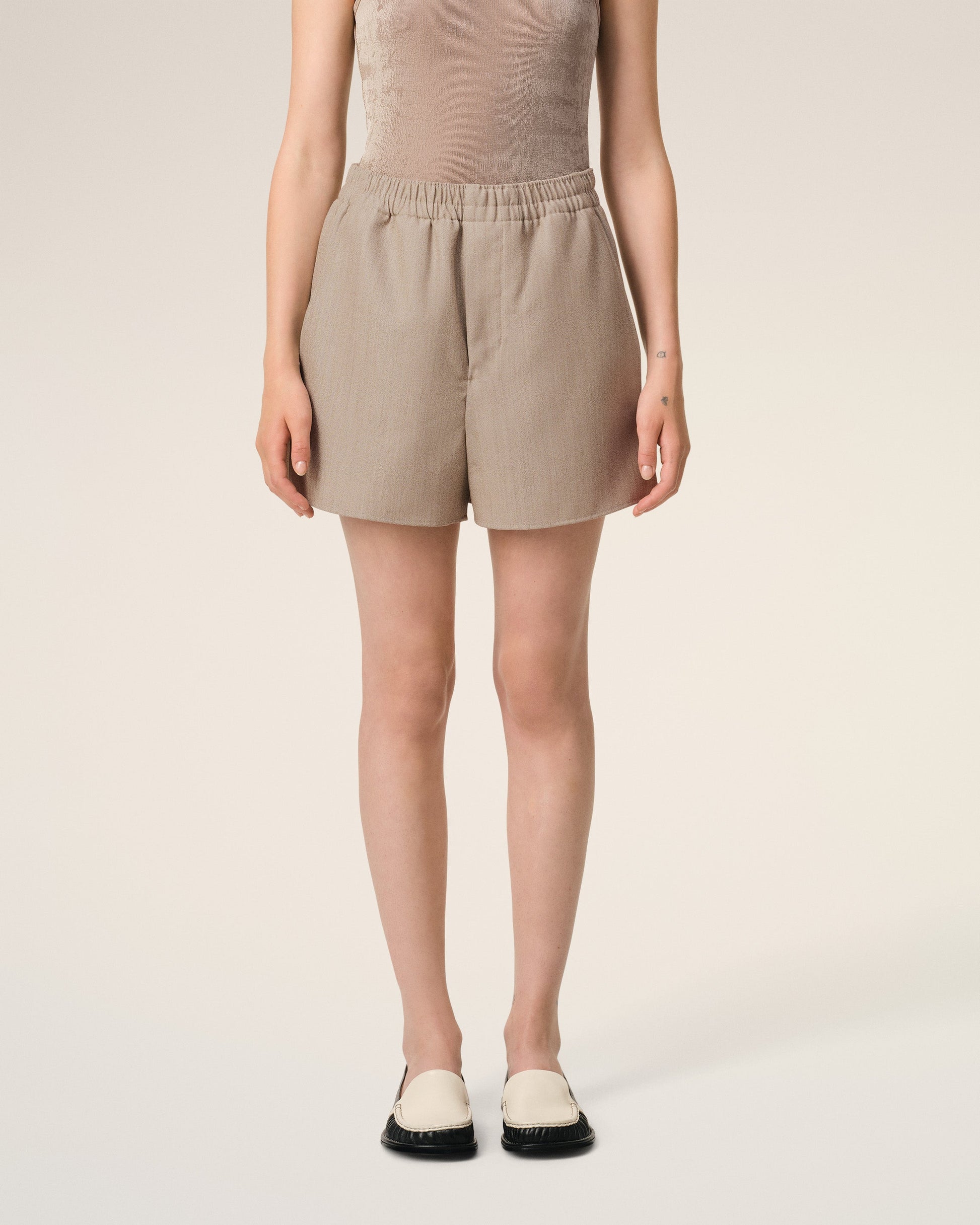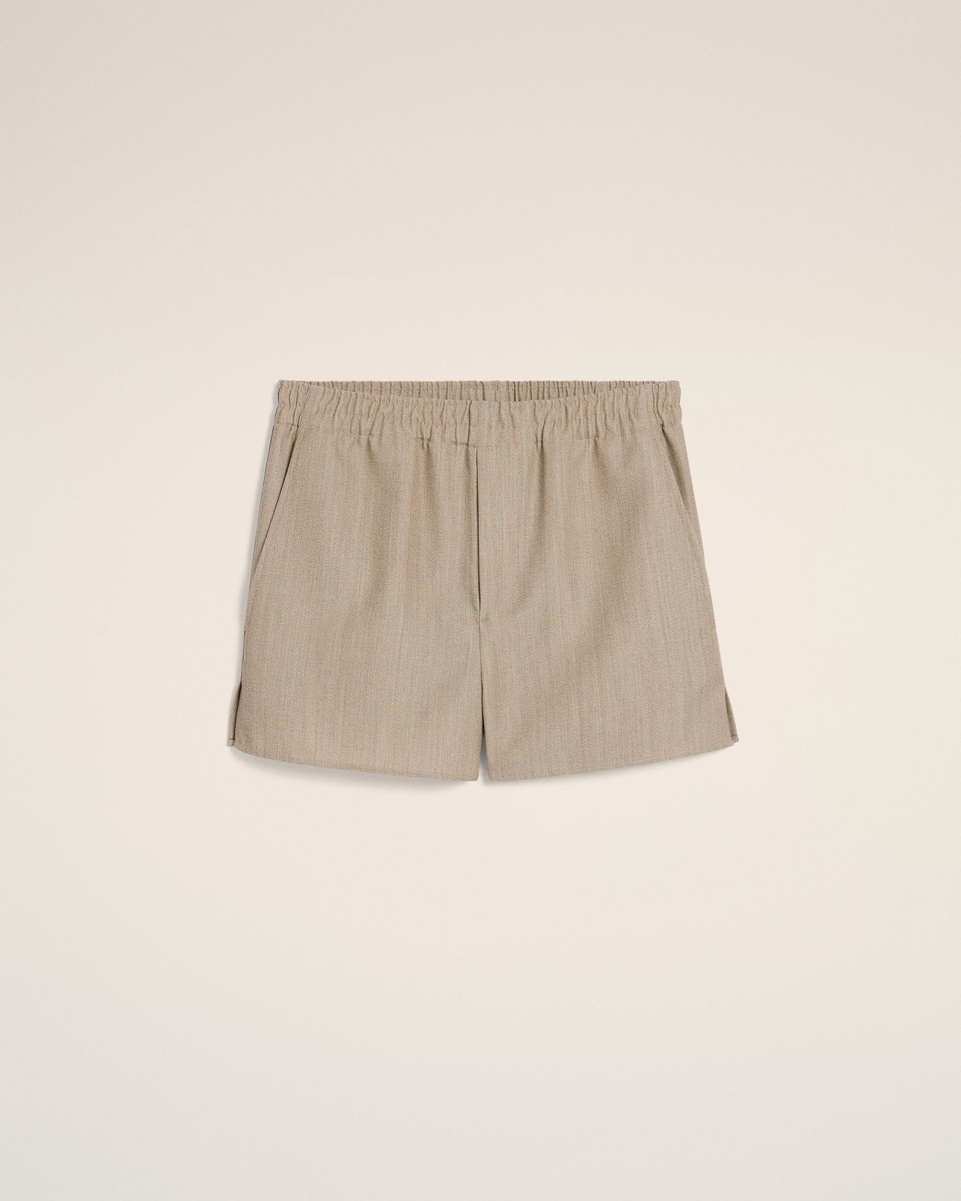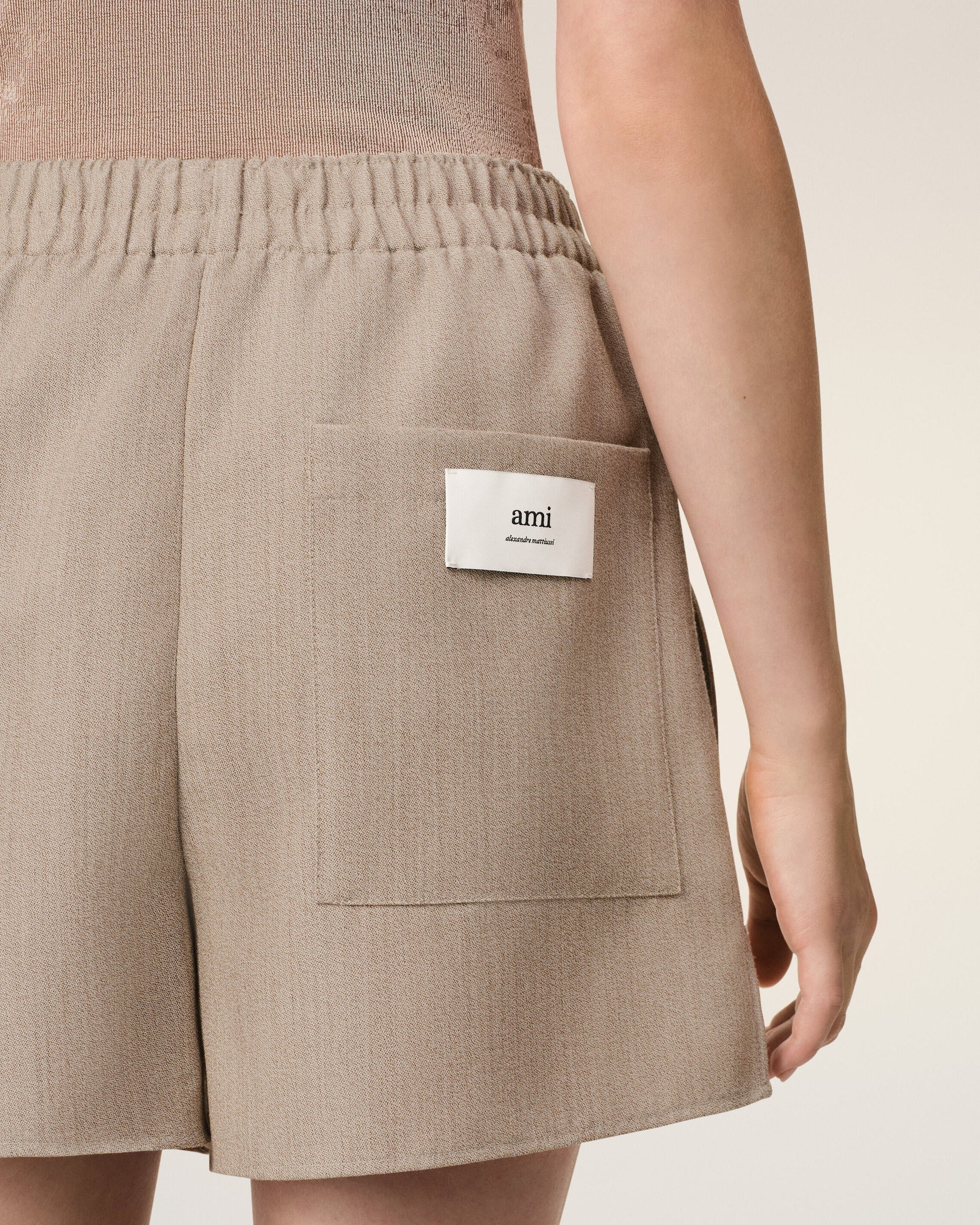 Elasticated short in wool grain de poudre. Decontracted fit Unisex product 33 cm bottom leg width (size XS) 34 cm bottom leg width (size M) Elastic waist Zipper opening Side pockets Back patch pocket with label "ami alexandre mattiussi" handstitched Side slits Made in Portugal (with love) REF: USO117.WV0065.725
