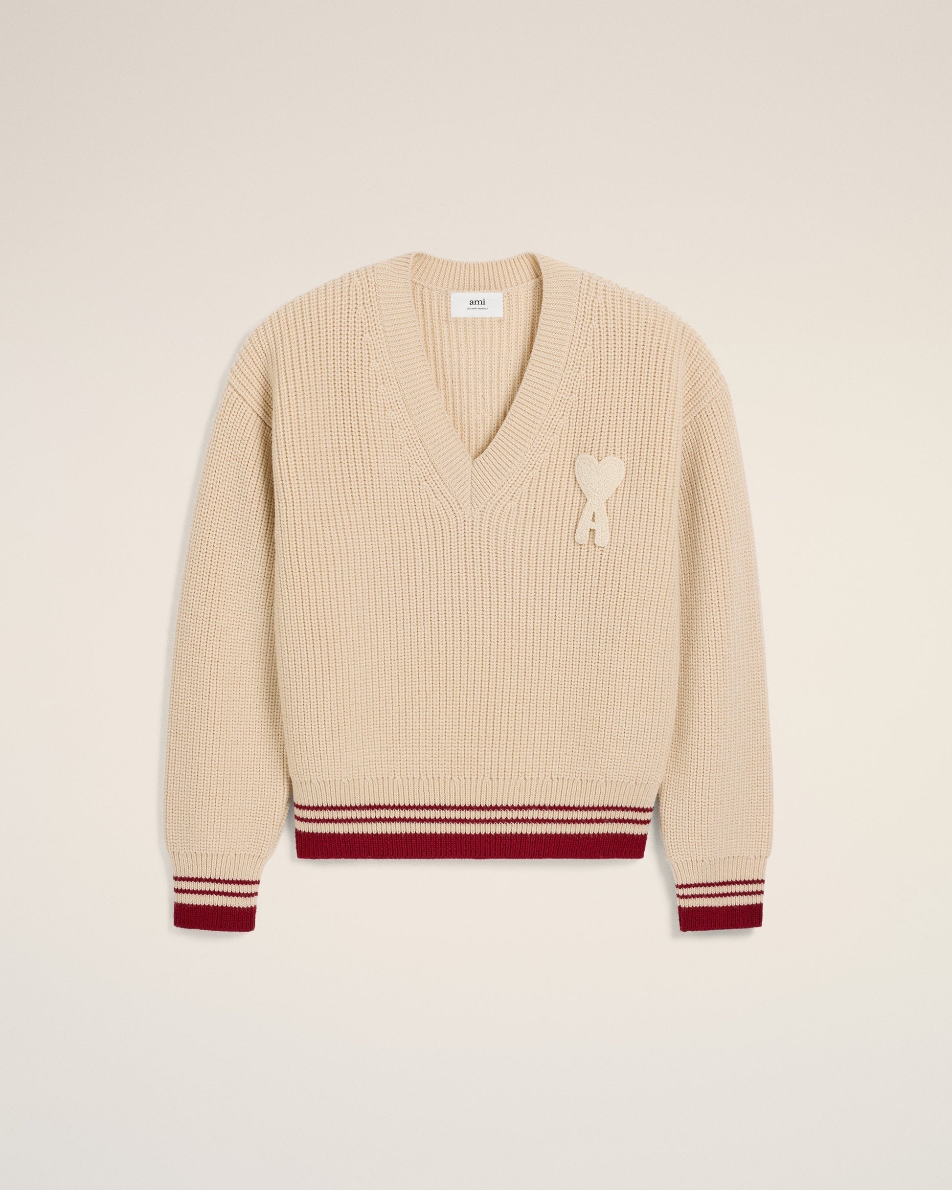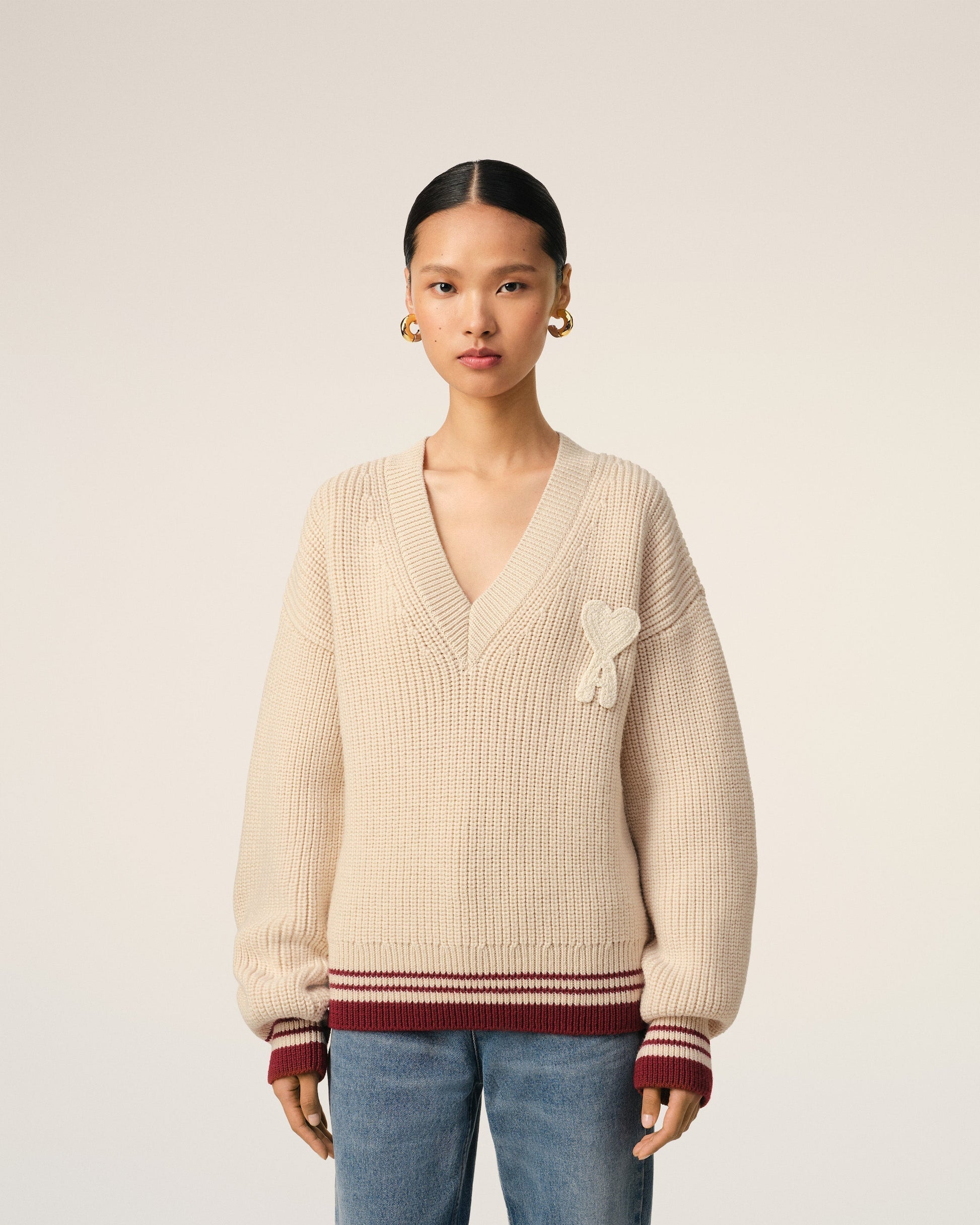 Sweater in college ribs wool. Unisex product Half english ribs stitch "AMI Paris" knitted patch embroidered on the back under collar Ami de Coeur knitted patch embroidered on chest 63 cm center back length (size M) 59 cm center back length (size XS) Made in Portugal (with love) REF: UKS268.KN0068.136