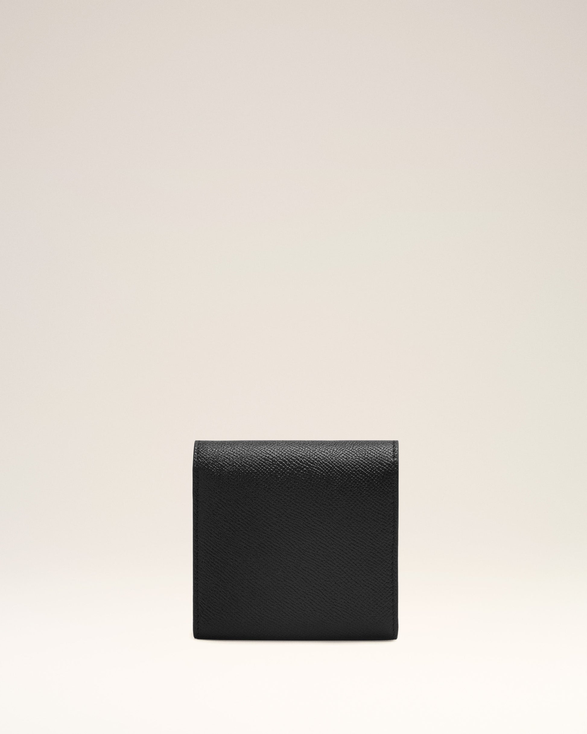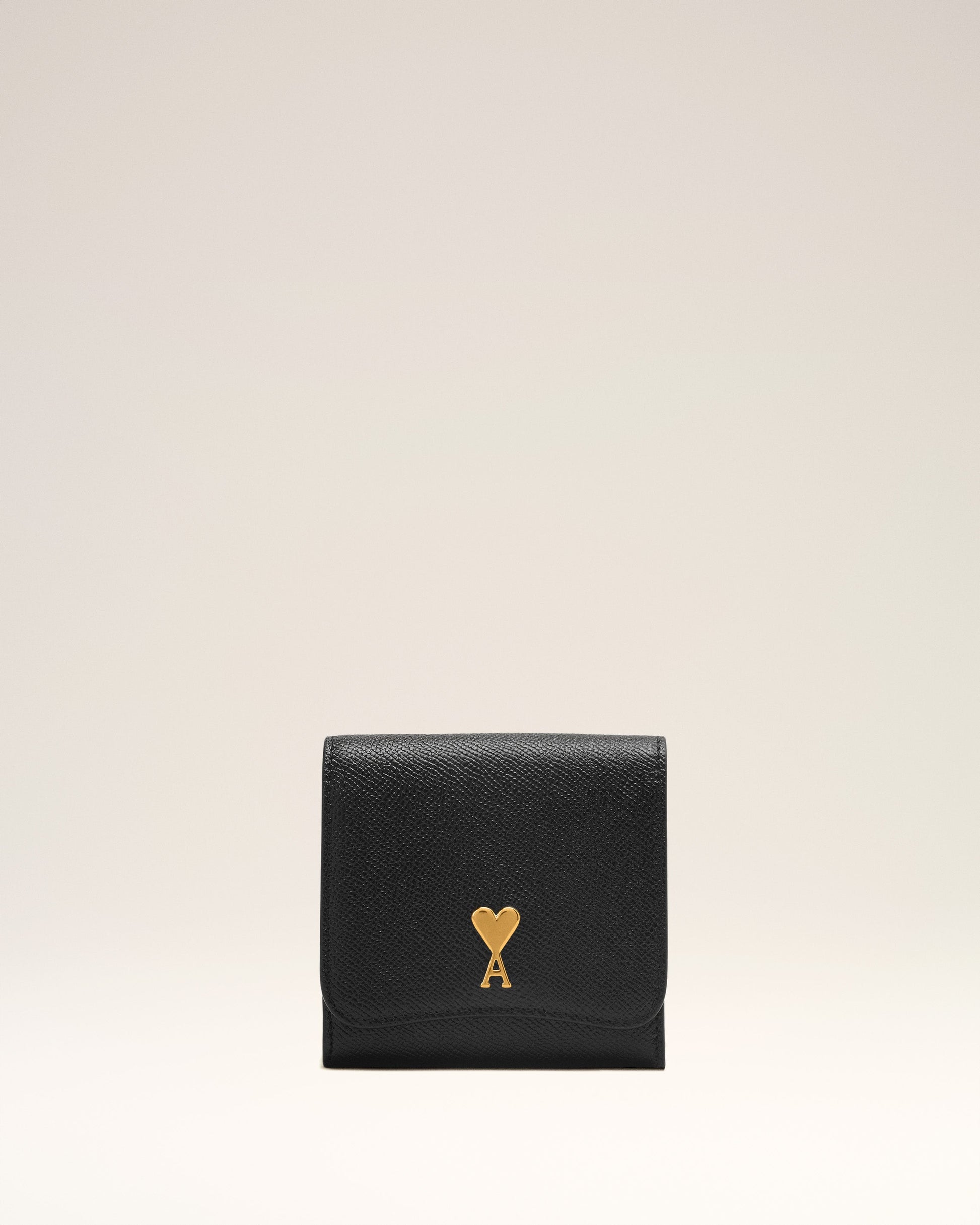Paris Paris compact wallet in grained leather. Cotton canvas lining Ami de Coeur stud One central zipped coin pocket, six card compartments and one front compartment Snap button fastening Metal hardware in vibrated brass color Size: 11x10 cm Made in Morocco (with love) REF: USL203.AL0036.0015