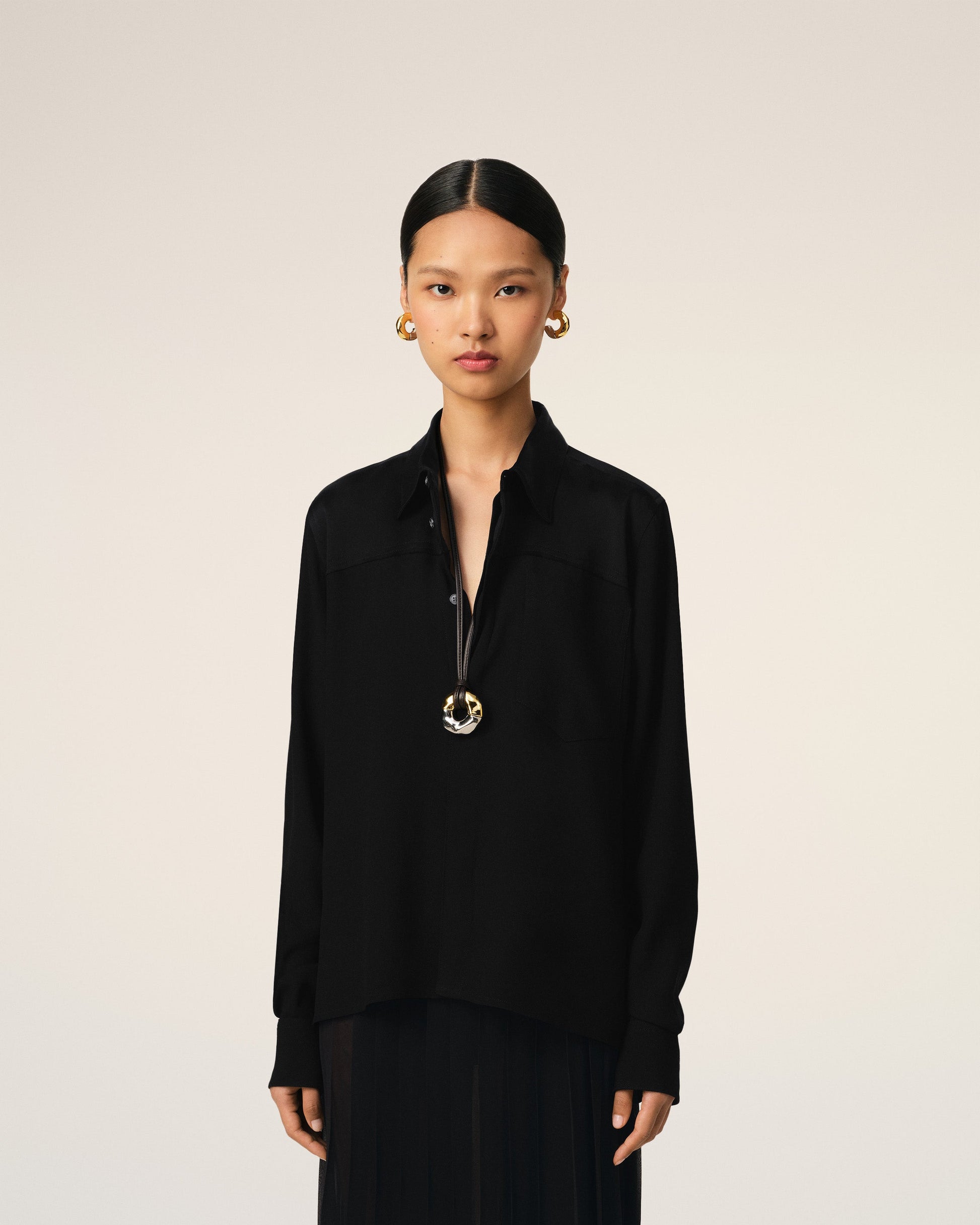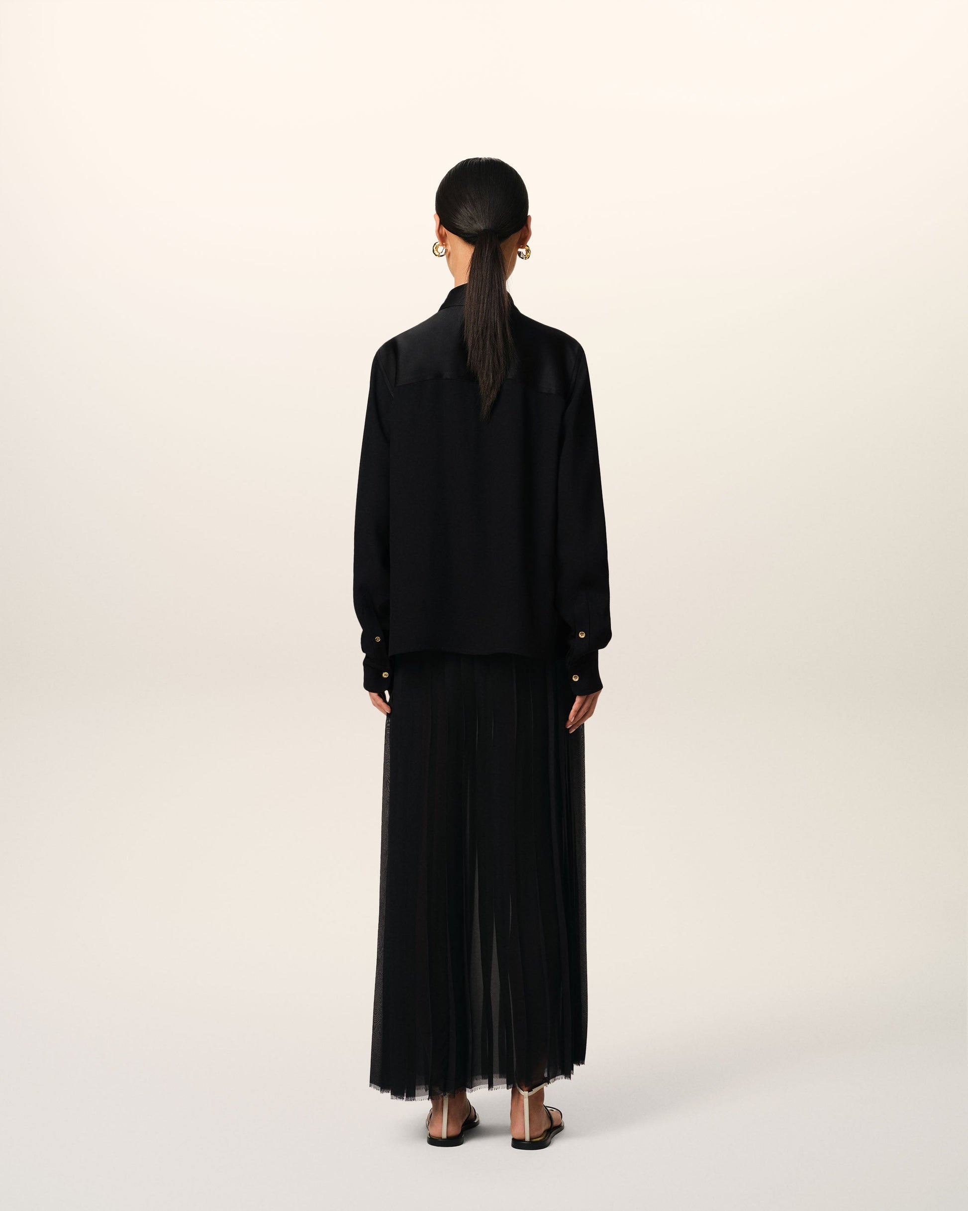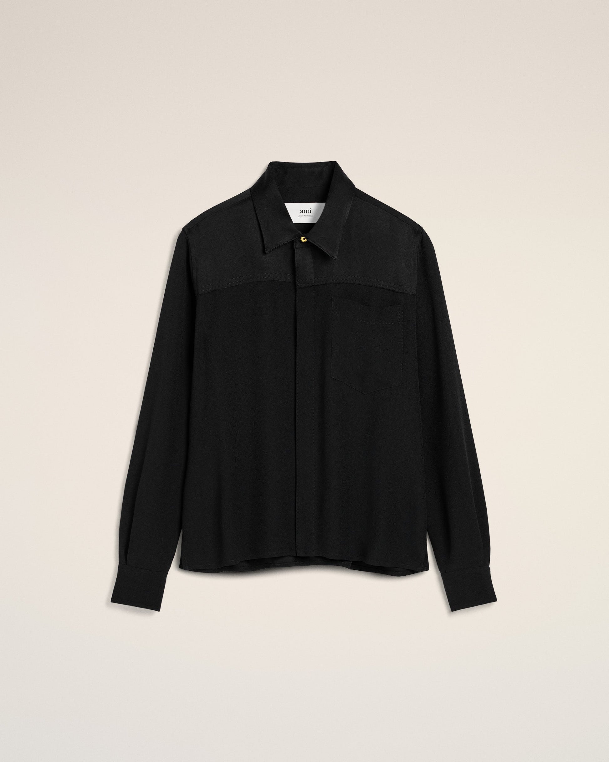 Long sleeve shirt with contrasted top in viscose and acetate crepe with satin back. Classic fit 72 cm center back length (taille 36) Contrast with the shine of the fabric Mini Ami de Coeur engraved metal plate under collar Classic collar Chest patch pocket Hidden tab and buttoned cuffs Metal buttons Made in Portugal (with love) REF: FSH020.AC0014.001