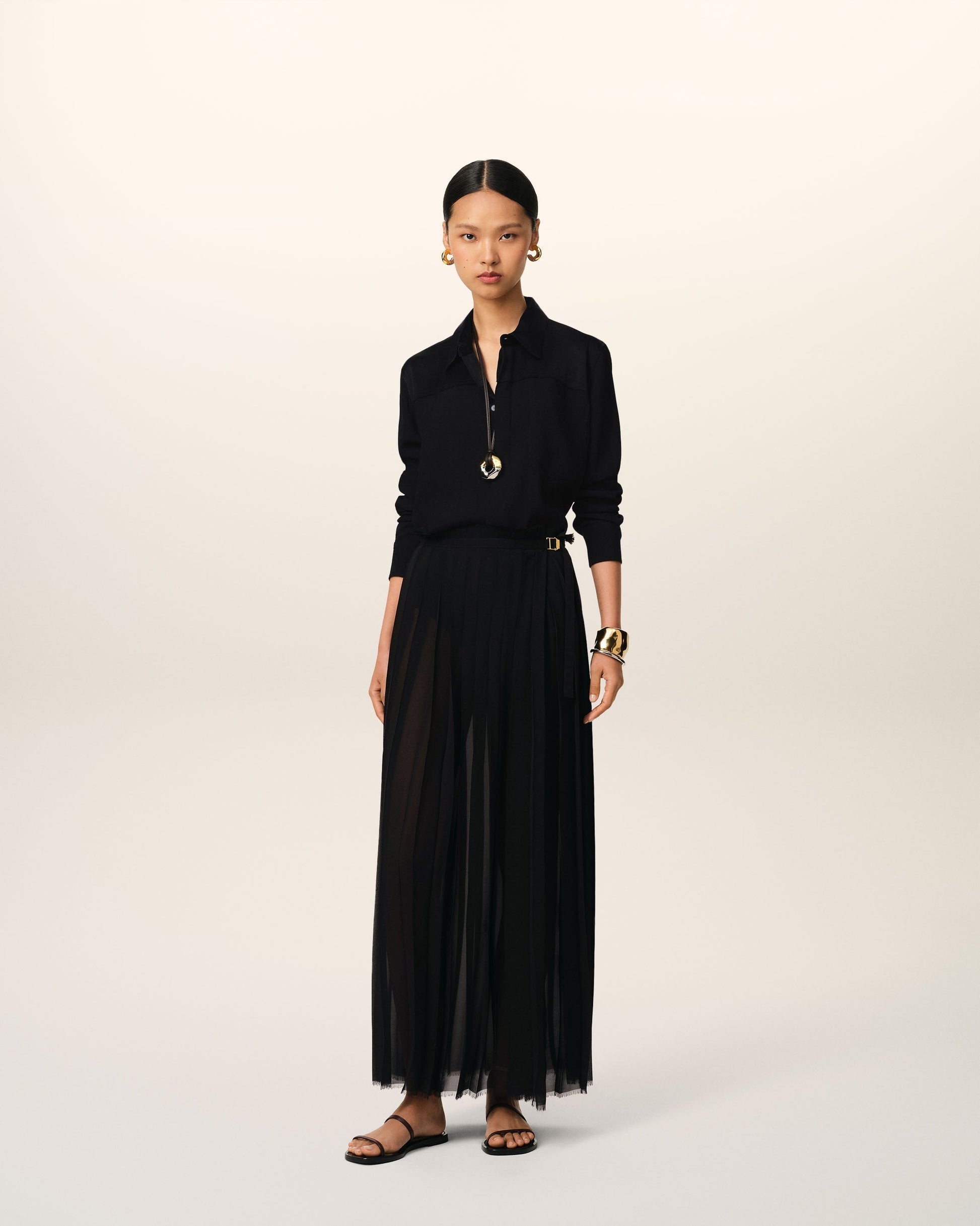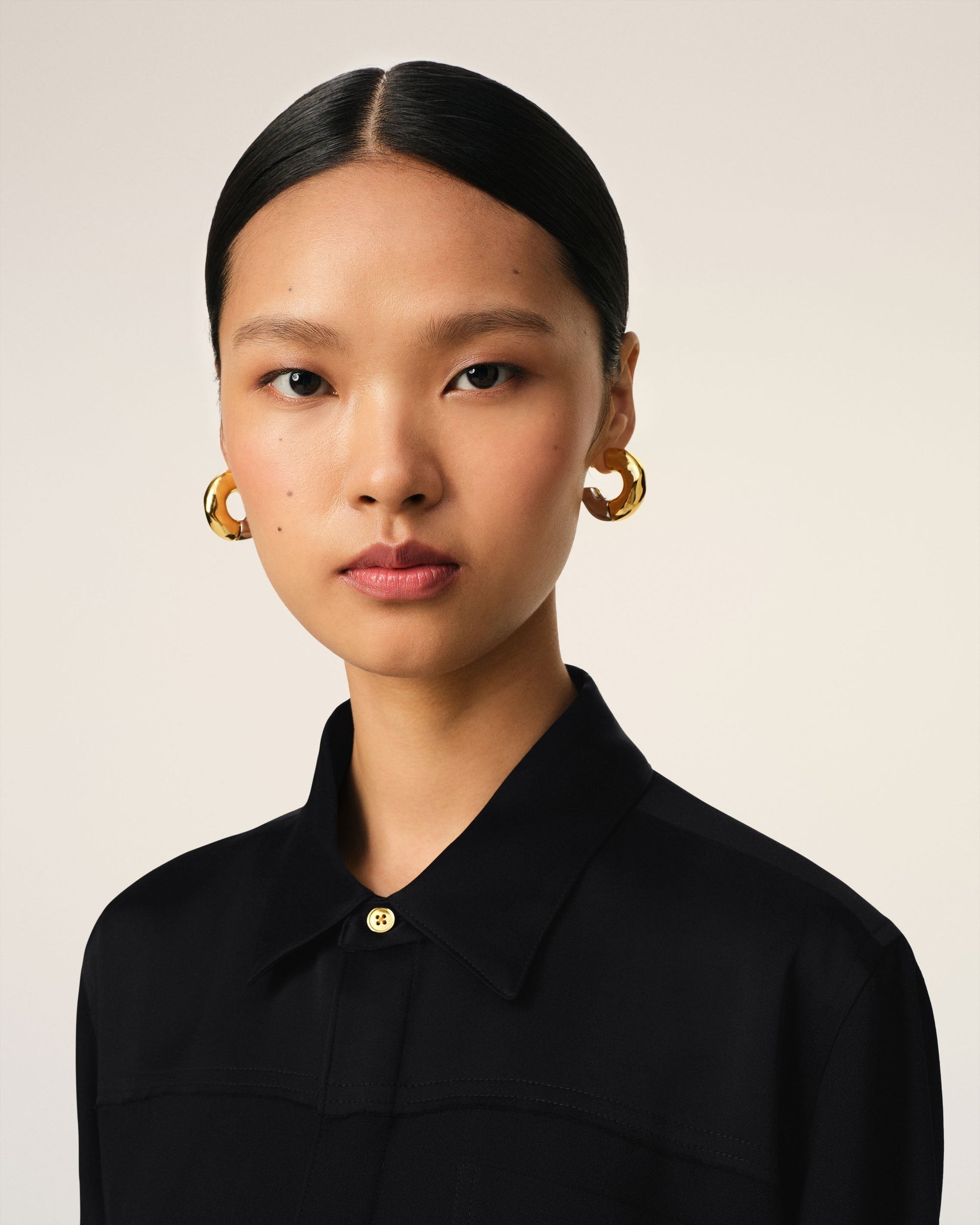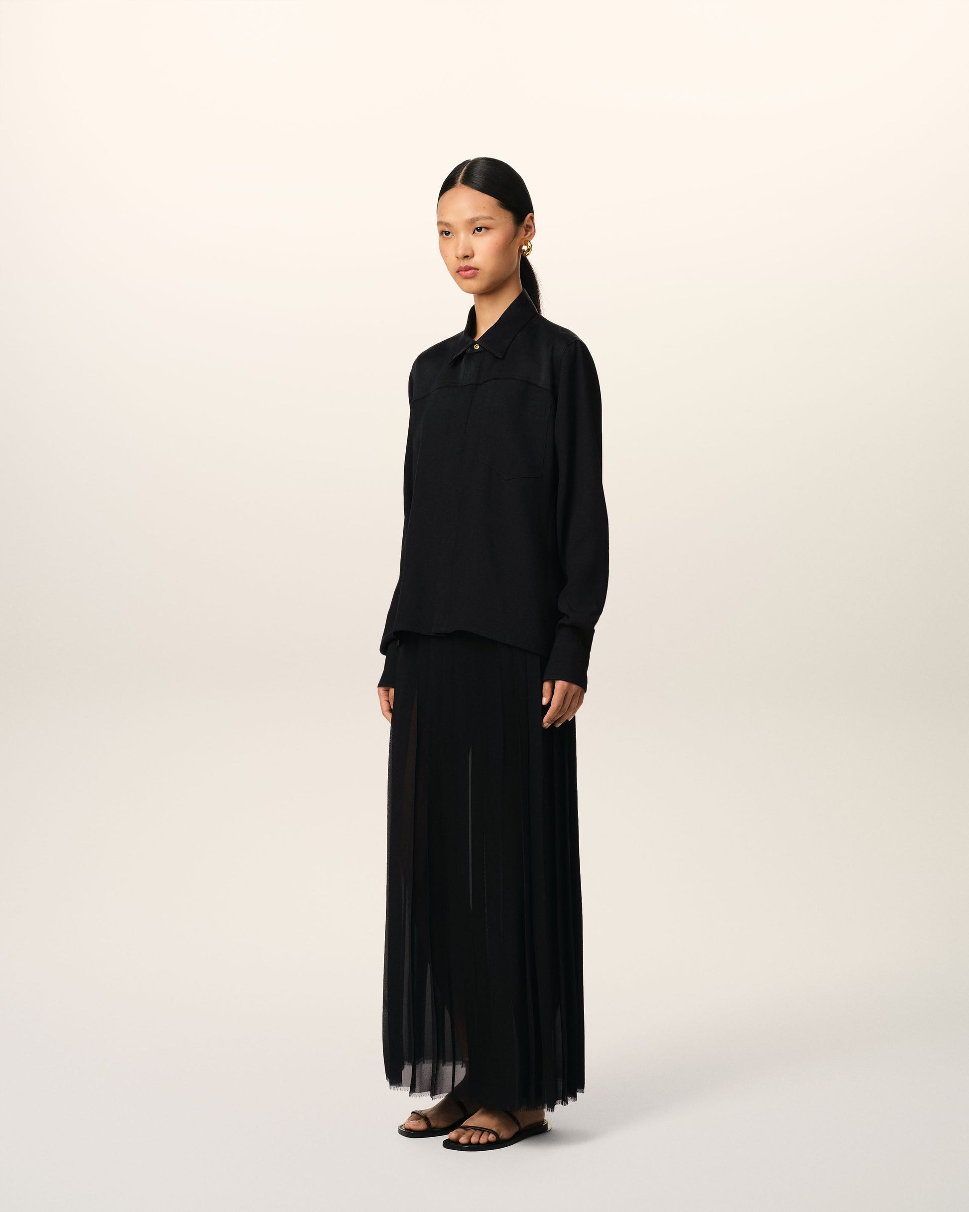 Long sleeve shirt with contrasted top in viscose and acetate crepe with satin back. Classic fit 72 cm center back length (taille 36) Contrast with the shine of the fabric Mini Ami de Coeur engraved metal plate under collar Classic collar Chest patch pocket Hidden tab and buttoned cuffs Metal buttons Made in Portugal (with love) REF: FSH020.AC0014.001