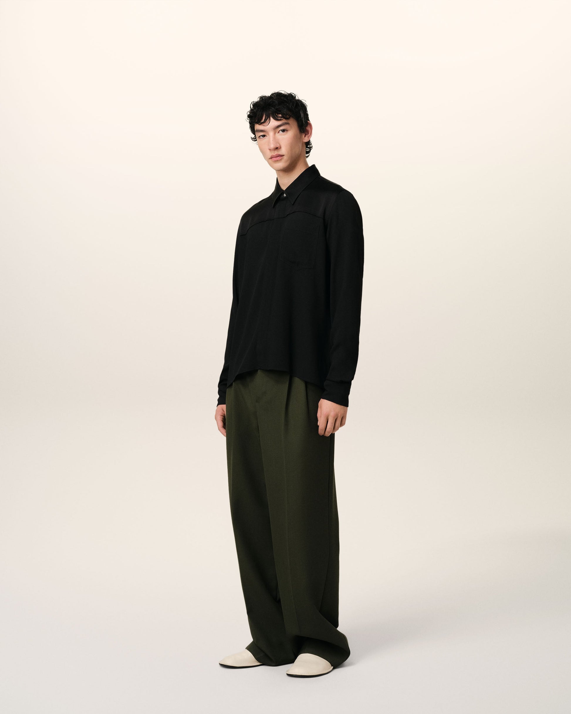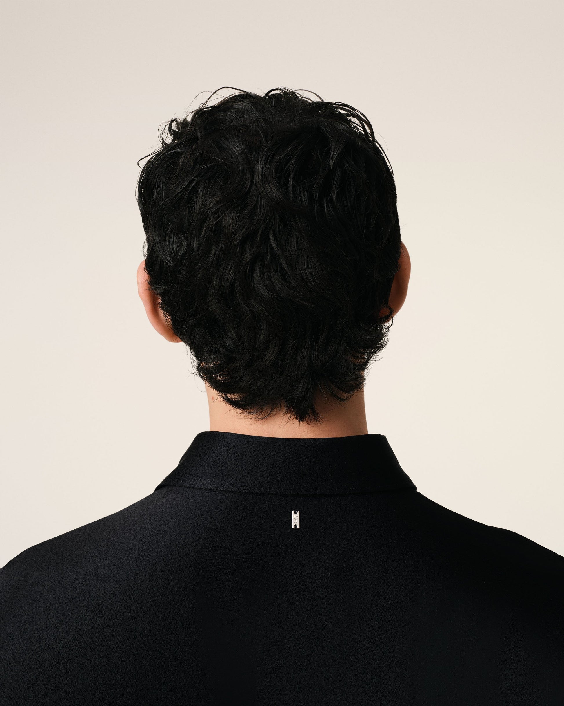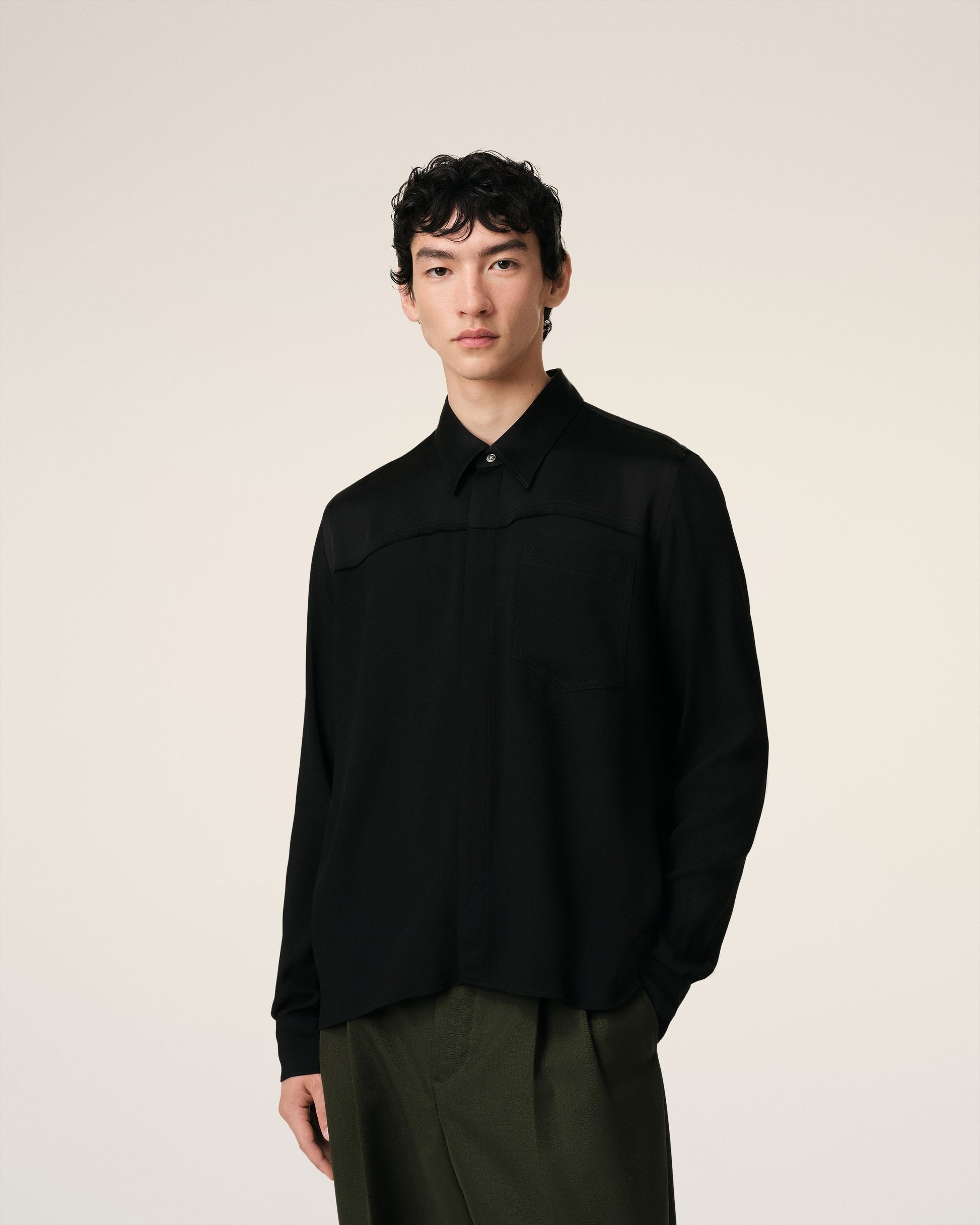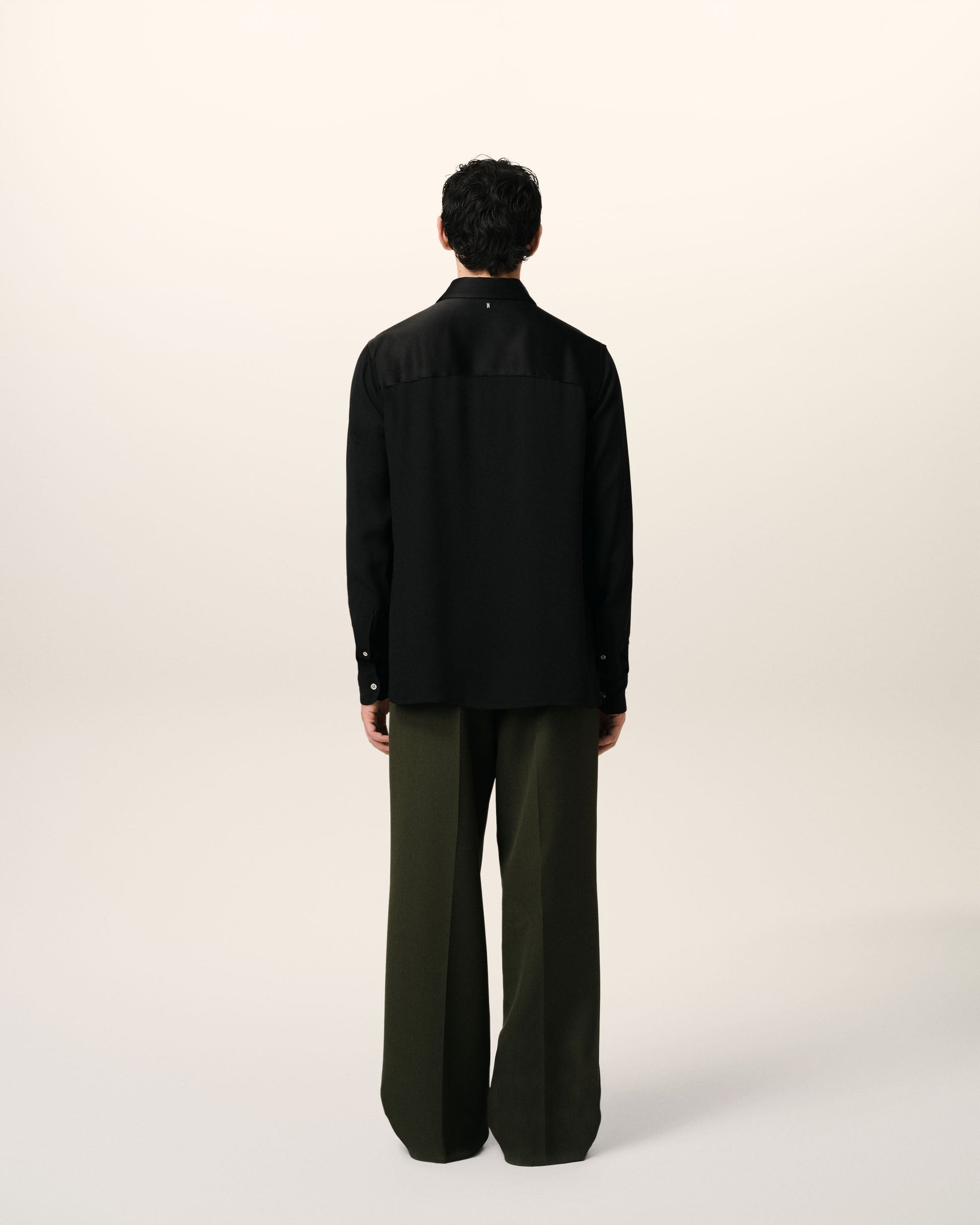 Long sleeve shirt with contrasted top in viscose and acetate crepe with satin back. Classic fit 74 cm center back length (taille 40) Contrast with the shine of the fabric Mini Ami de Coeur engraved metal plate under collar Classic collar Chest patch pocket Hidden tab and cuffs buttoned Metal buttons Made in Portugal (with love) REF: HSH020.AC0014.001