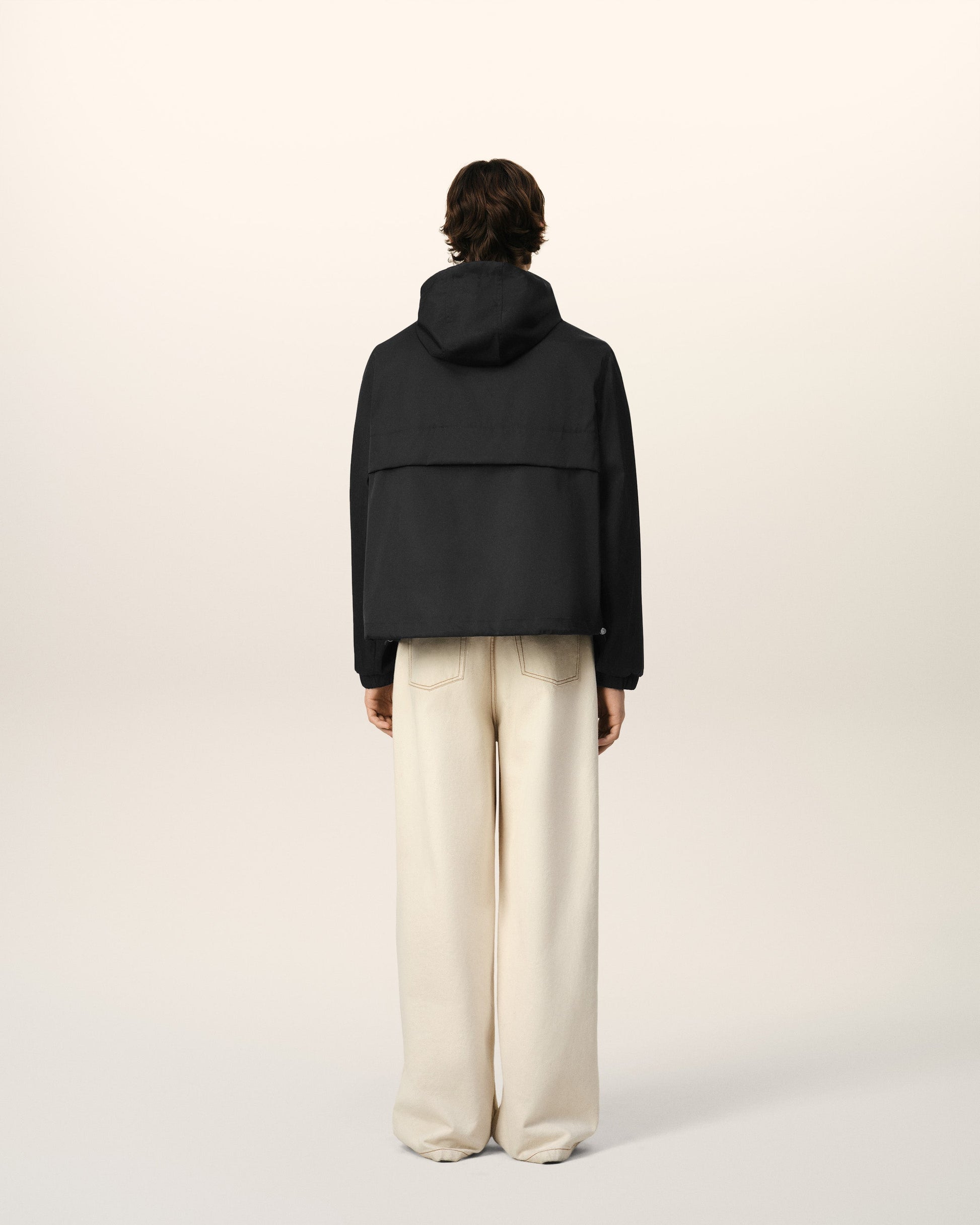 Hooded windbreaker in water-repellent technical twill in nylon and cotton . Unisex product 60 cm center back length (size XS) 62,5 cm center back length (size M) Water-repellent fabric Nickel simple metal zipper with "ami" engraved pullers Front zip tab with invisible nickel press snap buttons Front kangourou pocket Waist and hood with adjustable drawstring "ami alexandre mattiussi" metal lettering signature on the chest Metal stoppers and eyelets in nickel color Made in Romania (with love) REF : UJK101.PA0007.001