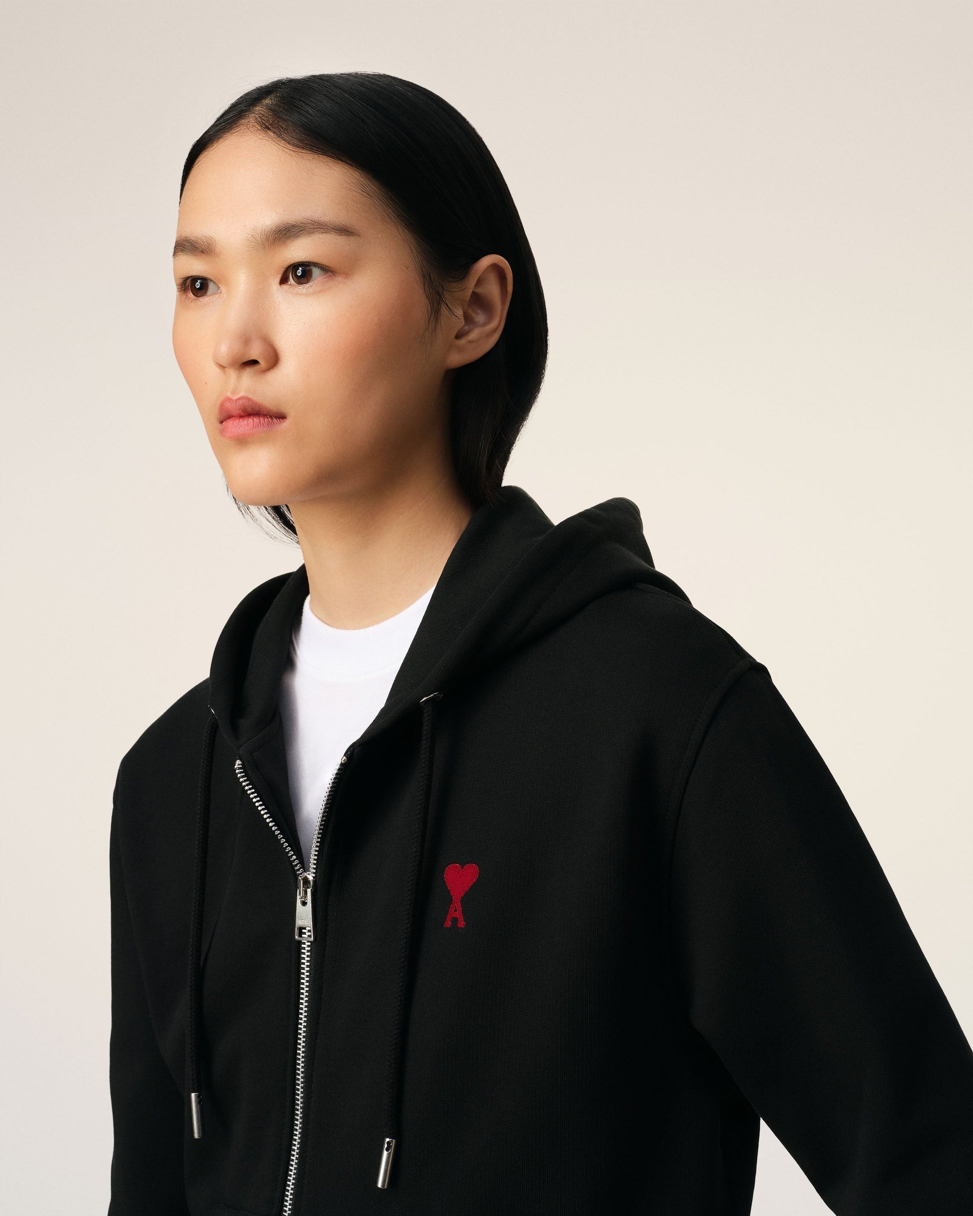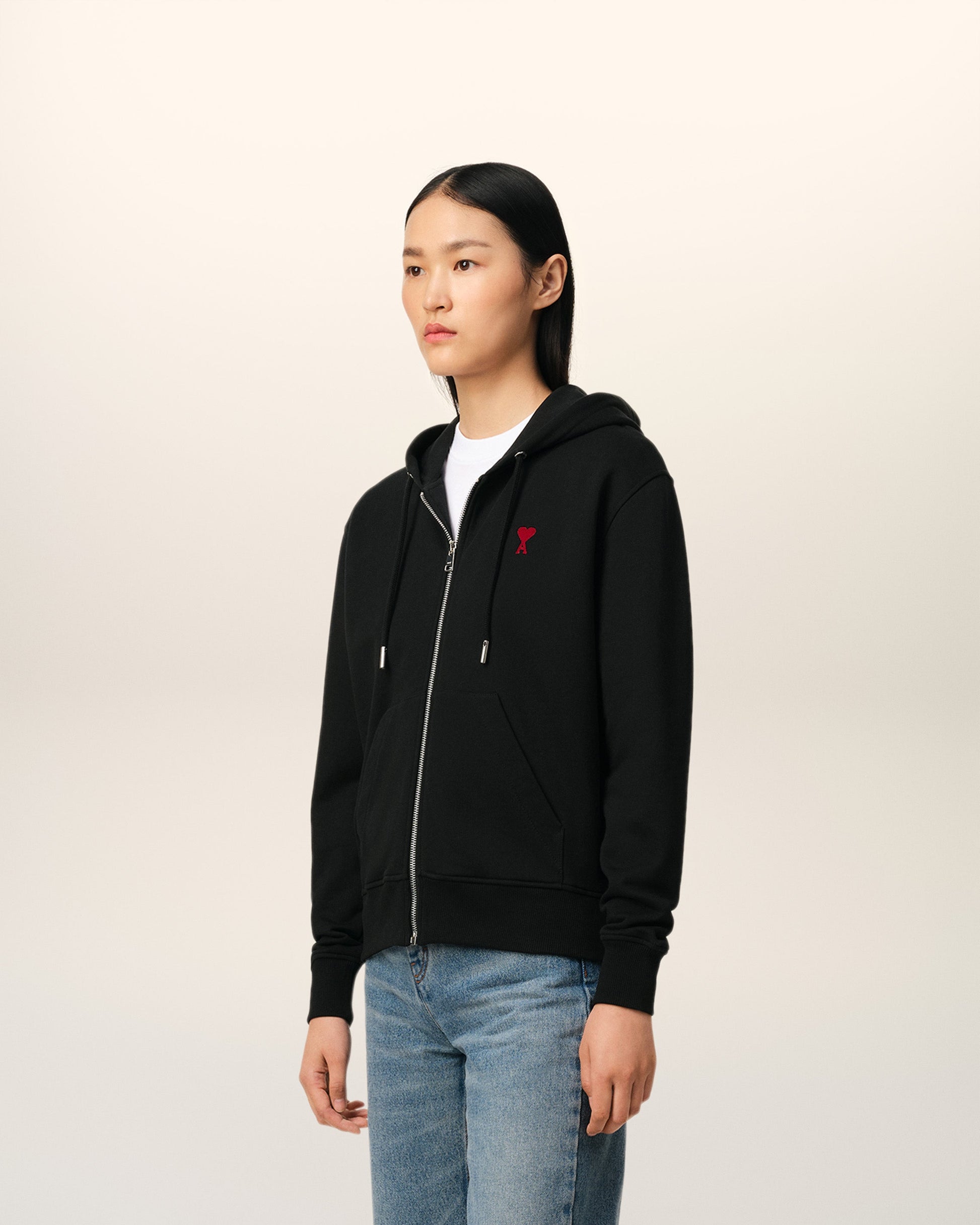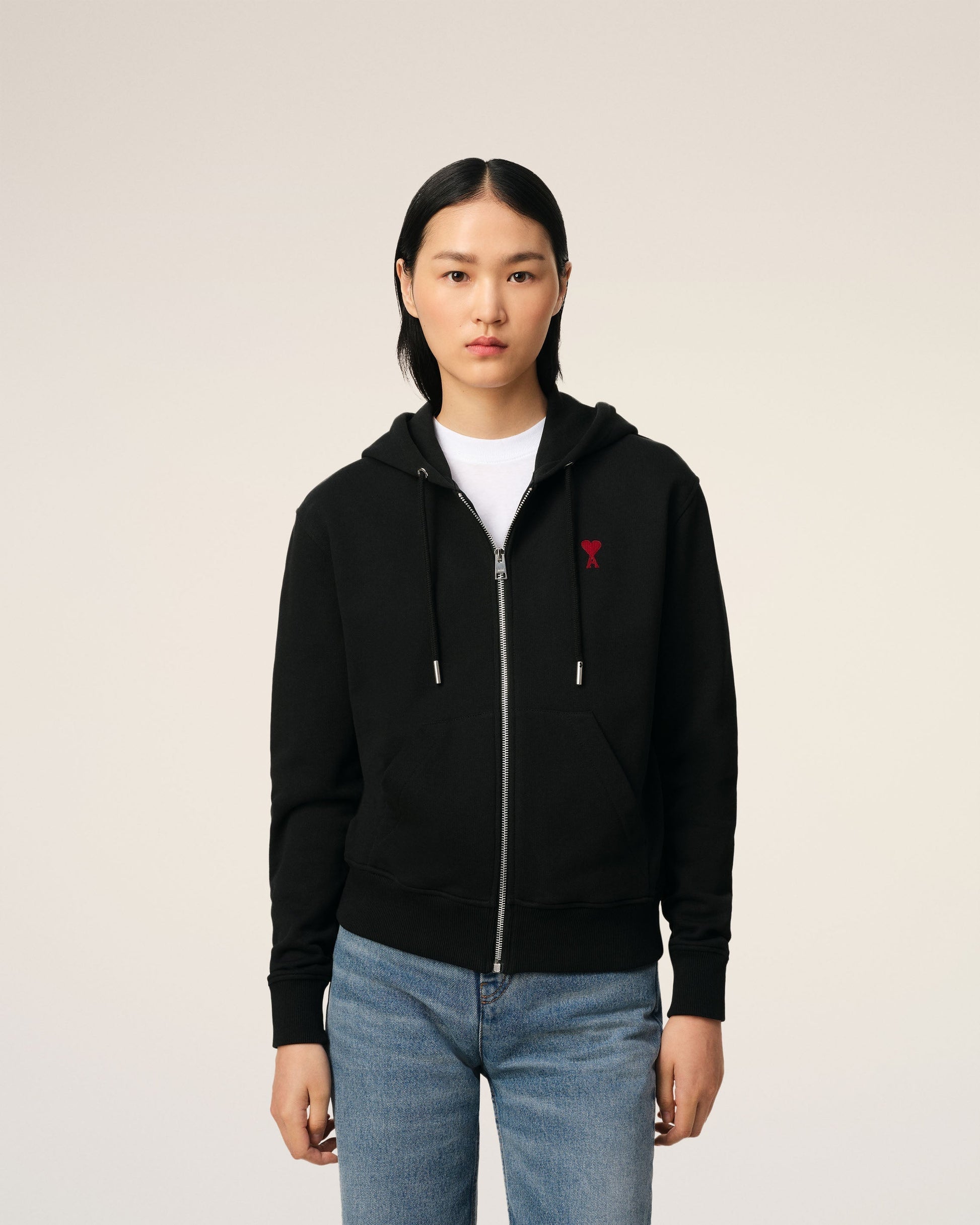 Zipped Ami de Coeur hoodie in loopback organic cotton fleece. Classic fit Unisex Product Nickel color metal zipper Red Ami de Coeur chest embroidery Tonal "ami" embroidery under back neckline Nickel color metal ends and engraved eyelets Puller "ami" engraved 60,5 cm center back length (size XS) 68,5 cm center back length (size M) Made in Portugal (with love) REF: BFUSW435.730.001
