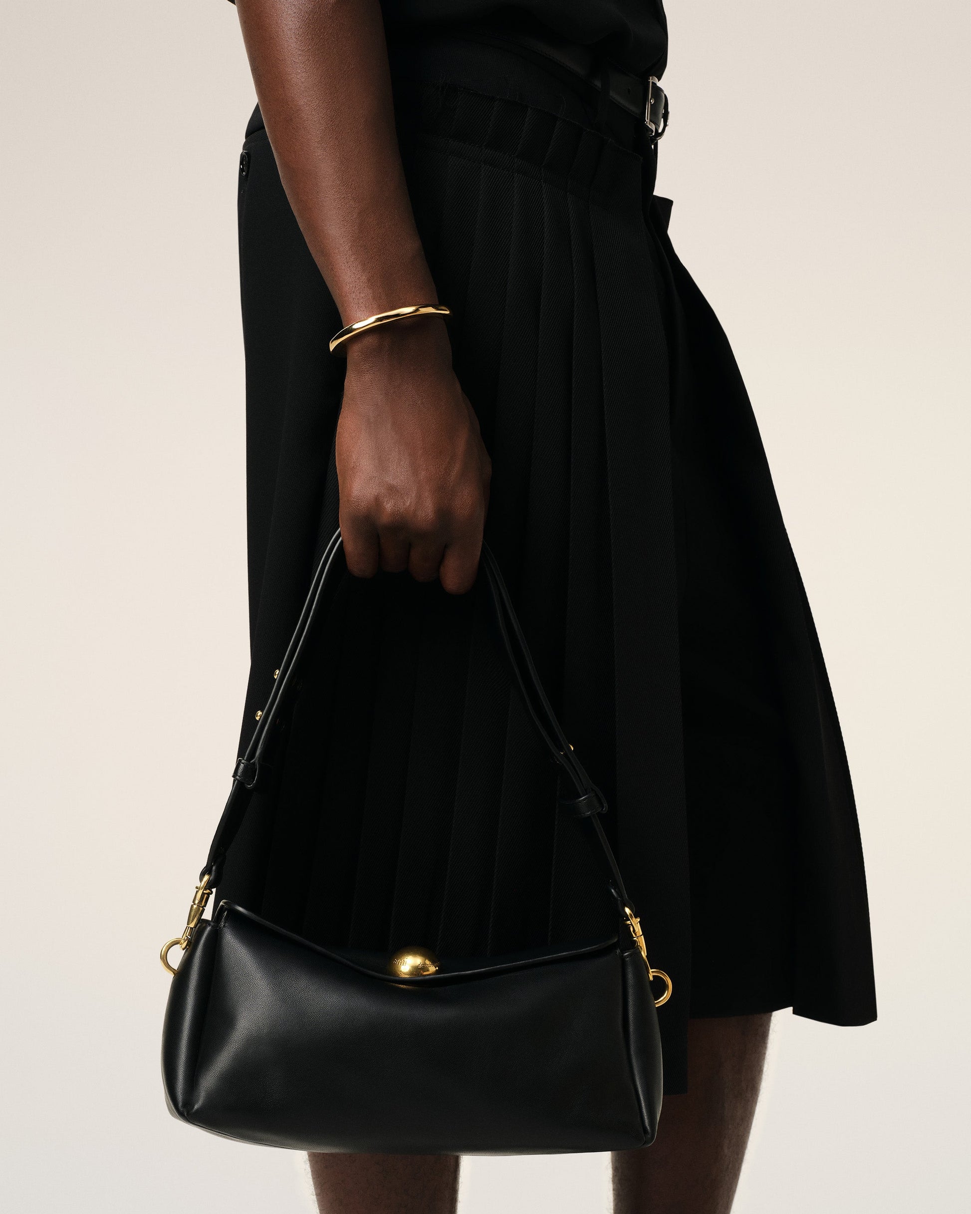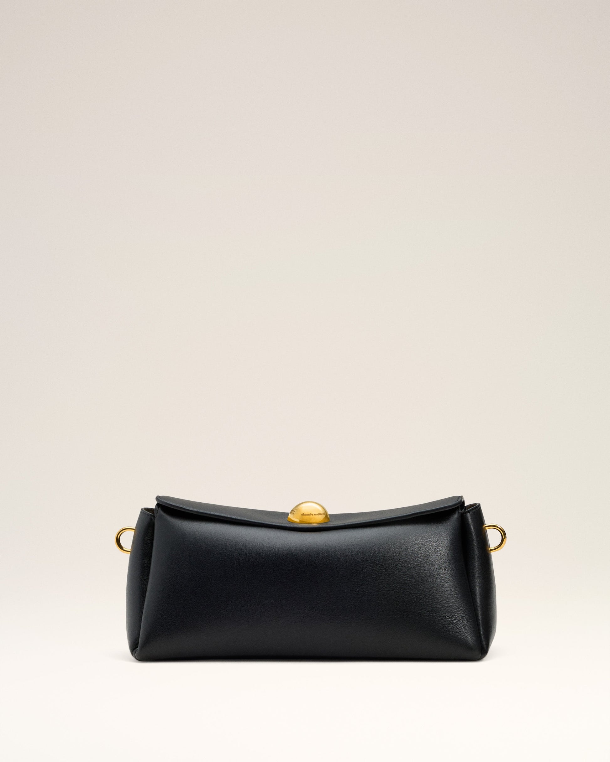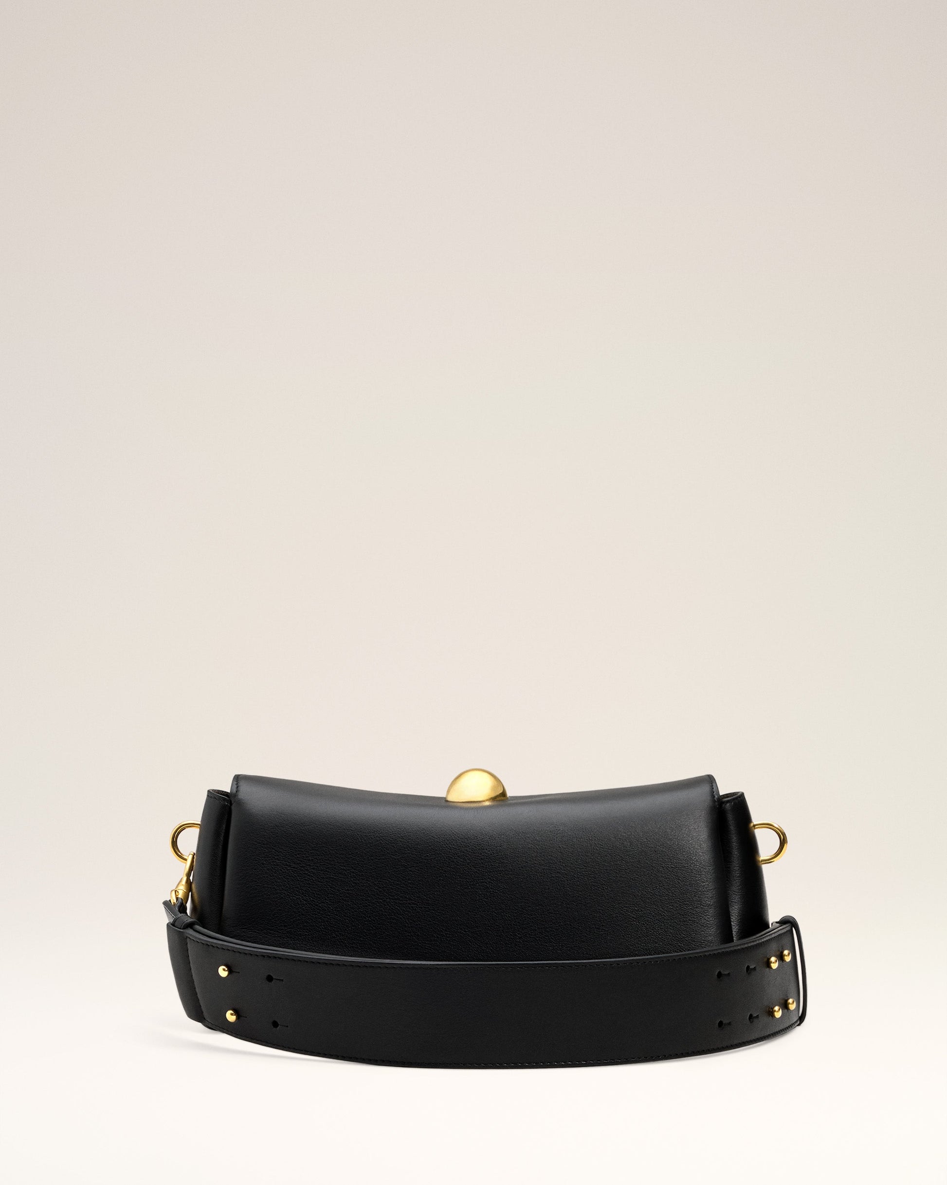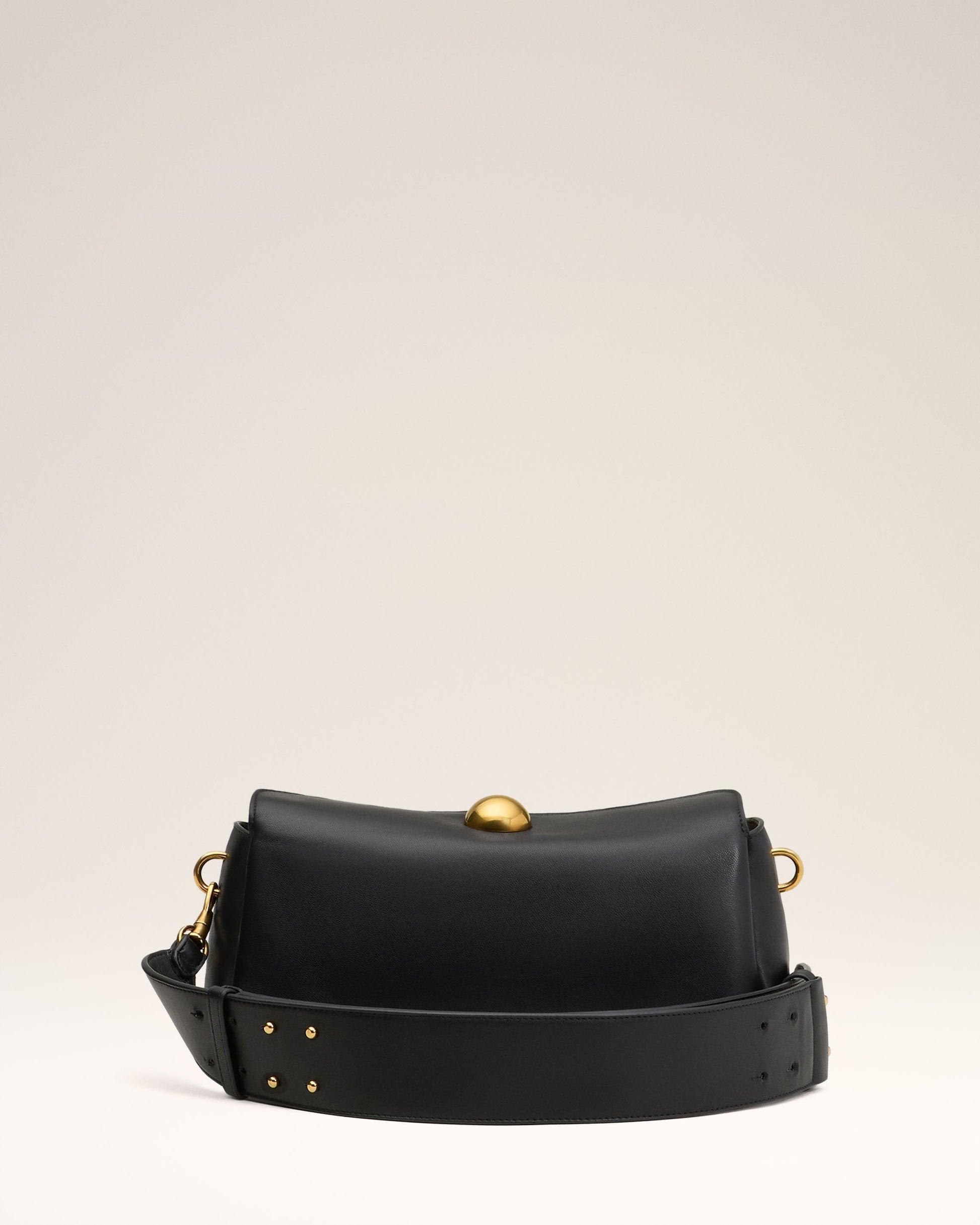Carrousel bag in smooth leather. Unisex product Calfskin Adjustable and removable leather strap, crossbody or shoulder carry Magnetic flap closure Metal hardware in vibrated brass color One main compartment with an inside patched pocket Suede leather lining Half sphere in metal with engraved "ami alexandre mattiussi" logo Size: 26 x 12 x 10.5 cm Made in Spain (with love) REF: ULL027.AL0103.001