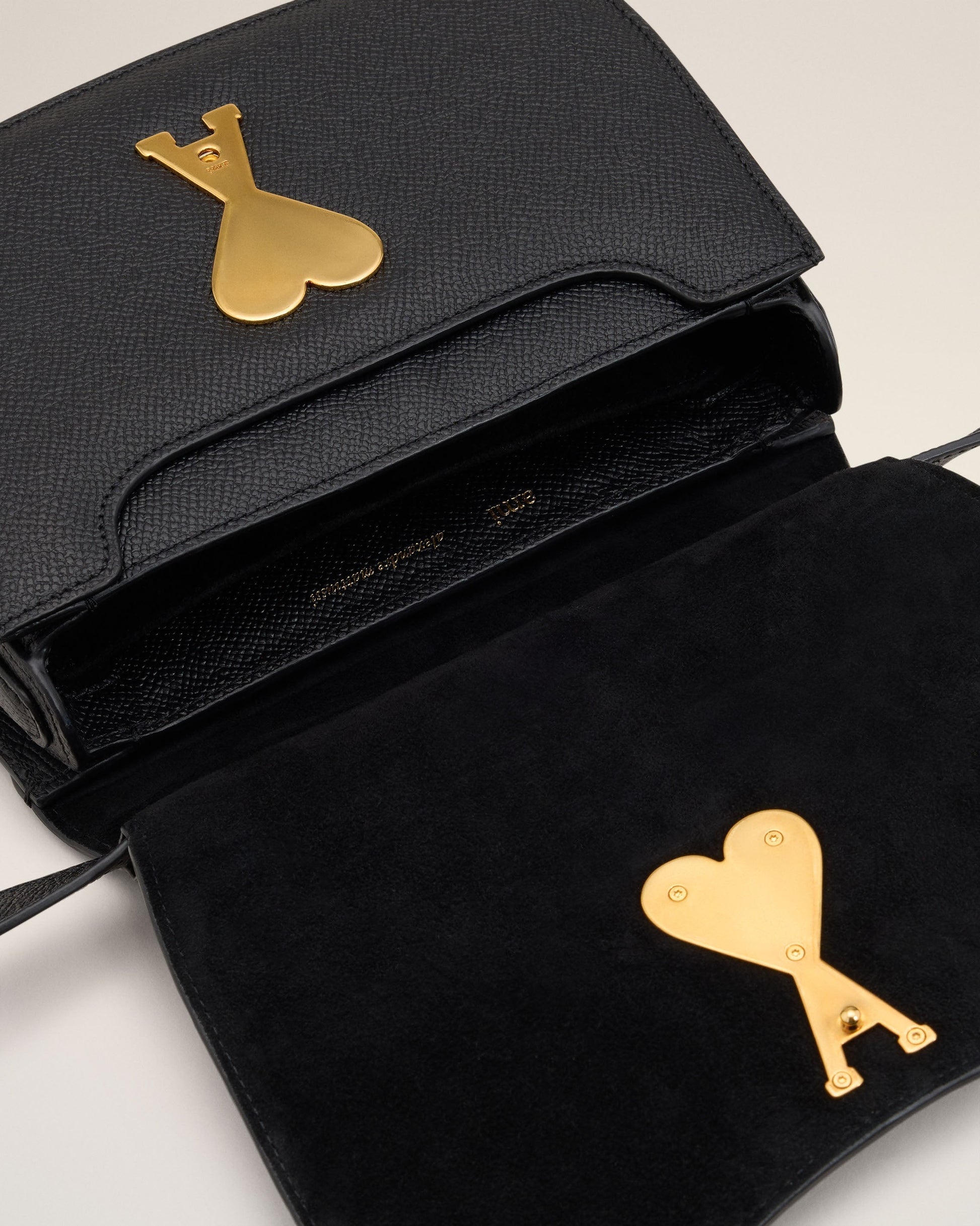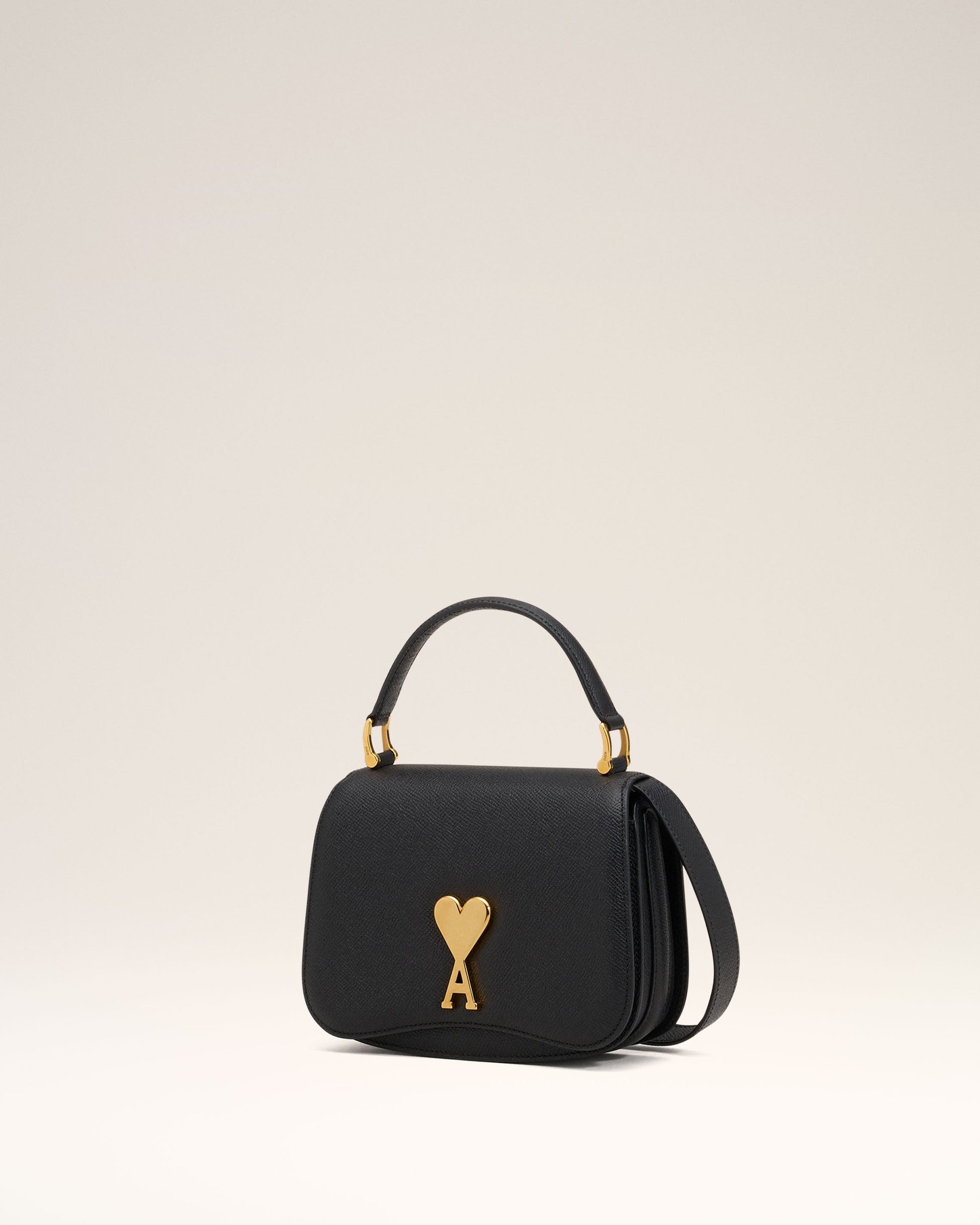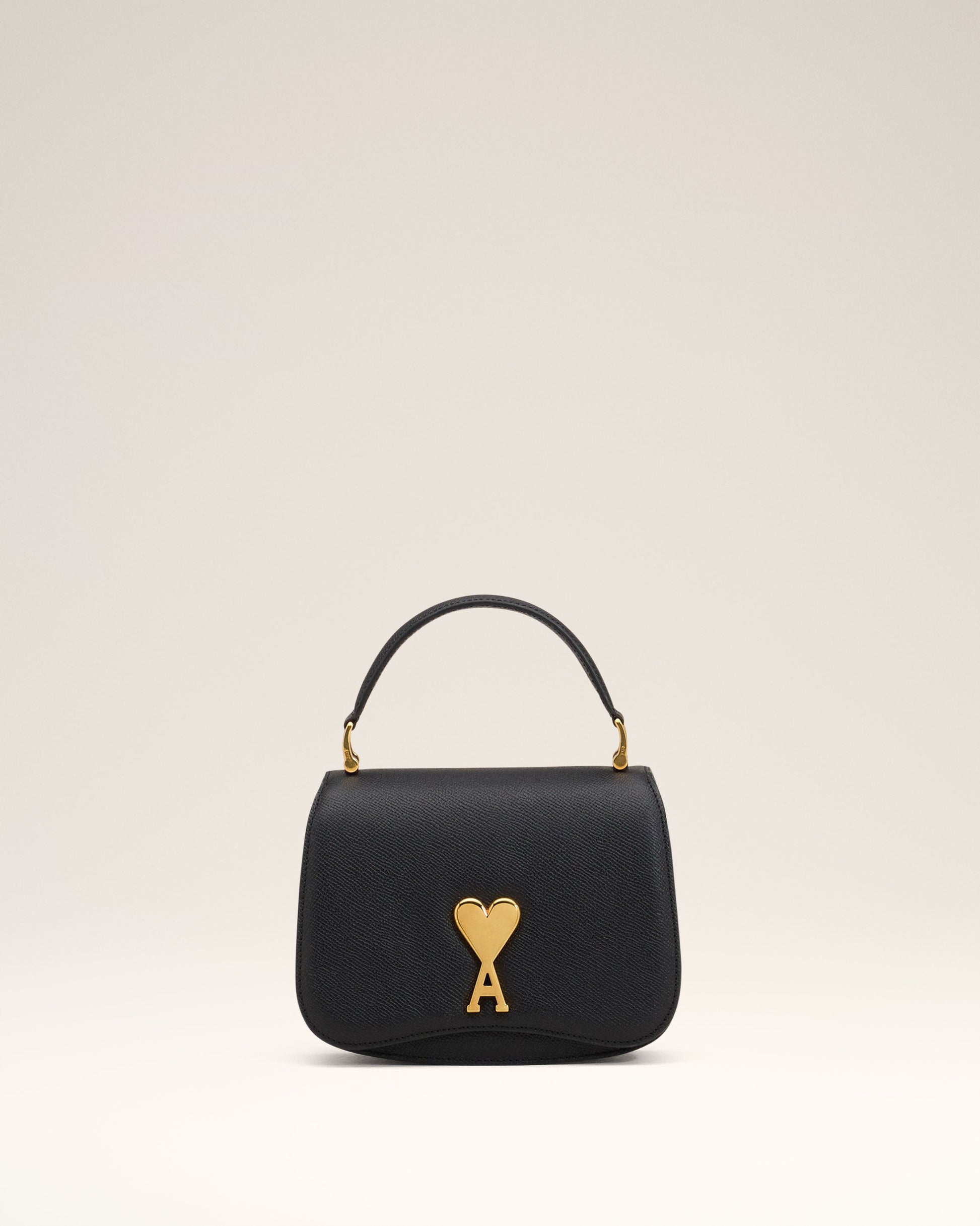 Top handle Paris Paris bag in grained leather. Suede lambskin lining Ami de Coeur clasp One central compartment with a patched pocket and one front compartment Adjustable and removable leather strap, crossbody or hand carry Vibrated brass metal hardware Size: 19x13x4 cm Made in Morocco (with love) REF: ULL007.AL0036.001
