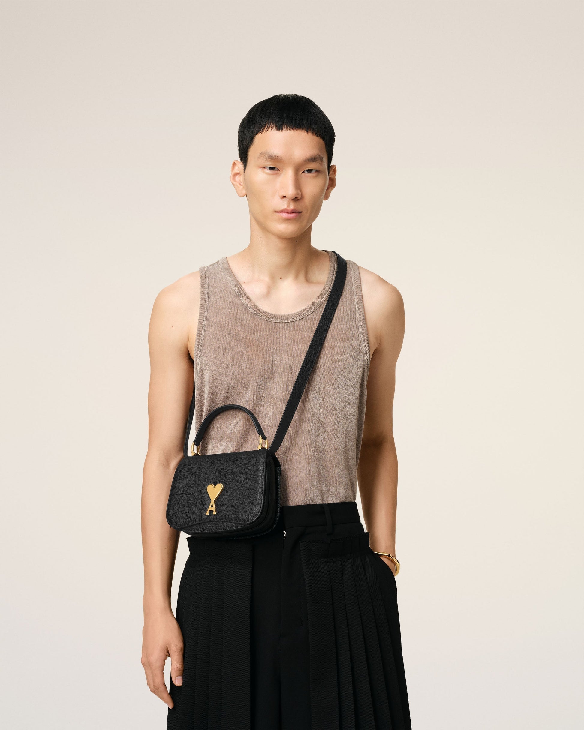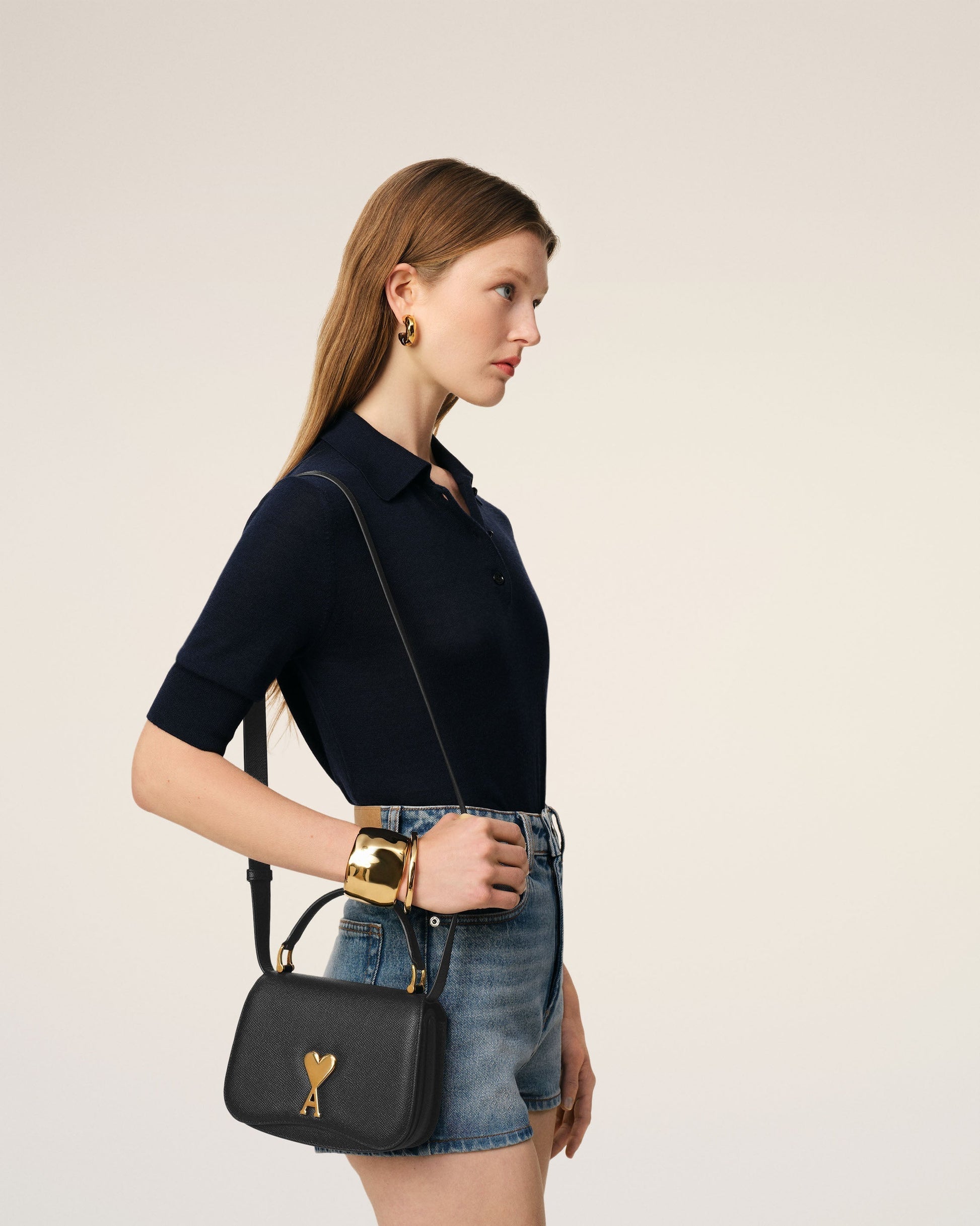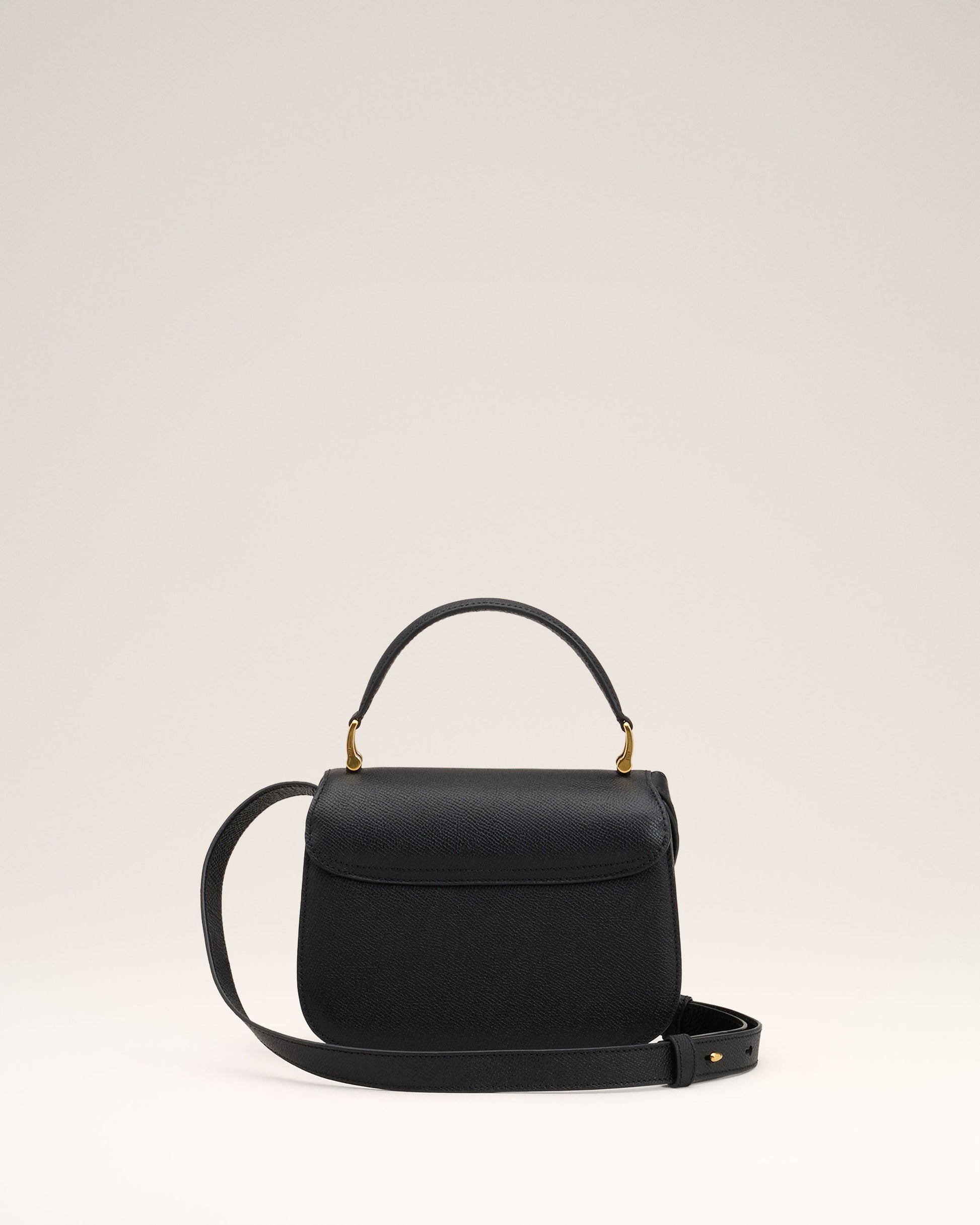 Top handle Paris Paris bag in grained leather. Suede lambskin lining Ami de Coeur clasp One central compartment with a patched pocket and one front compartment Adjustable and removable leather strap, crossbody or hand carry Vibrated brass metal hardware Size: 19x13x4 cm Made in Morocco (with love) REF: ULL007.AL0036.001
