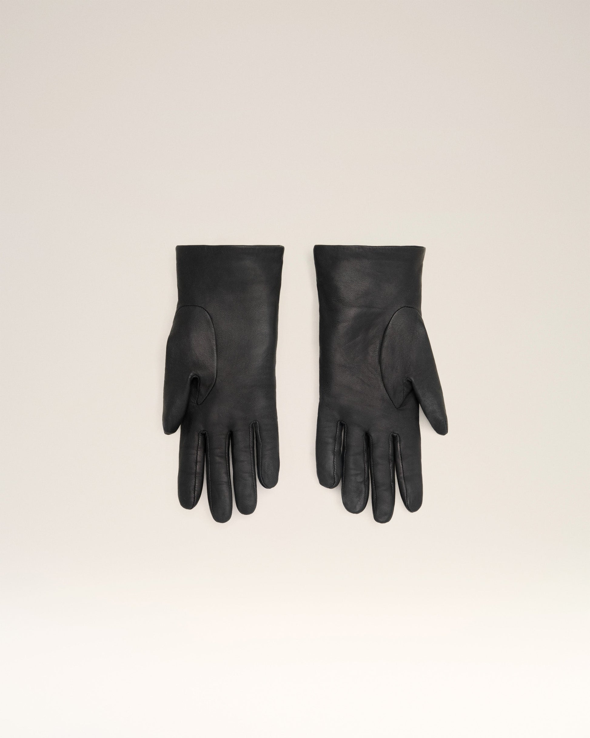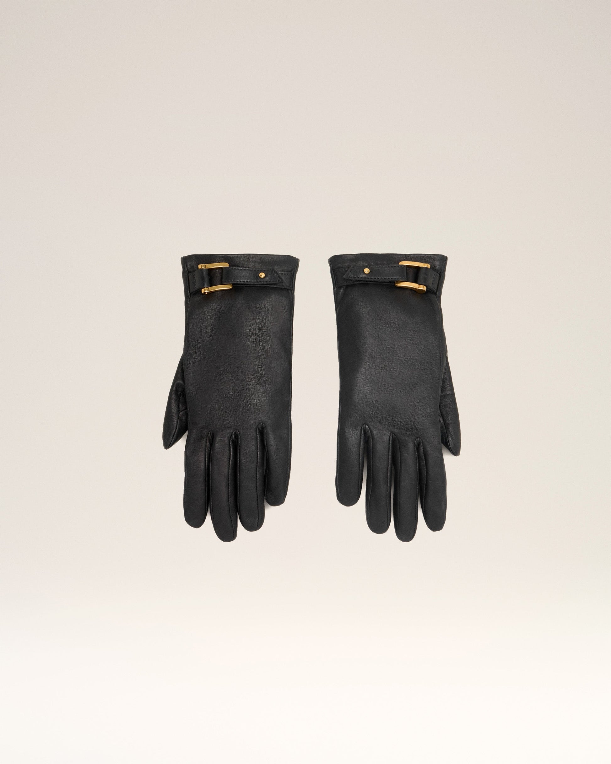 Gloves in smooth lambskin. Silk lining Metal hardware in vibrated brass color Thumb and forefinger are touch sensitive, compatible with smartphones Sizes: 6 / 7 / 8 Made in Philippines (with love) REF : FGV300.350.001