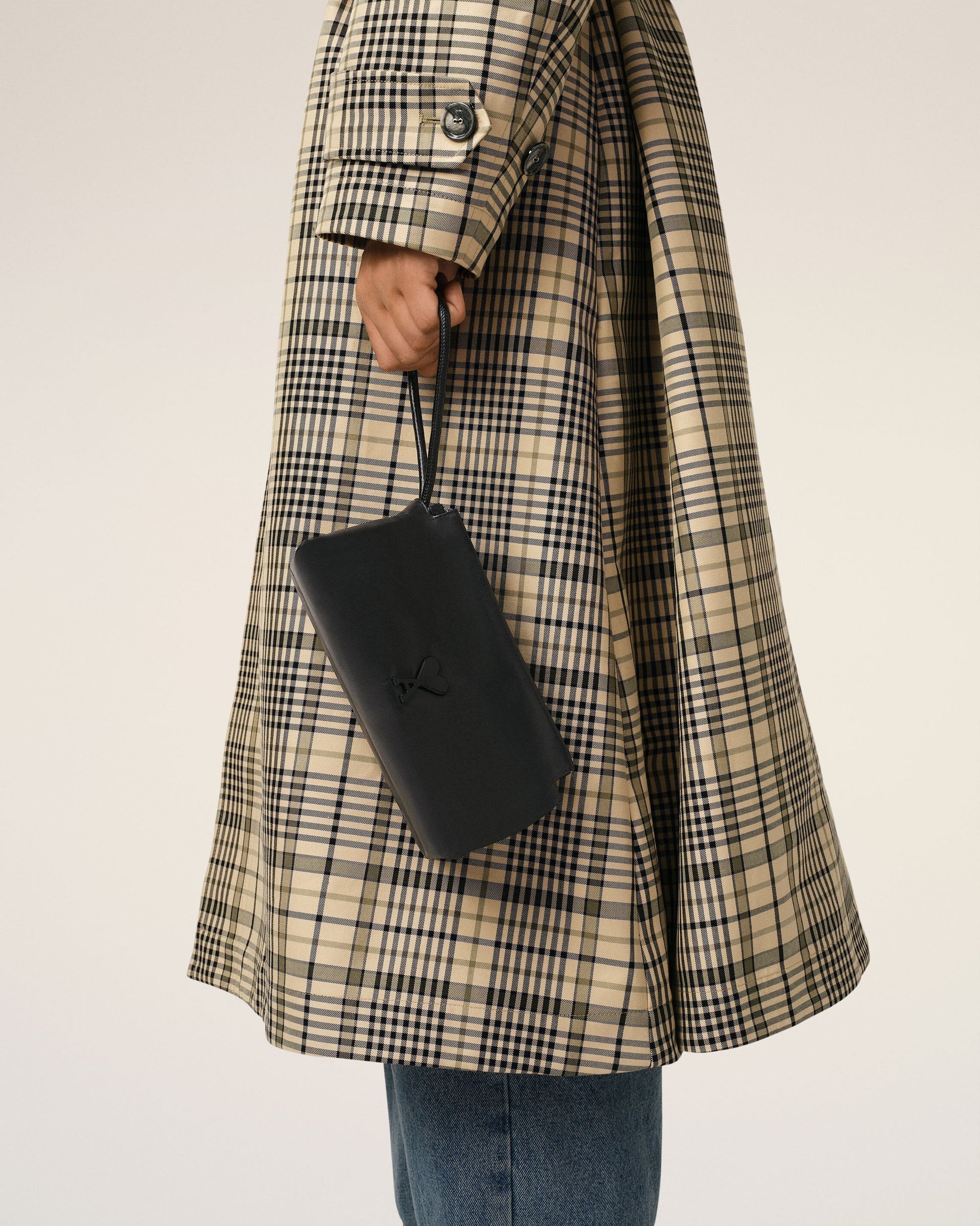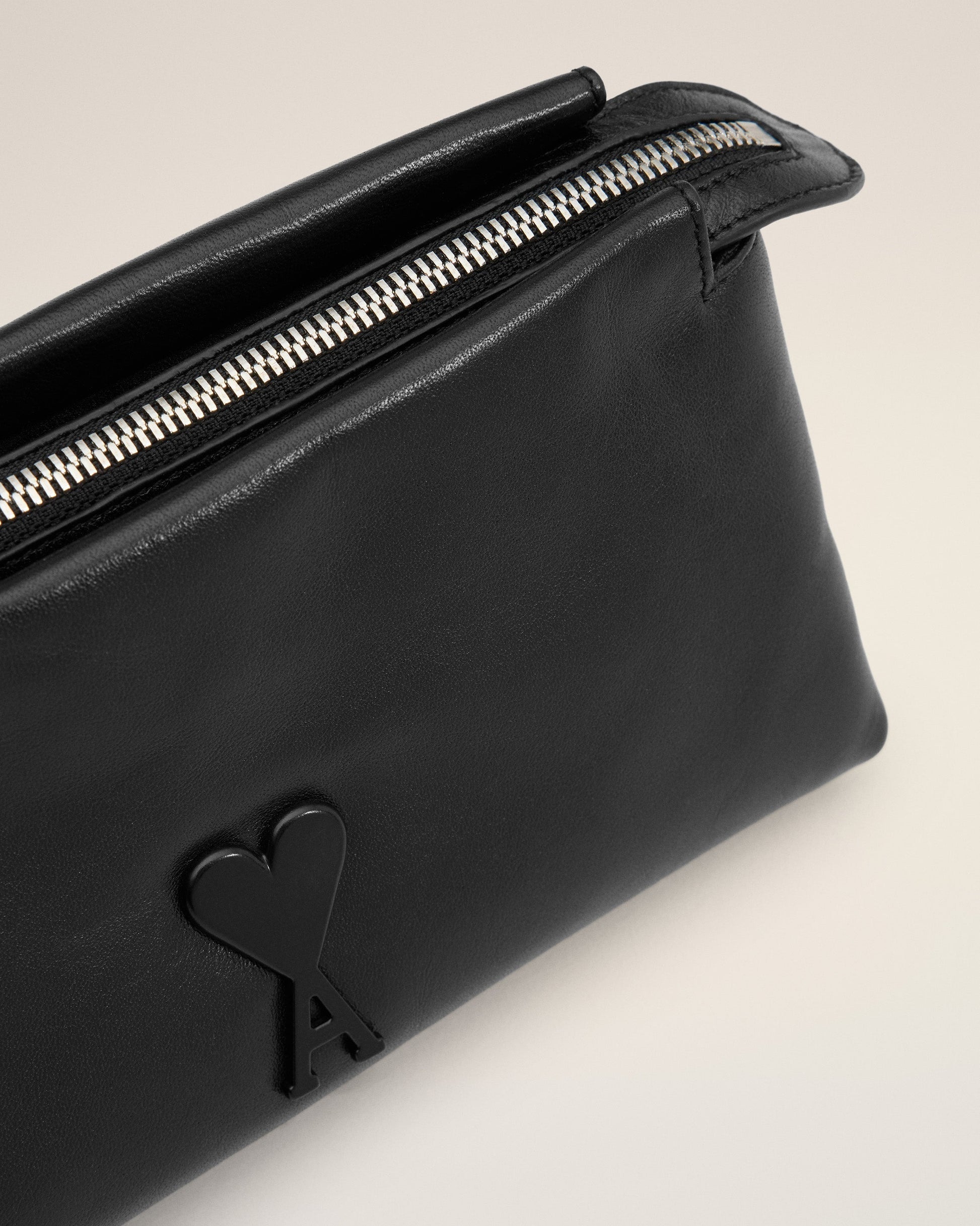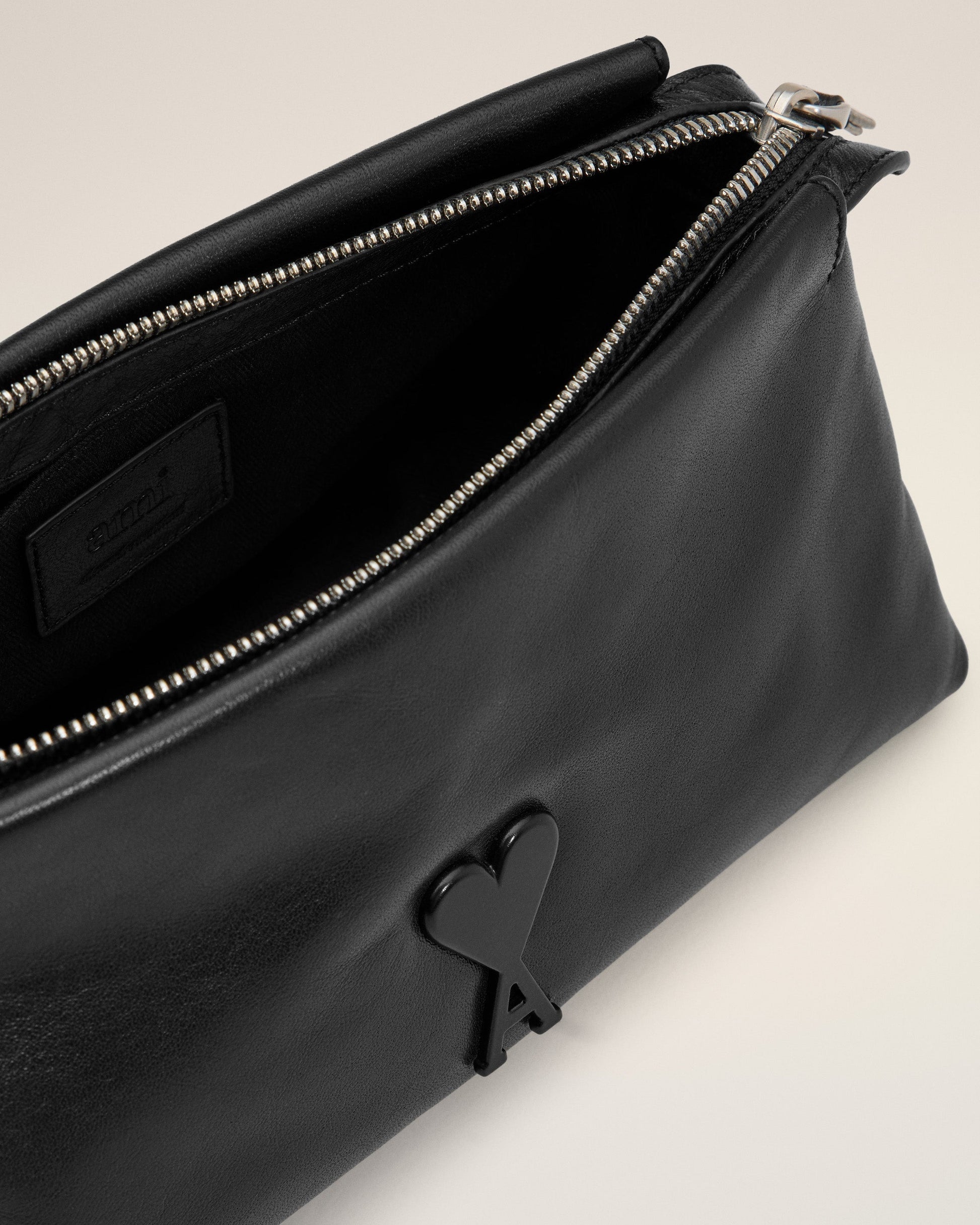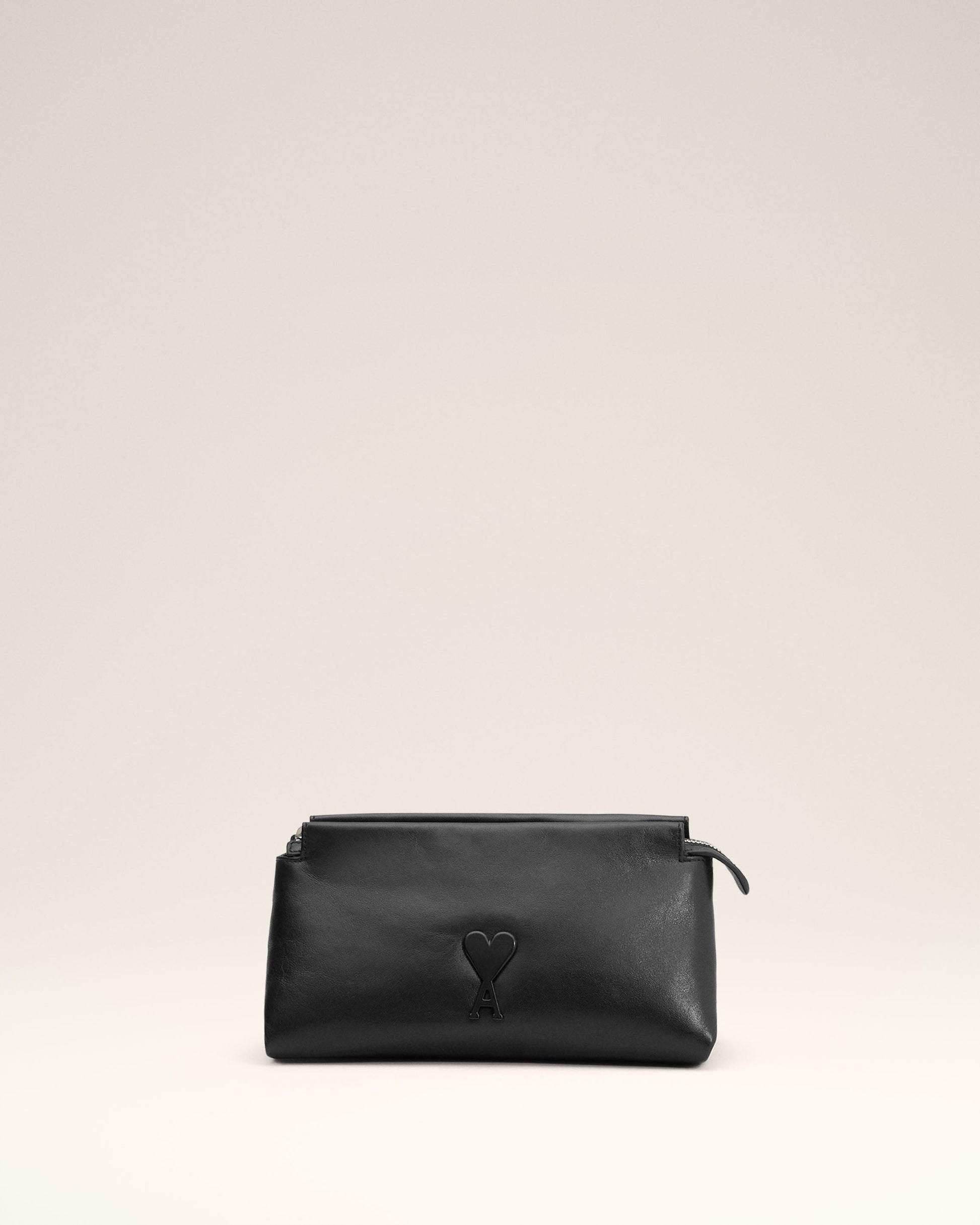 Voulez-Vous pouch in smooth leather. Herringbone cotton canvas lining Ami de Coeur stud One central zipped compartment and one inside patched pocket Leather strap, drop of 16 cm Metal hardware in vibrated silver color Size: 22x12x11.5 cm Made in Morocco (with love) REF: ULL700.AL0052.001