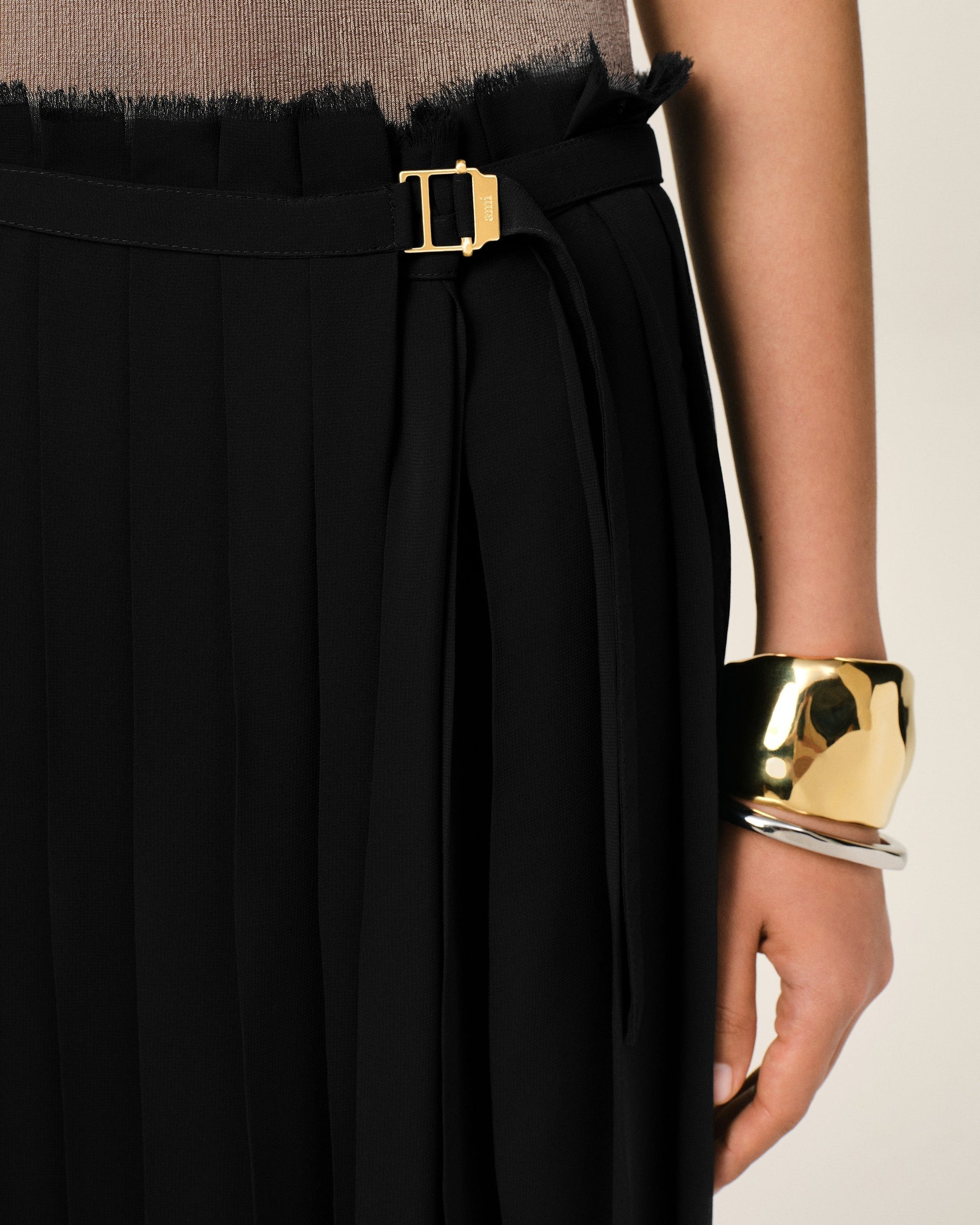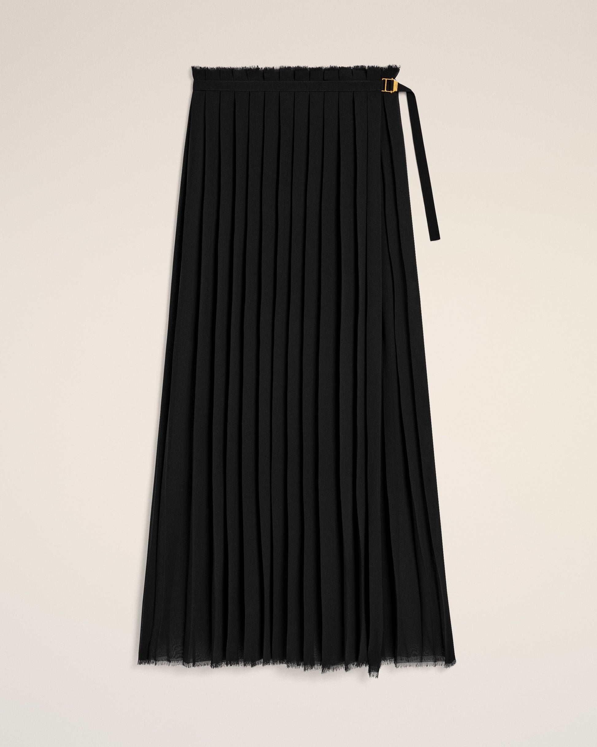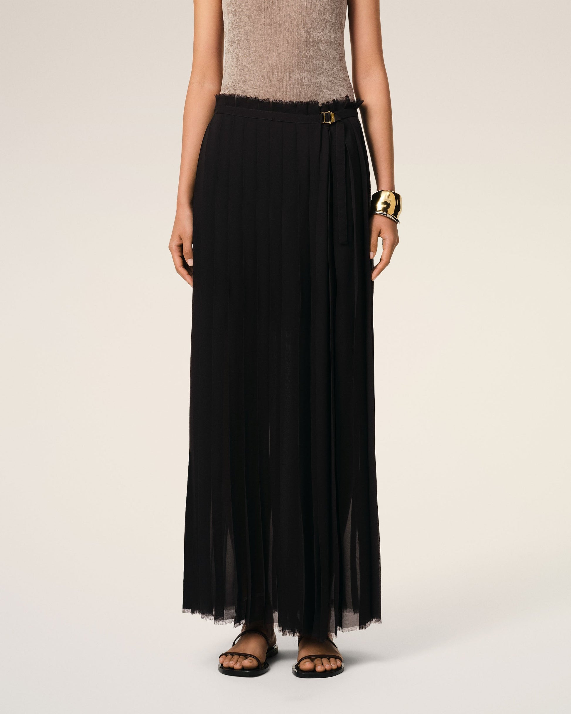 Long pleated skirt in polyester crepe. Length below waist 102 cm (size 36) Buckle at waist Can be worn low or regular waist thanks to adjustment buttons in waistband Removable lining Permanent pleats Made in Madagascar (with love) REF: FSK353.PL0027.001