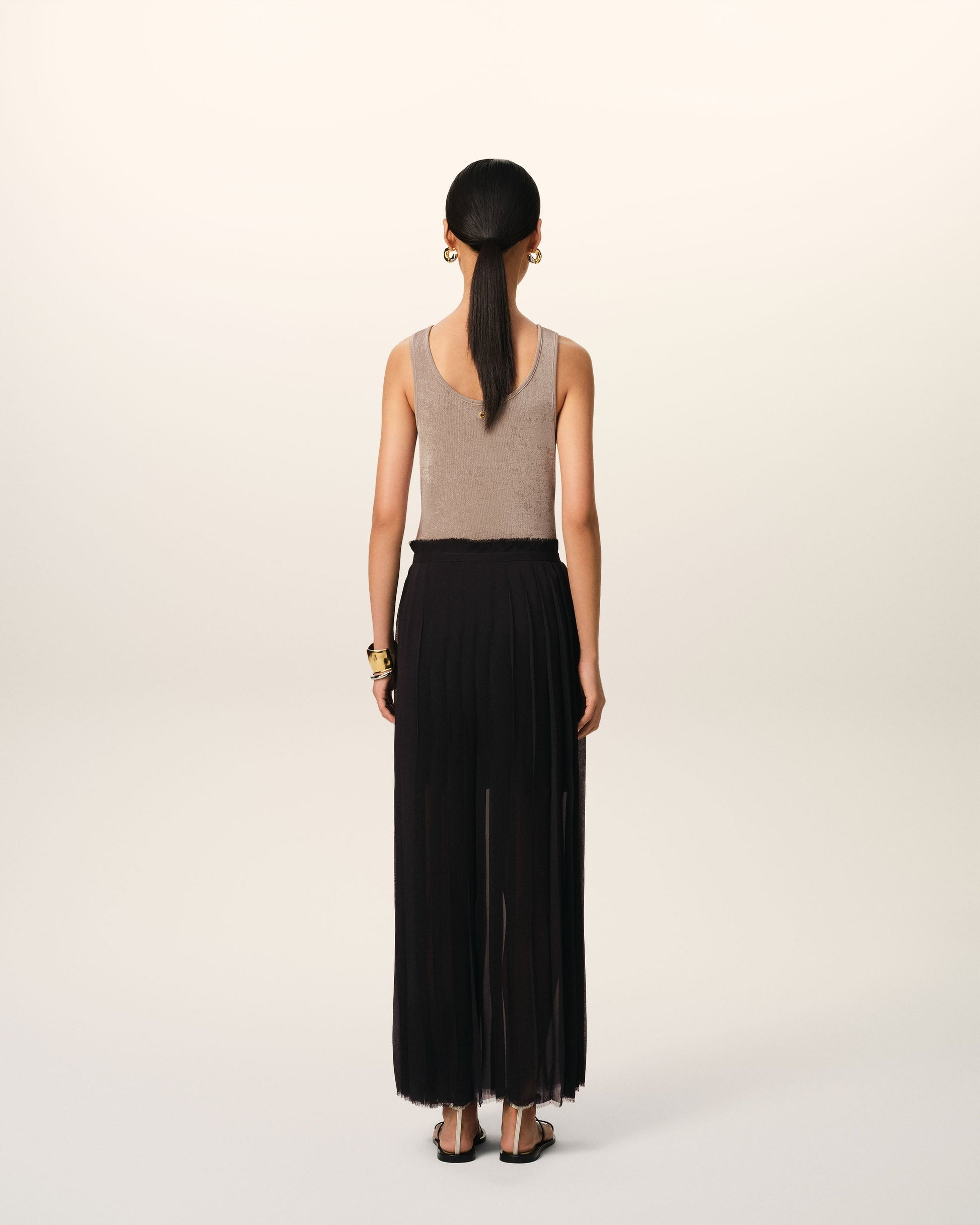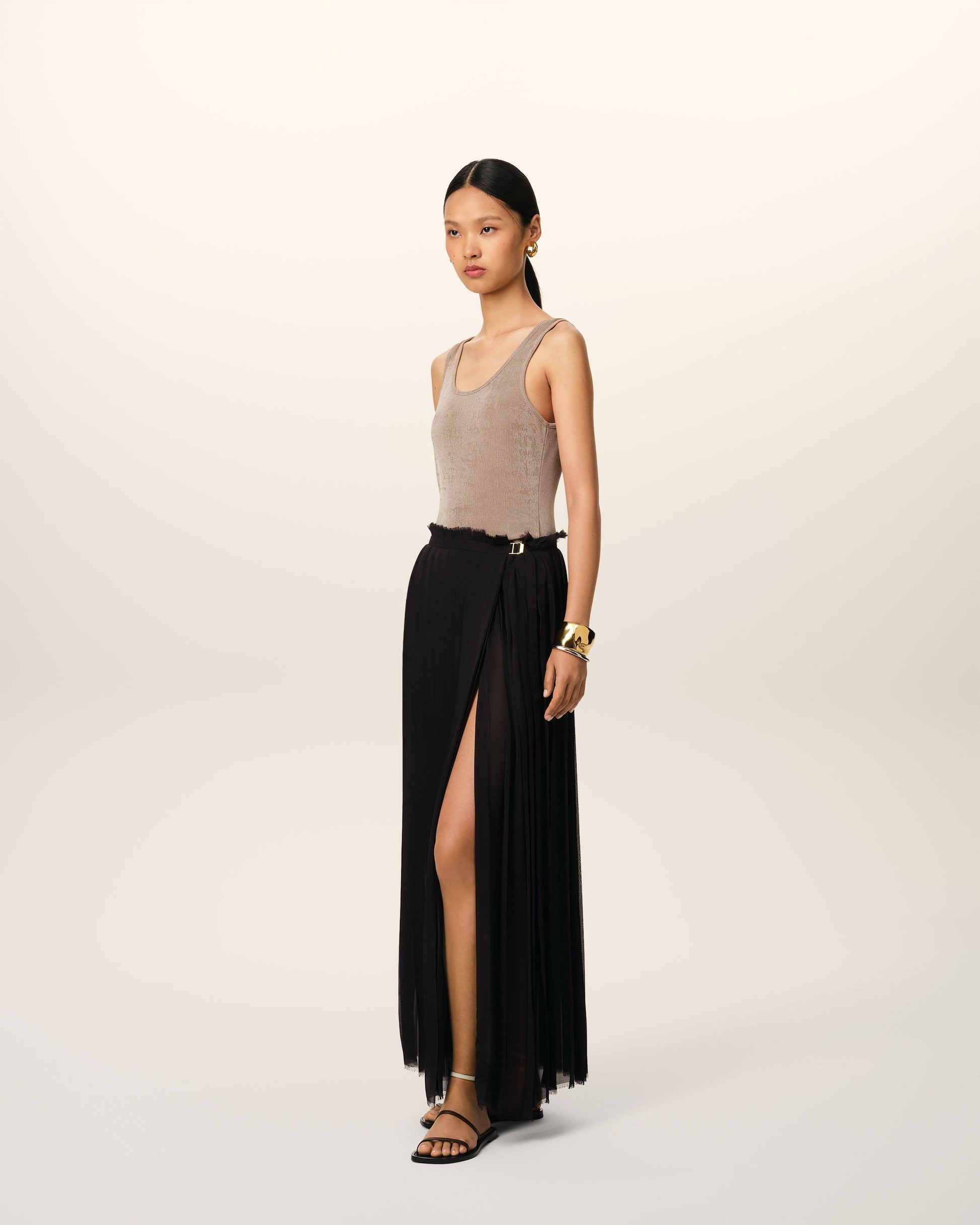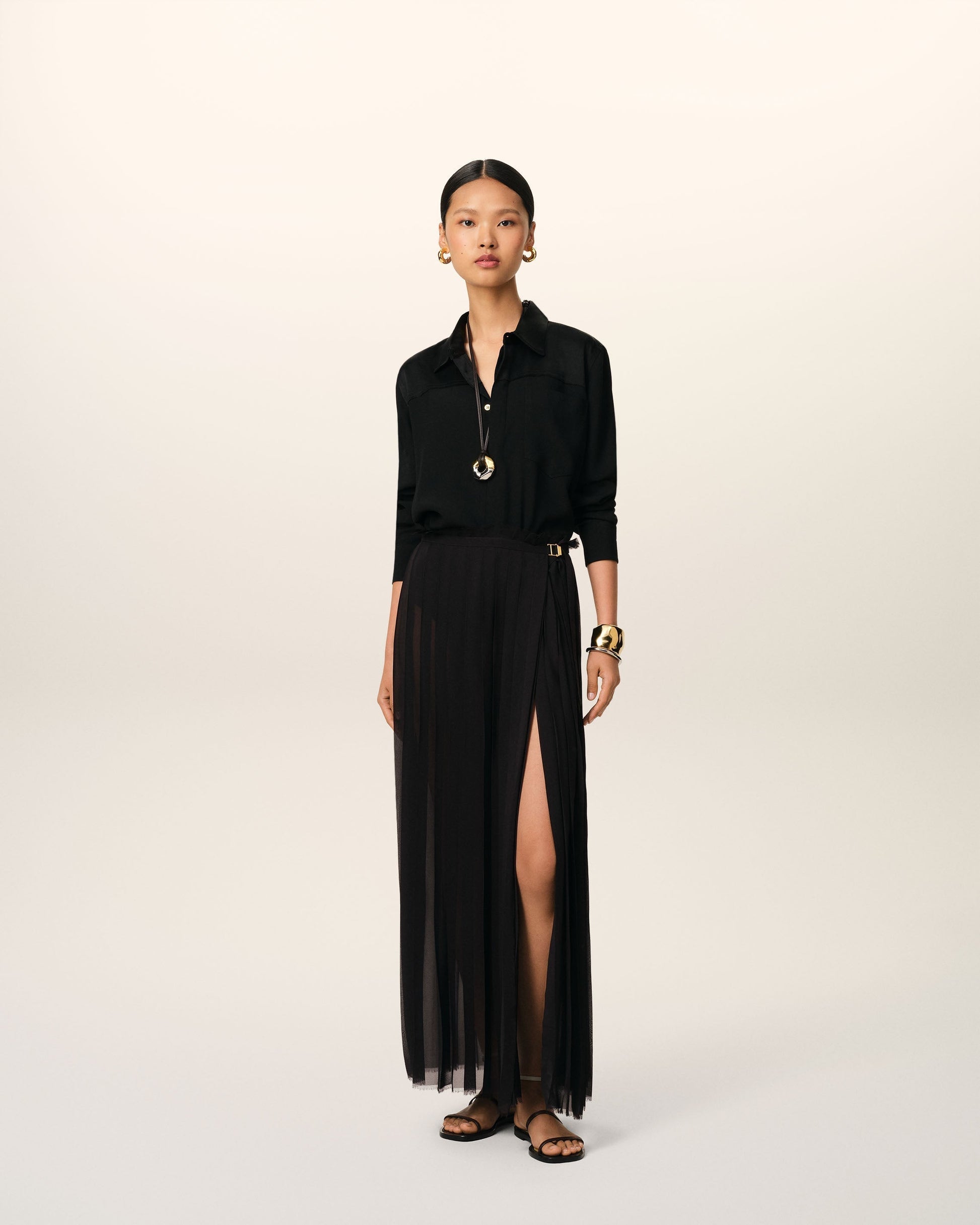Long pleated skirt in polyester crepe. Length below waist 102 cm (size 36) Buckle at waist Can be worn low or regular waist thanks to adjustment buttons in waistband Removable lining Permanent pleats Made in Madagascar (with love) REF: FSK353.PL0027.001