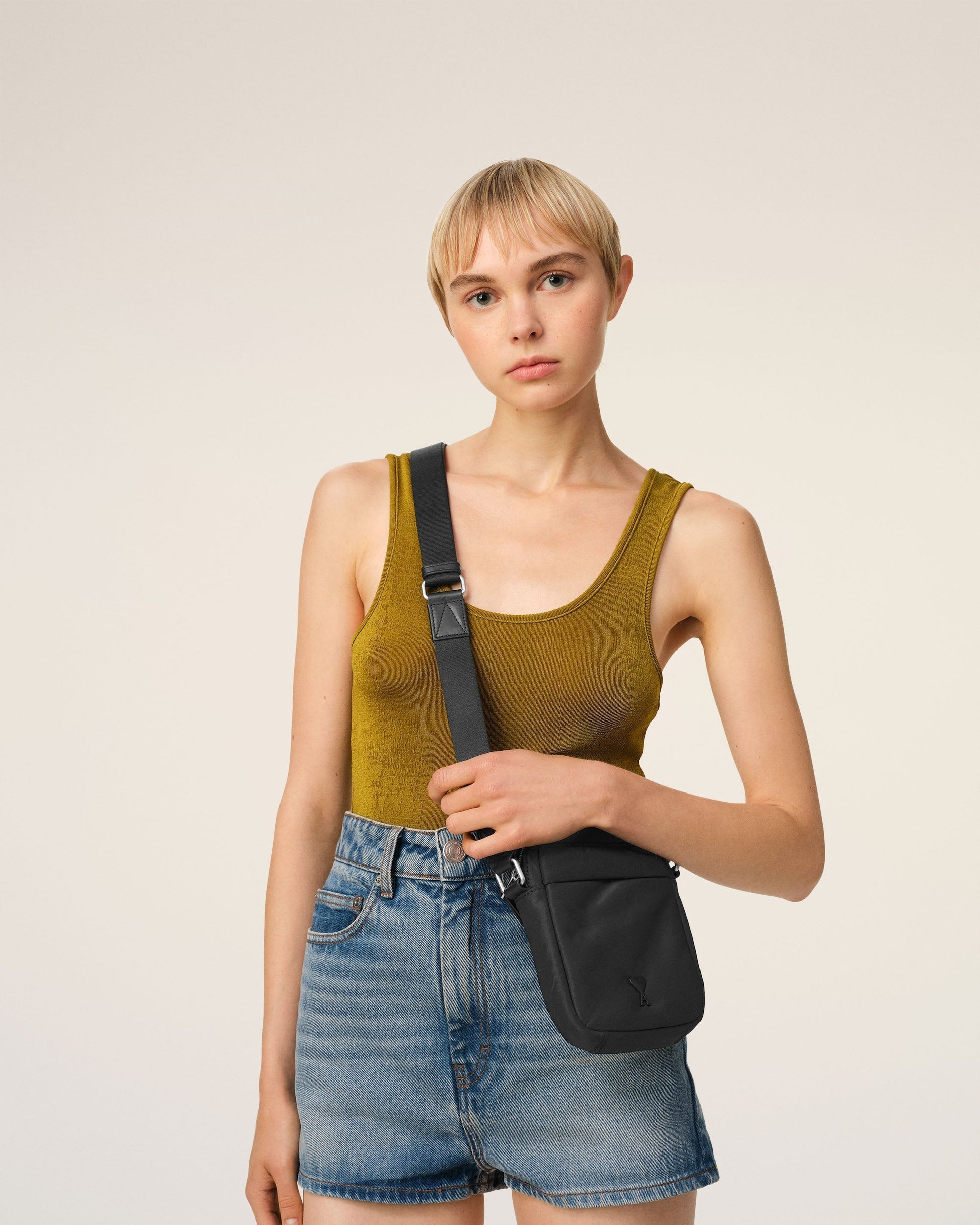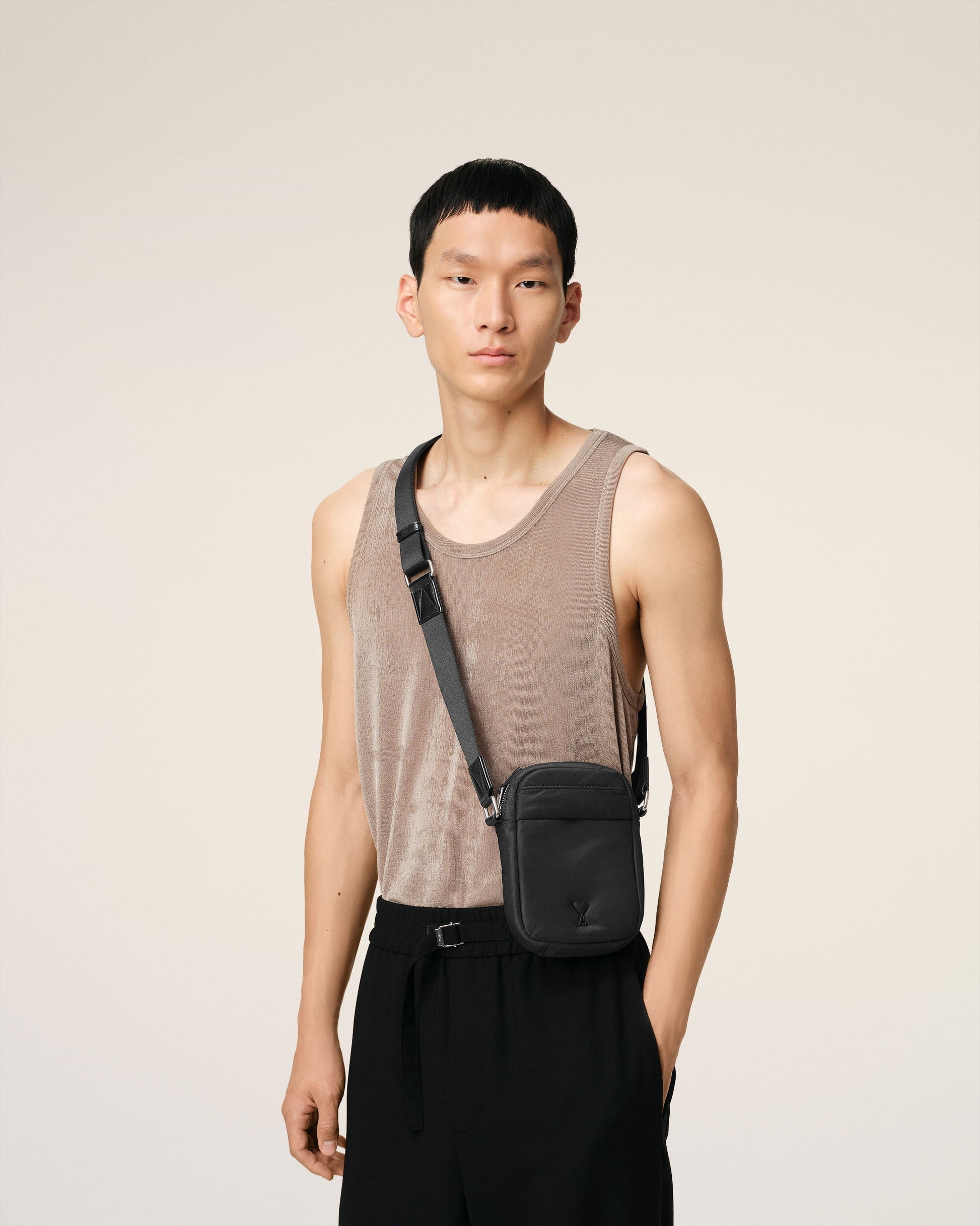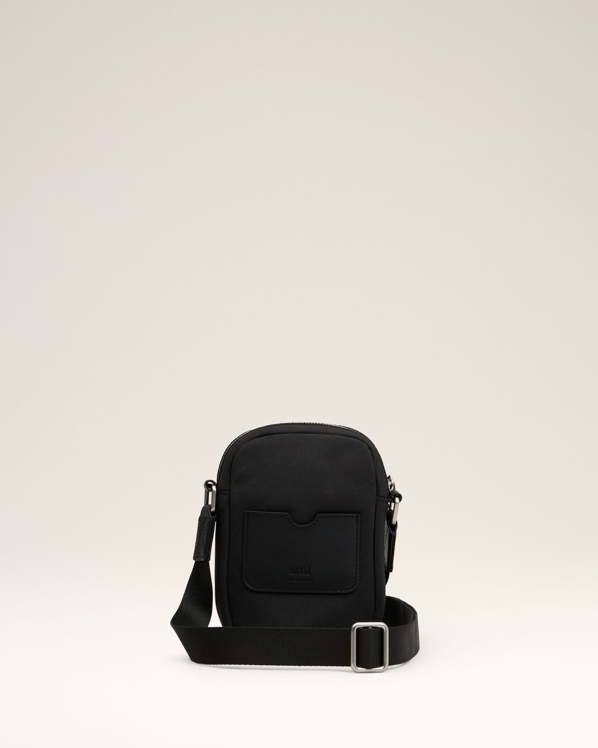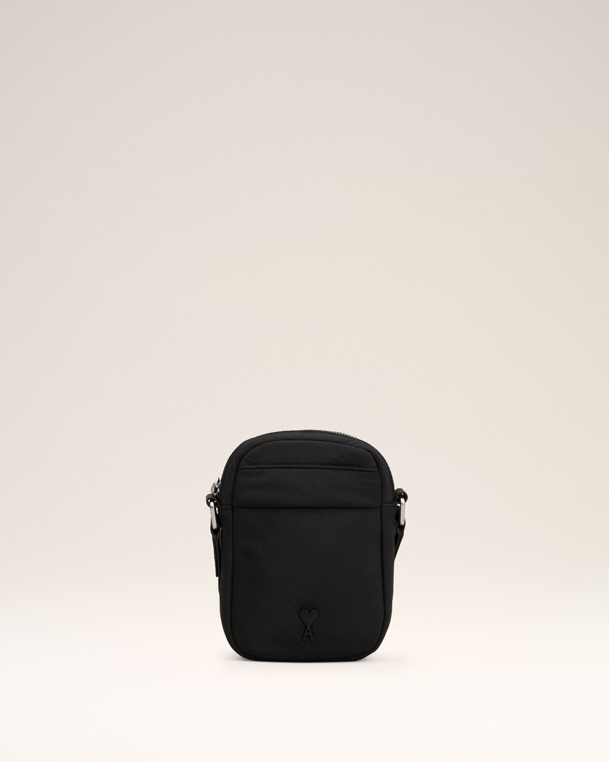 Small crossbody pocket bag in padded nylon canvas. Water-repellent nylon canvas Nylon canvas lining Ami de Coeur stud Zipped main pocket with inside patched pocket in padded mesh Front pocket with snap button fastening Leather patched pocket on the back with embossed logo Adjustable strap, crossbody carry Metal hardware in vibrated silver color Details in smooth leather Size: 18x13x4 cm Made in China (with love) REF: ULL011.AW0021.001