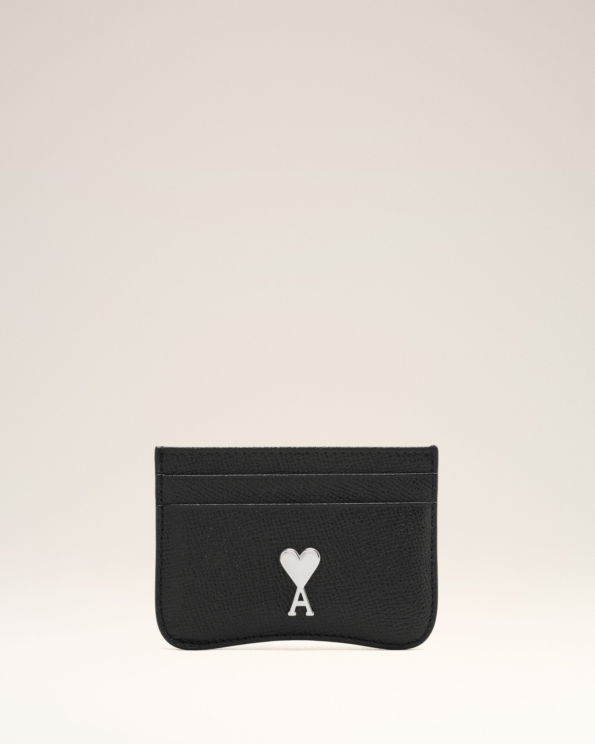 Paris Paris card holder in grained leather. Cotton canvas lining Ami de Coeur stud Two card compartments on each side One central card compartment Metal hardware in vibrated silver color Size: 10.5x7.5 cm Made in Morocco (with love) REF: USL104.AL0036.0014