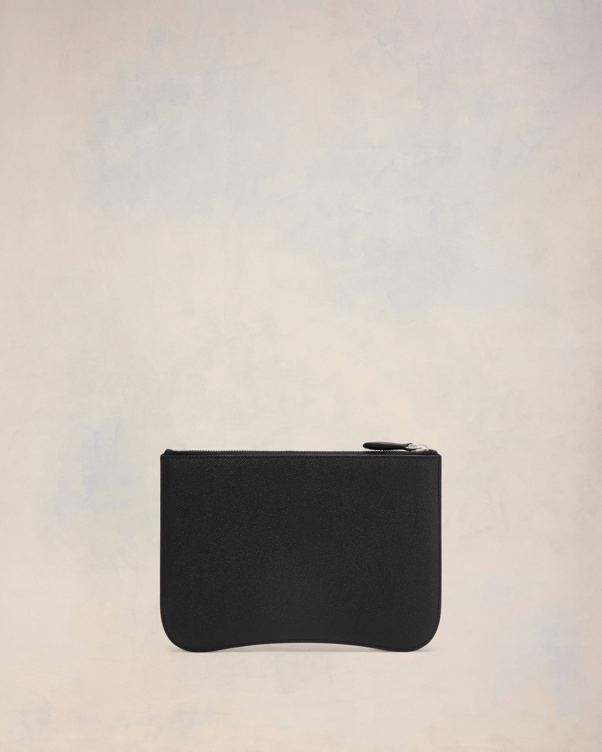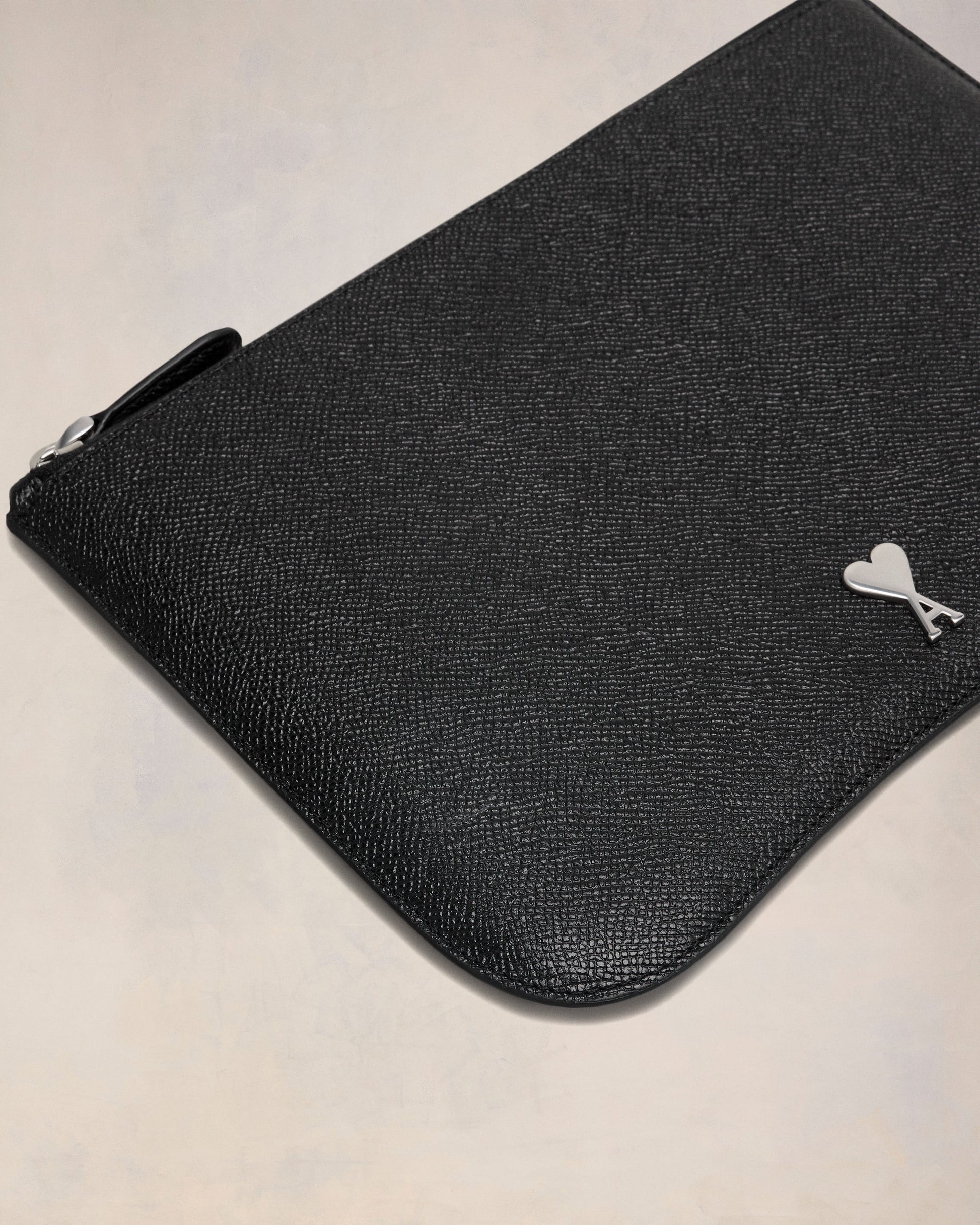 Paris Paris pouch in grained leather. Cotton canvas lining Ami de Coeur stud One central compartment with one inside patched pocket Metal hardware in vibrated silver color Size: 25x17.5 cm Made in Morocco (with love) REF: USL025.AL0036.0014