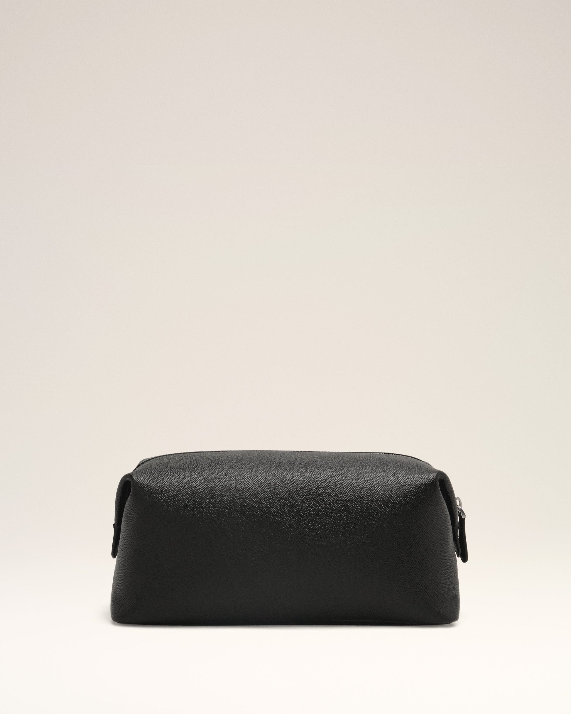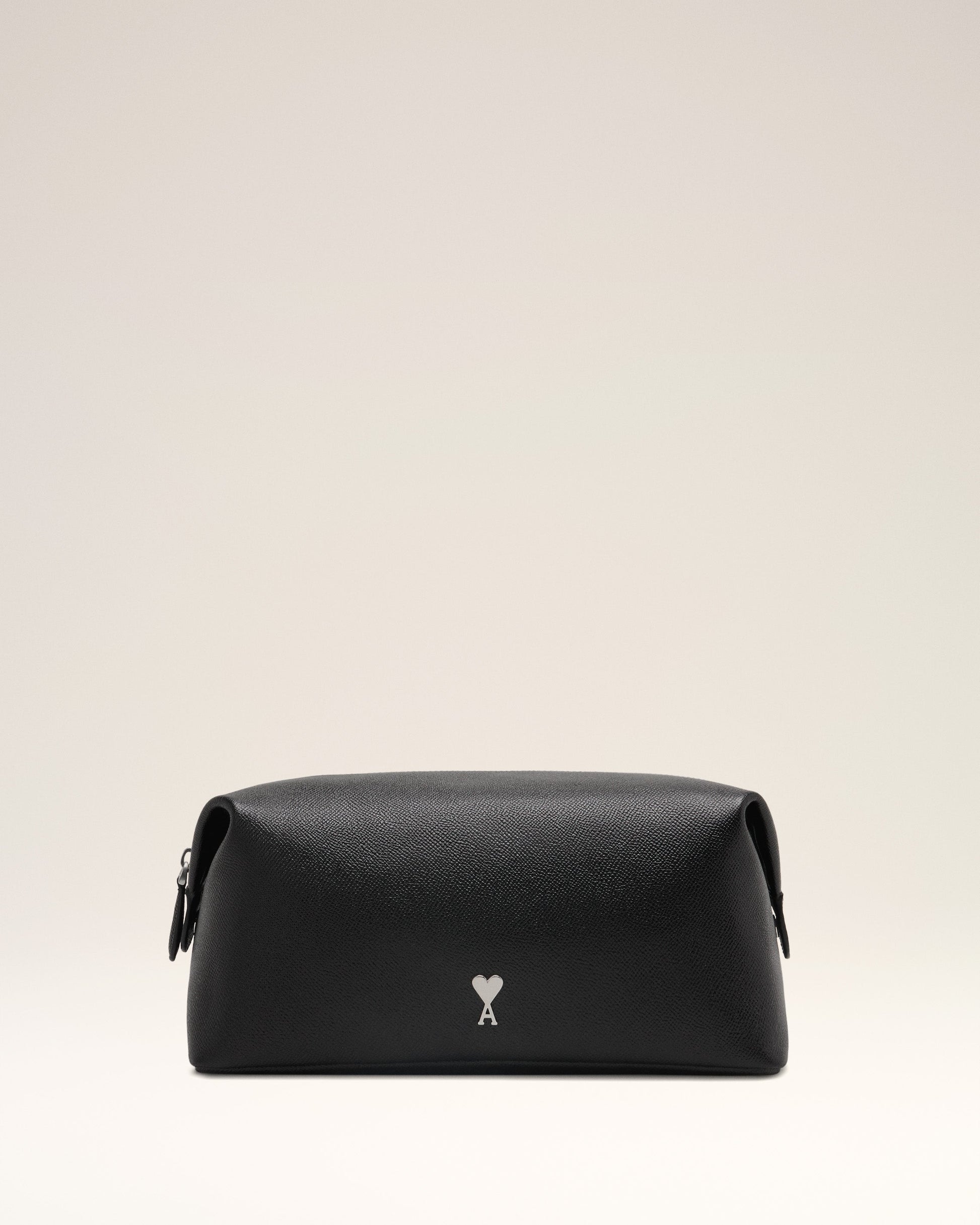 Paris Paris toiletry pouch in grained leather. Waterproof nylon canvas lining Ami de Coeur stud One zipped compartment with three inside patched pockets Metal hardware in vibrated silver color Size: 29x13x14 cm Made in Morocco (with love) REF: USL502.AL0036.0014