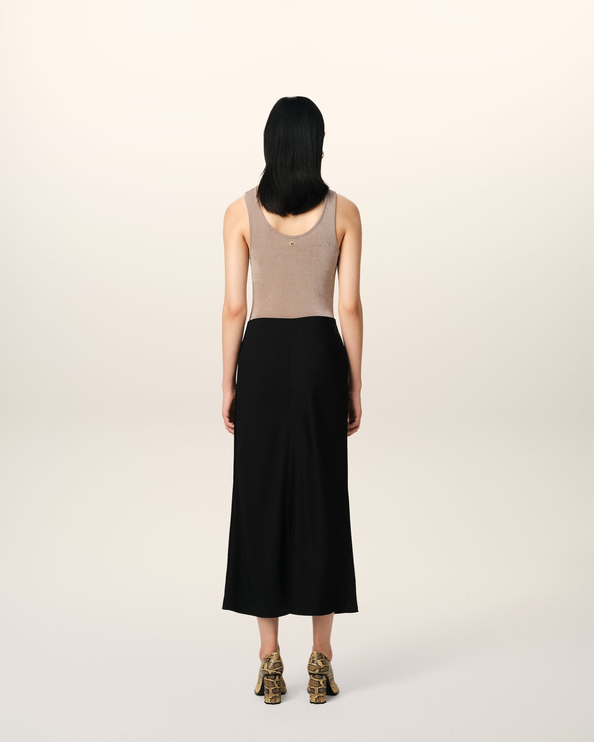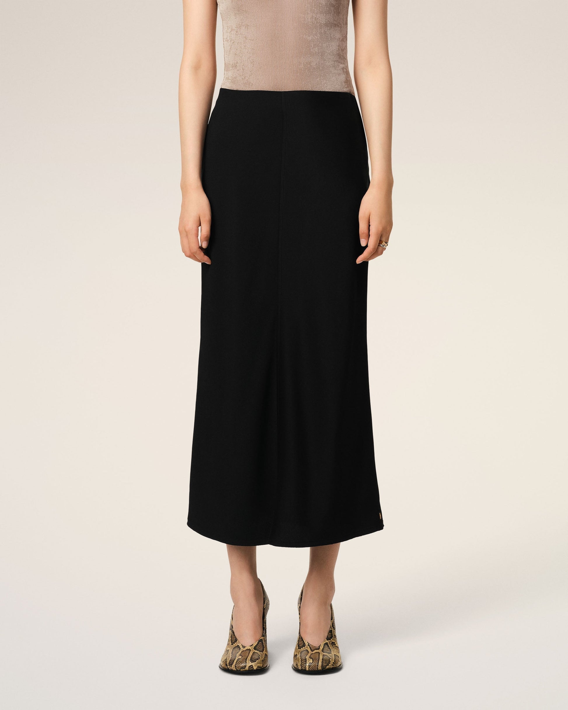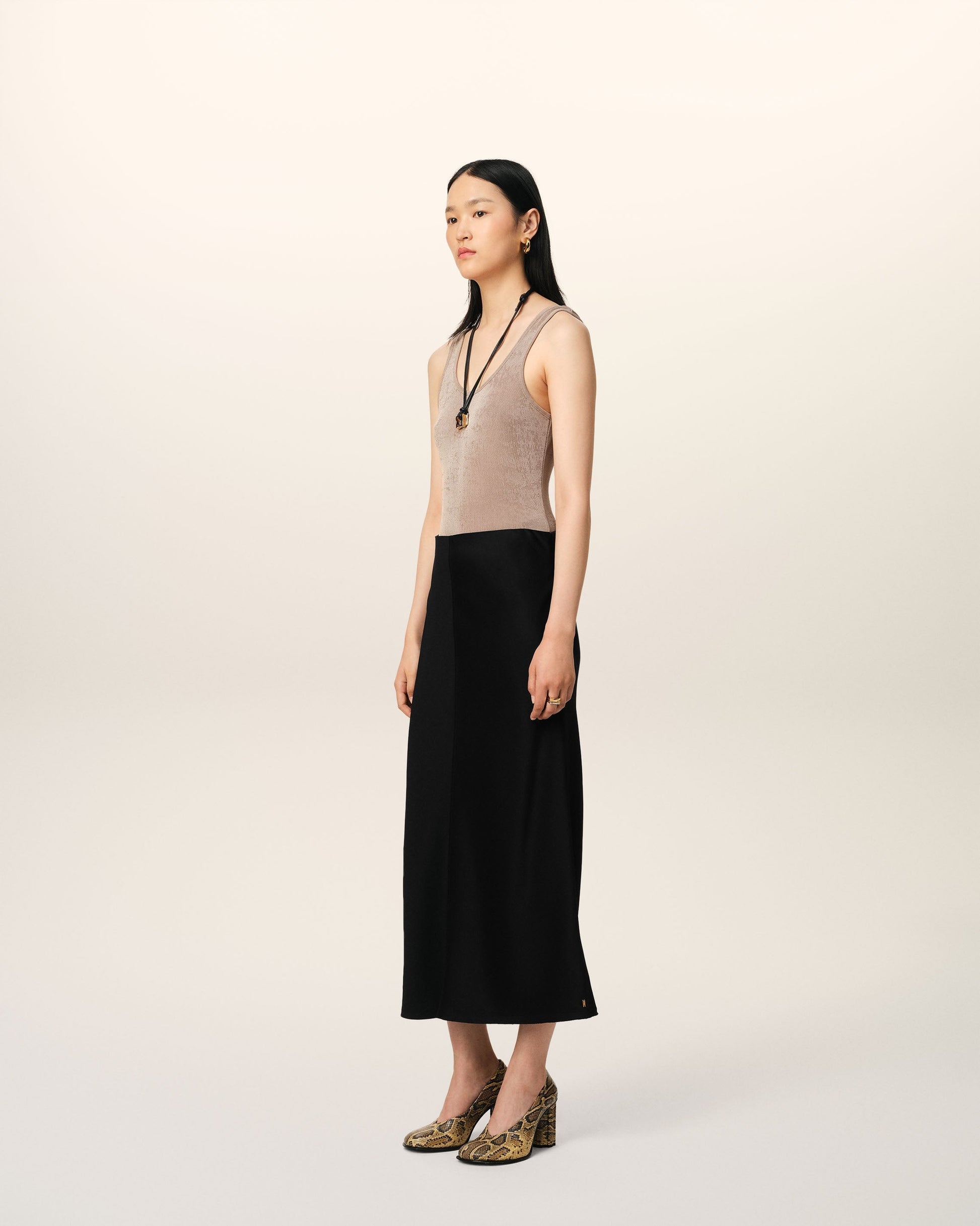 Midi skirt in viscose and acetate. Straight fit 88 cm center back length (size 36) Ami de Coeur mini plate on the bottom of the skirt Invisible zip on the side The material is used in both side to have a matte and a shinny side Made in Madagascar (with love) REF: FSK266.AC0014.001