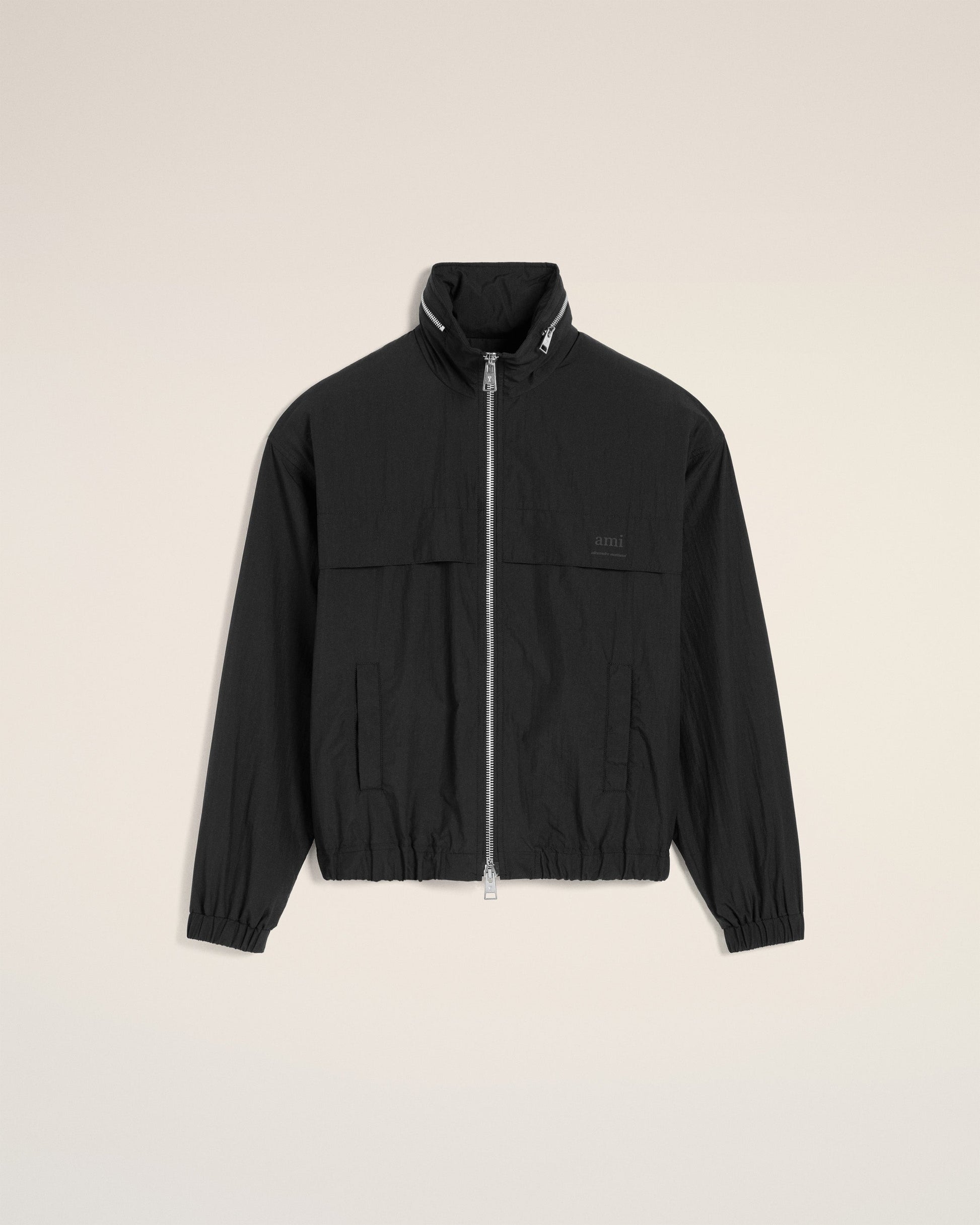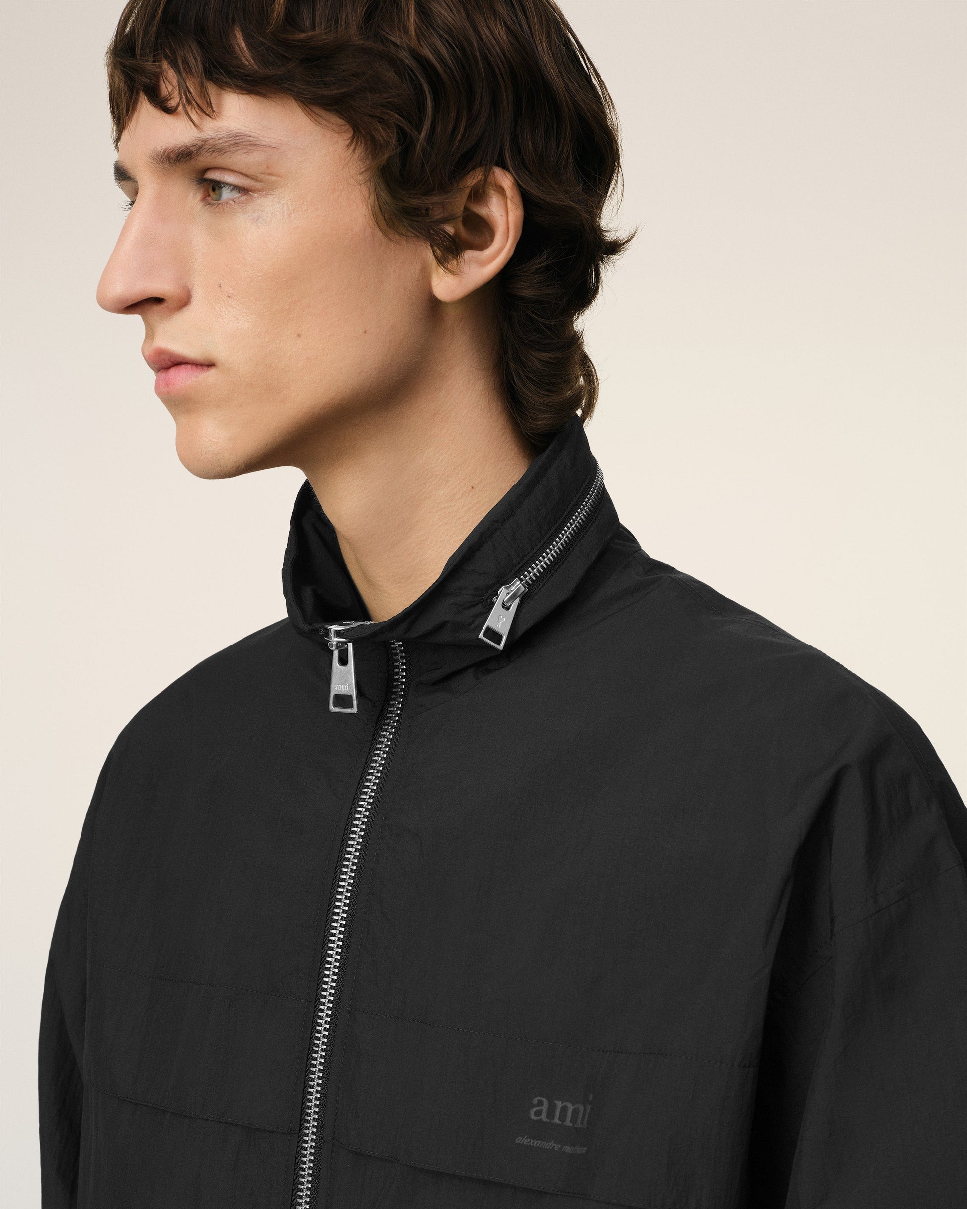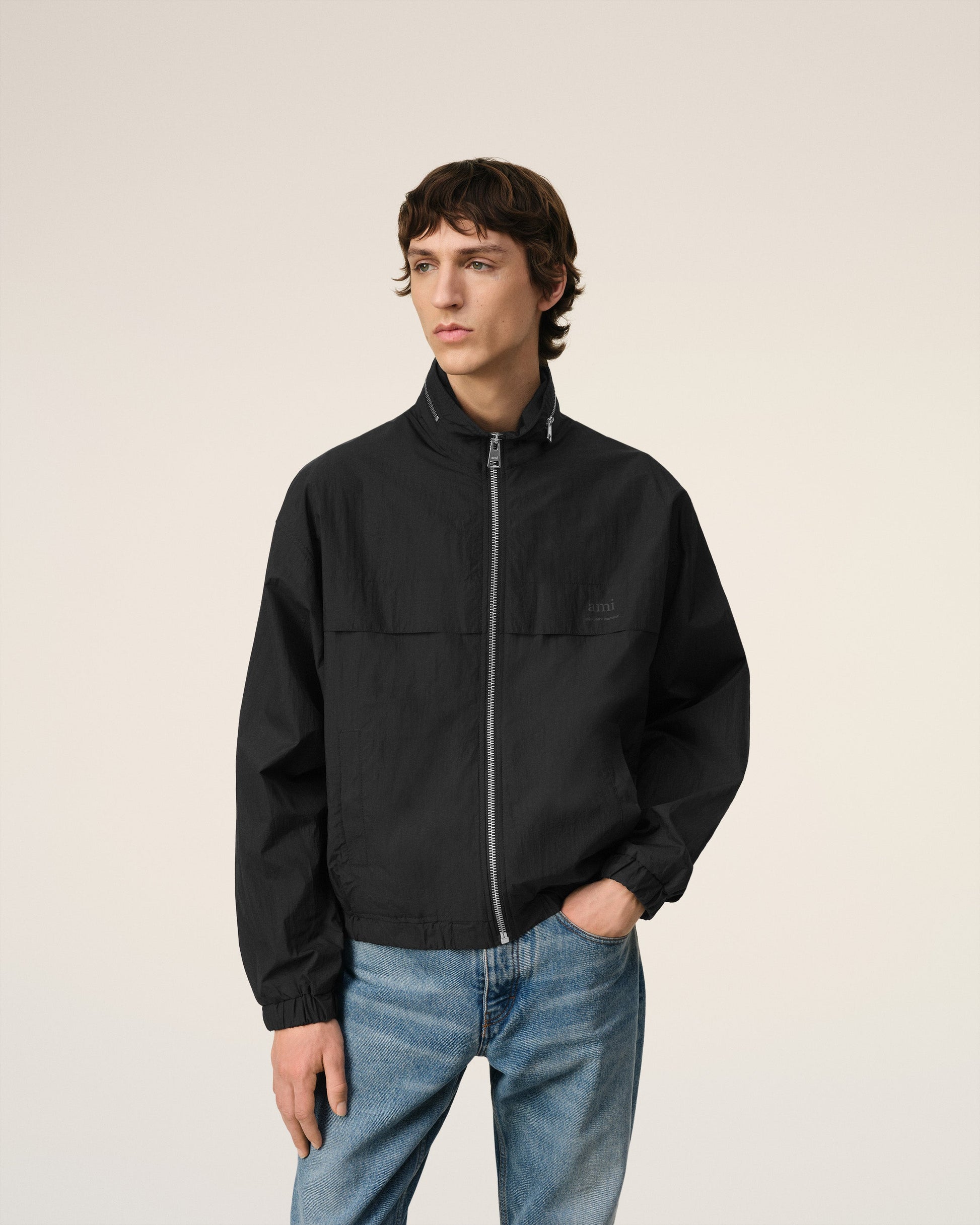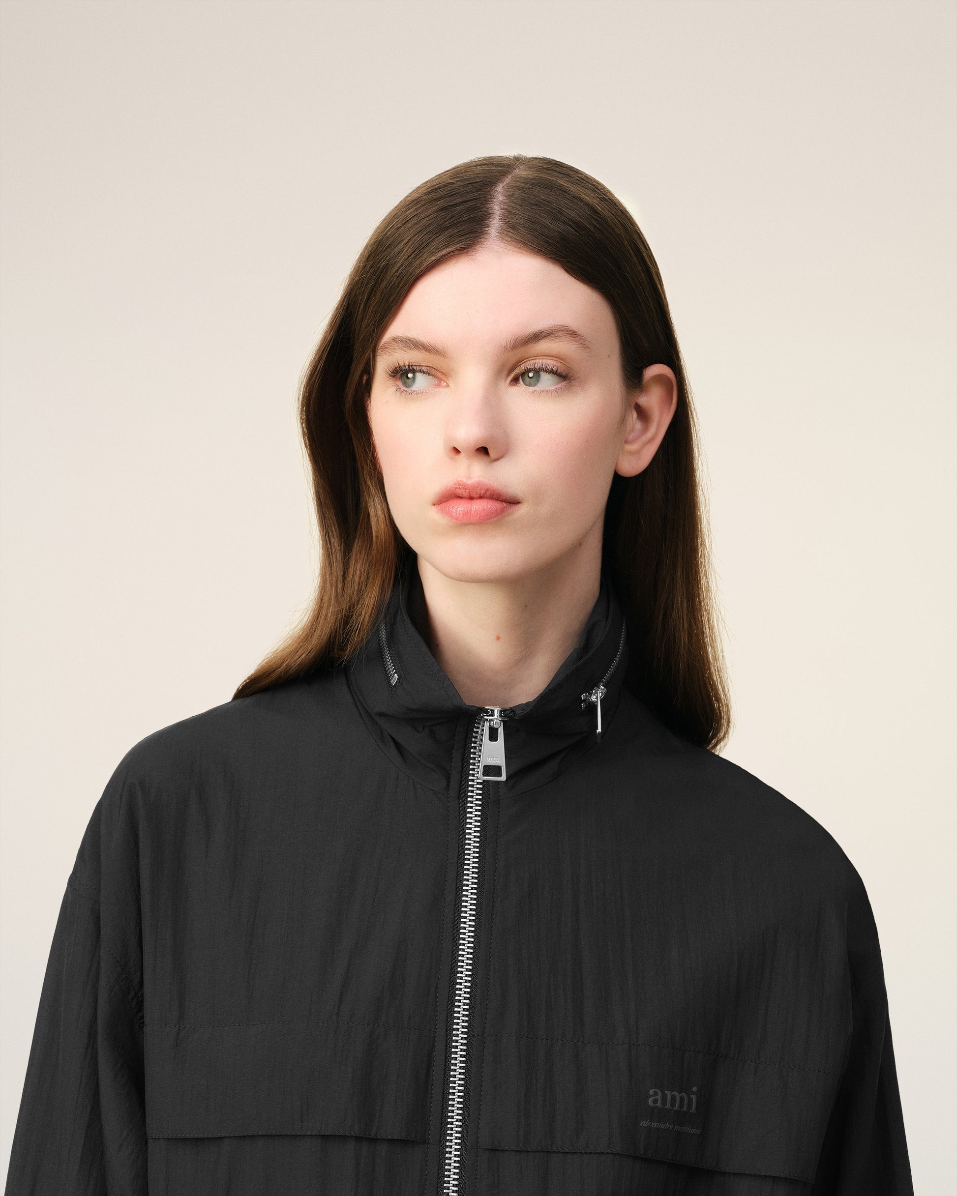 Windbreaker in technical canvas. Unisex product 62,5 cm center back length (size XS) 65 cm center back length (size M) Water-repellent fabric Nickel simple metal zipper with "ami" engraved pullers Side pockets with invisible snap buttons Elasticated waist and cuffs Hood hidden in the collar Gummy flock print "ami alexandre mattiussi" on the chest Made in Romania (with love) REF : UJK058.PA0009.001