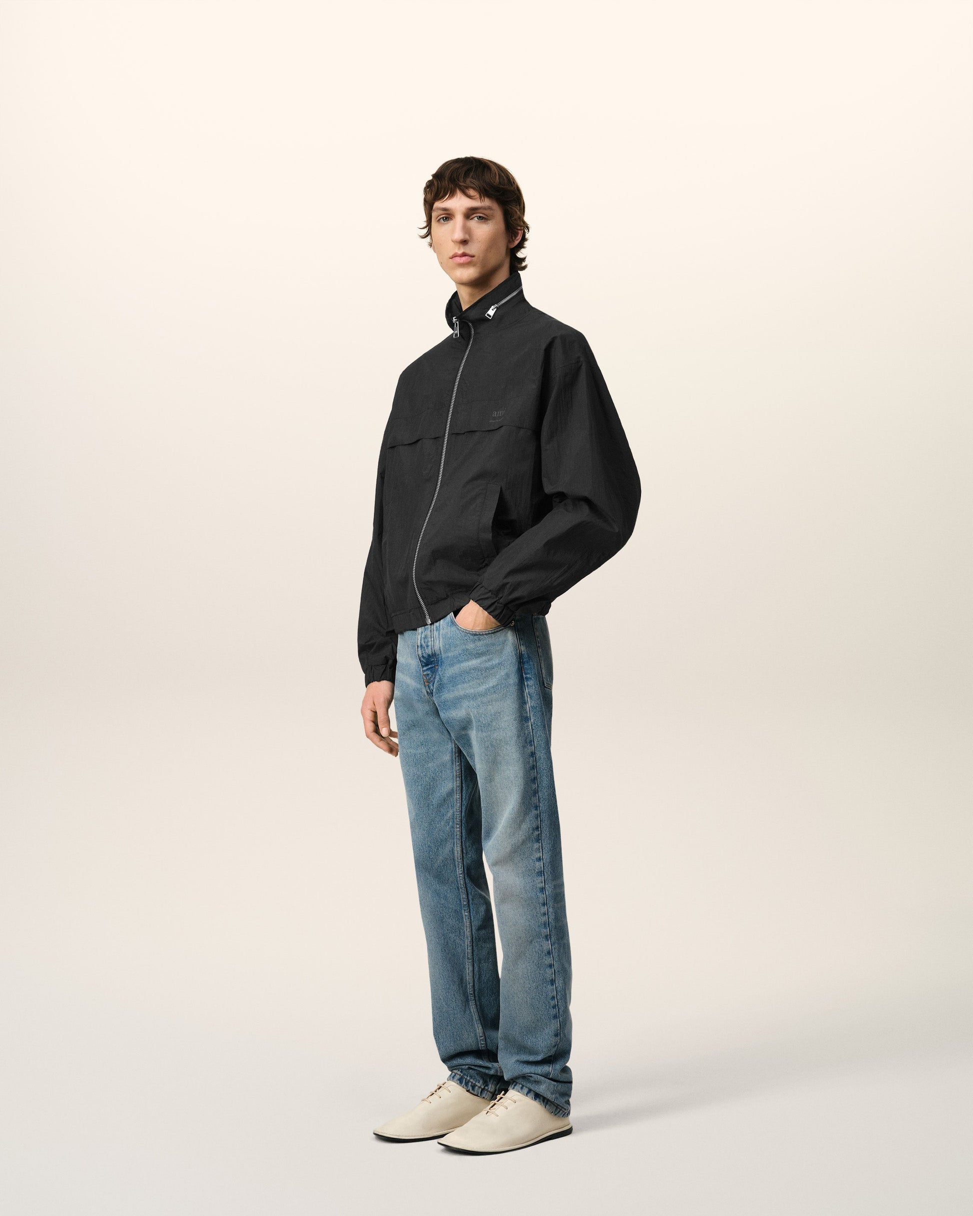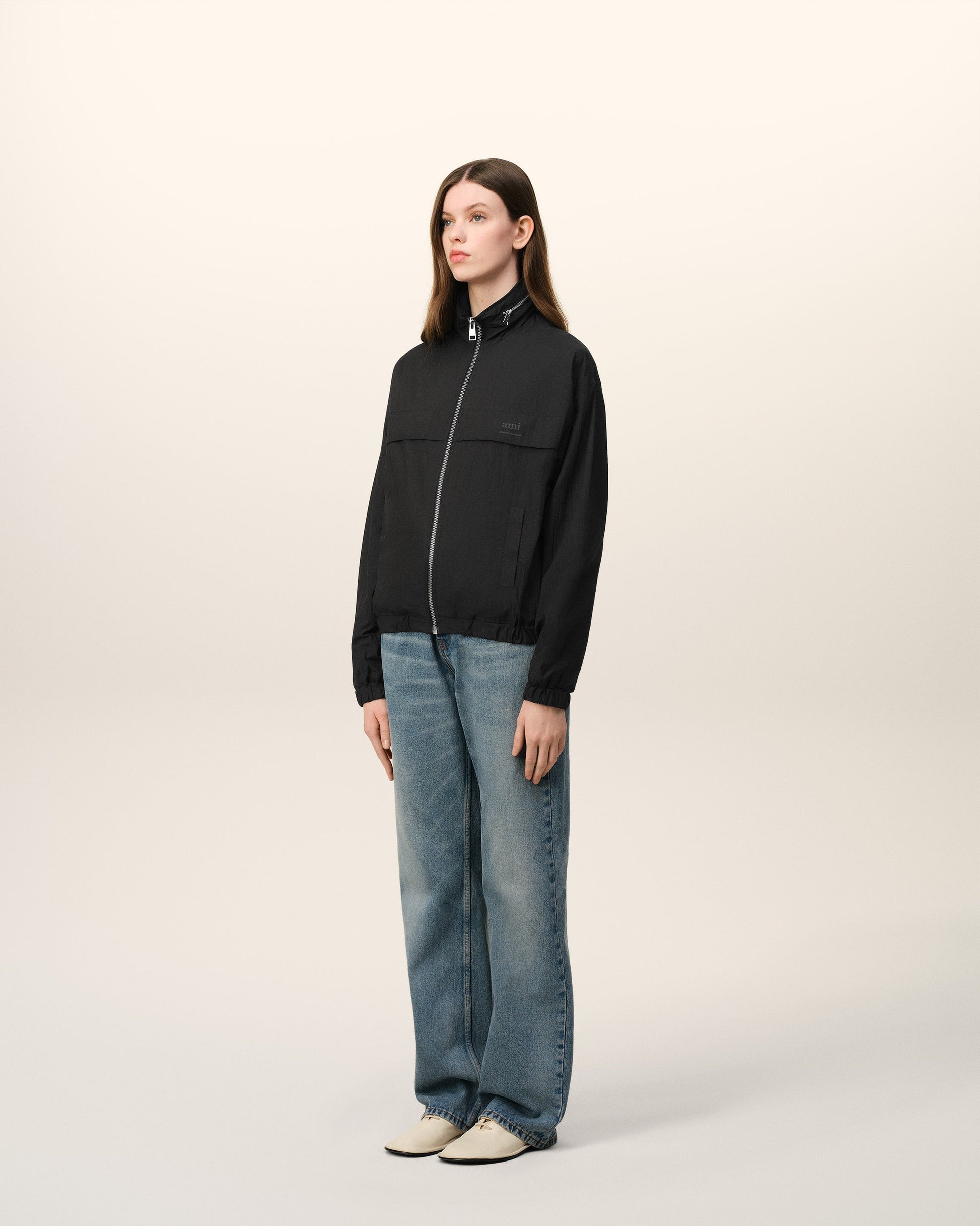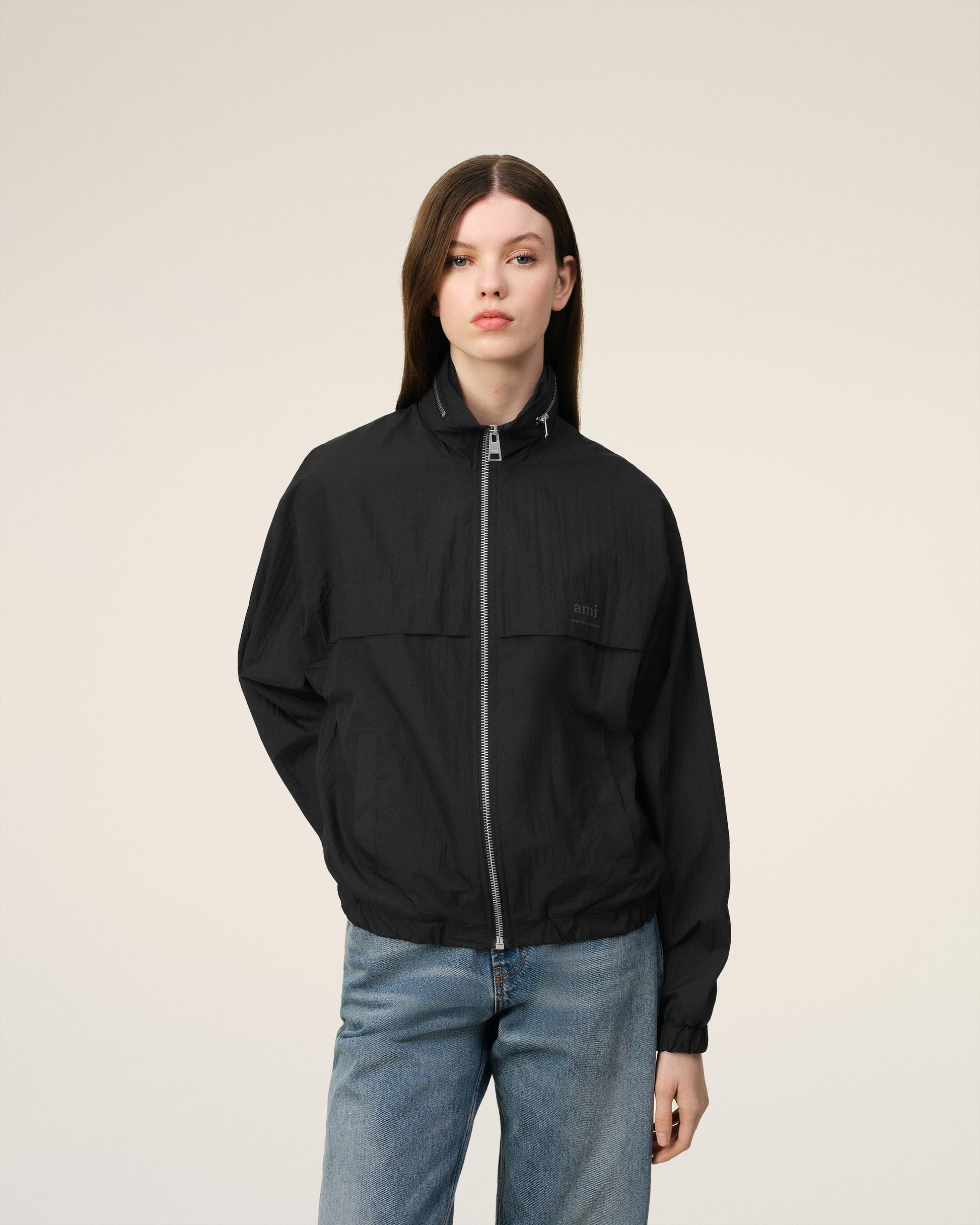 Windbreaker in technical canvas. Unisex product 62,5 cm center back length (size XS) 65 cm center back length (size M) Water-repellent fabric Nickel simple metal zipper with "ami" engraved pullers Side pockets with invisible snap buttons Elasticated waist and cuffs Hood hidden in the collar Gummy flock print "ami alexandre mattiussi" on the chest Made in Romania (with love) REF : UJK058.PA0009.001