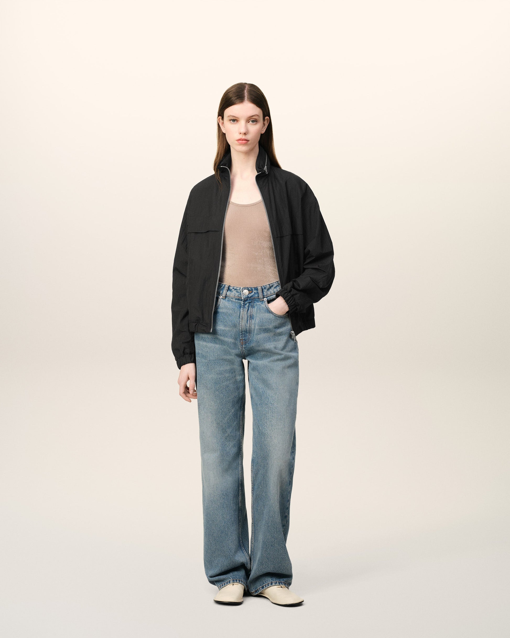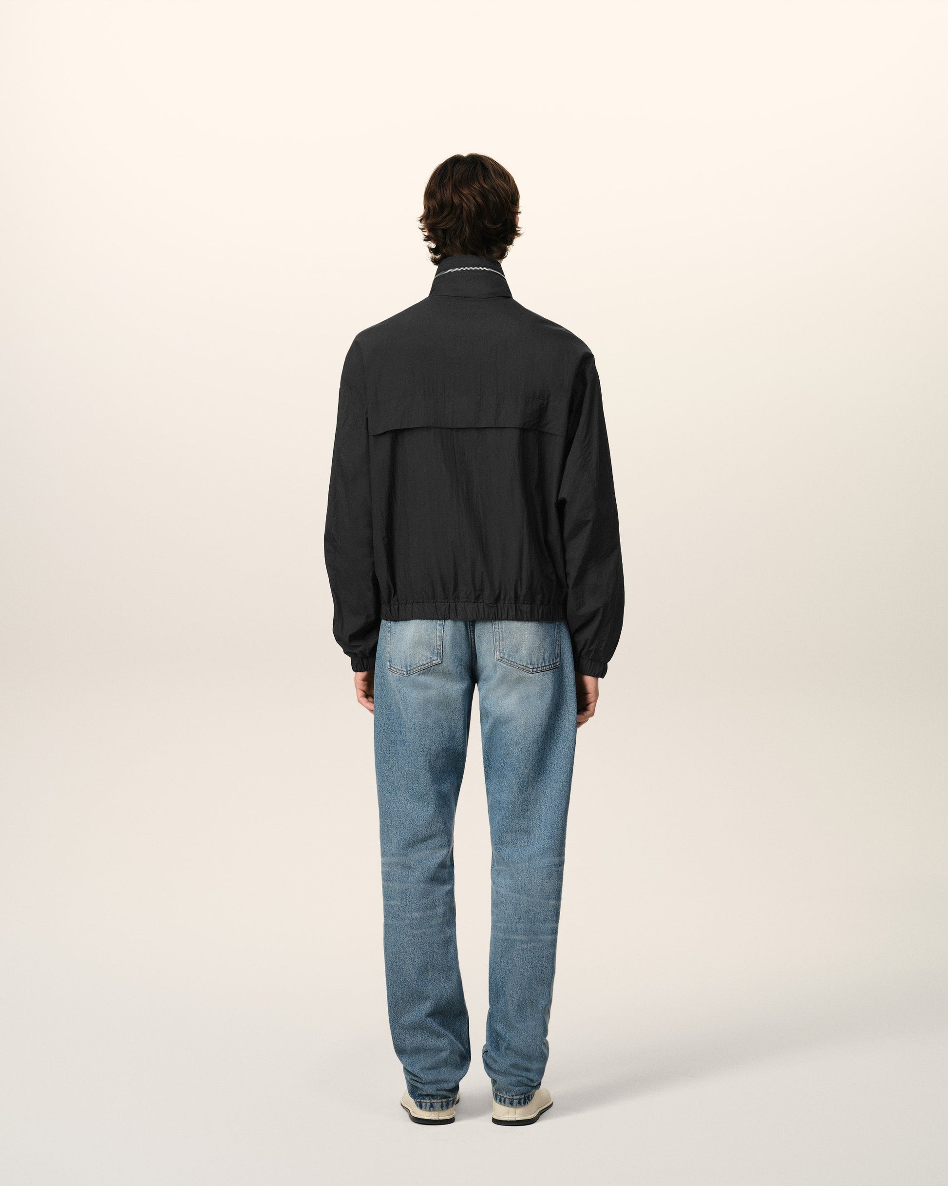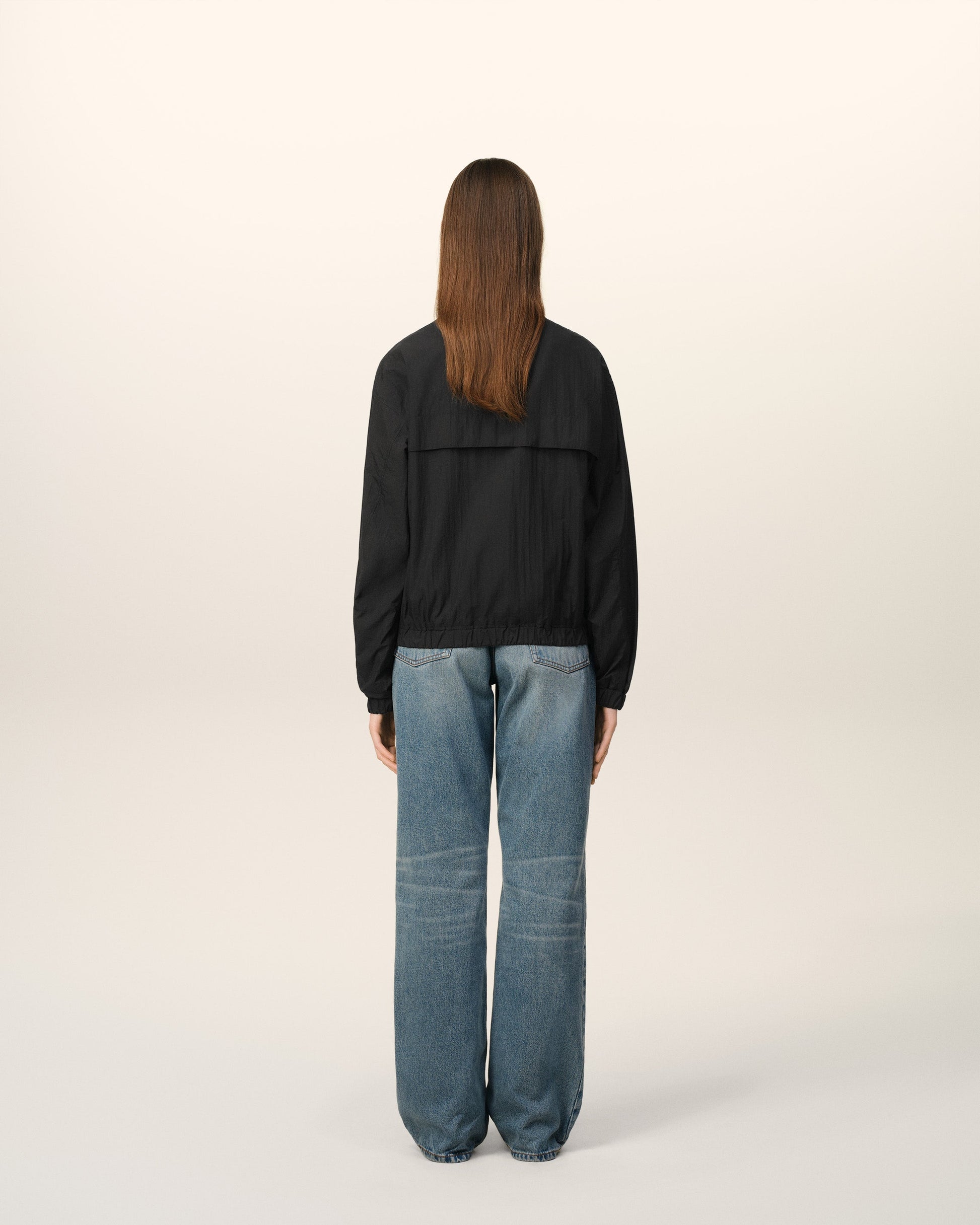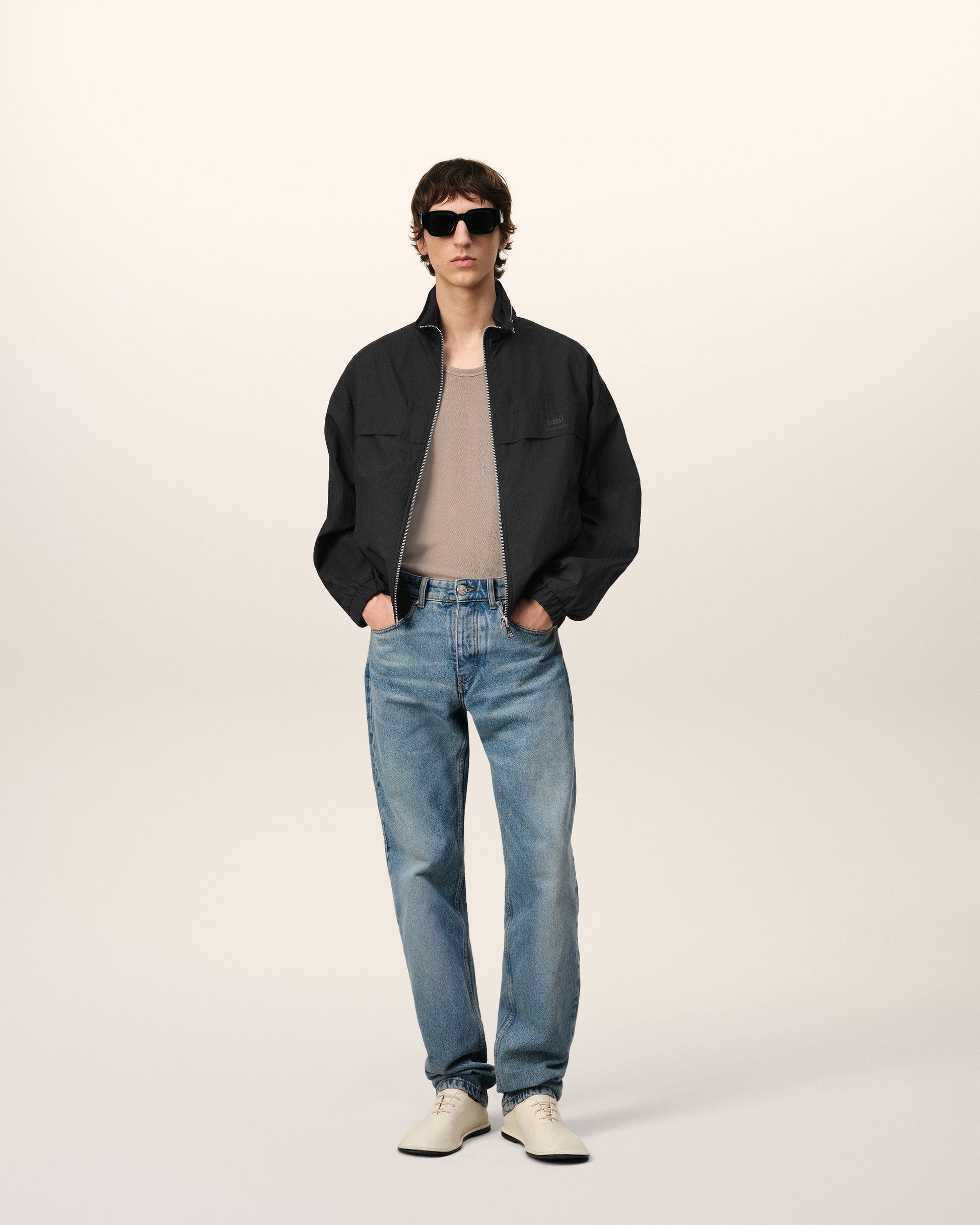 Windbreaker in technical canvas. Unisex product 62,5 cm center back length (size XS) 65 cm center back length (size M) Water-repellent fabric Nickel simple metal zipper with "ami" engraved pullers Side pockets with invisible snap buttons Elasticated waist and cuffs Hood hidden in the collar Gummy flock print "ami alexandre mattiussi" on the chest Made in Romania (with love) REF : UJK058.PA0009.001