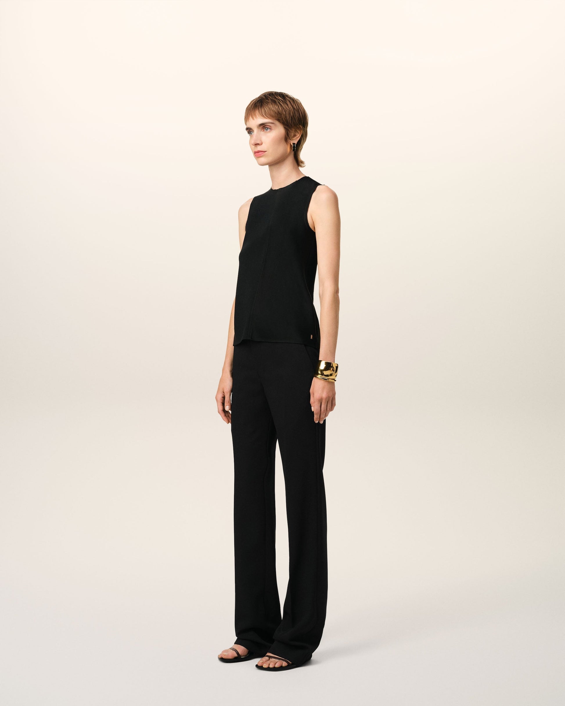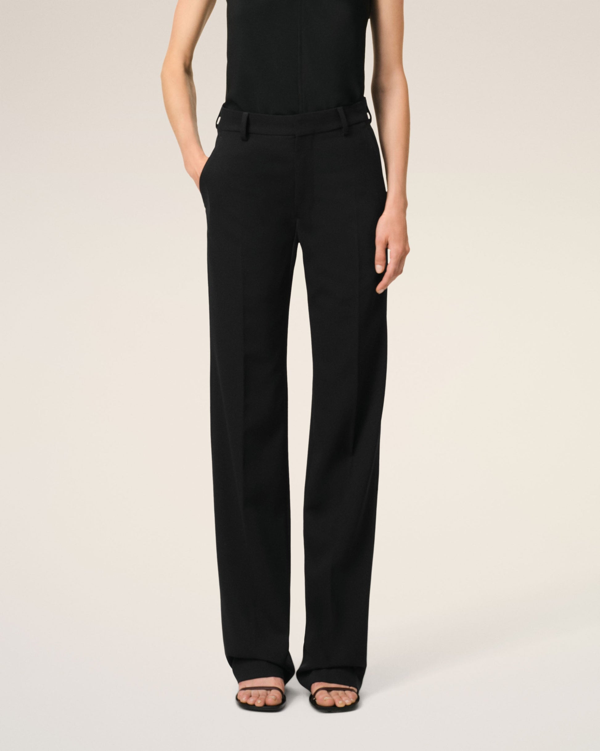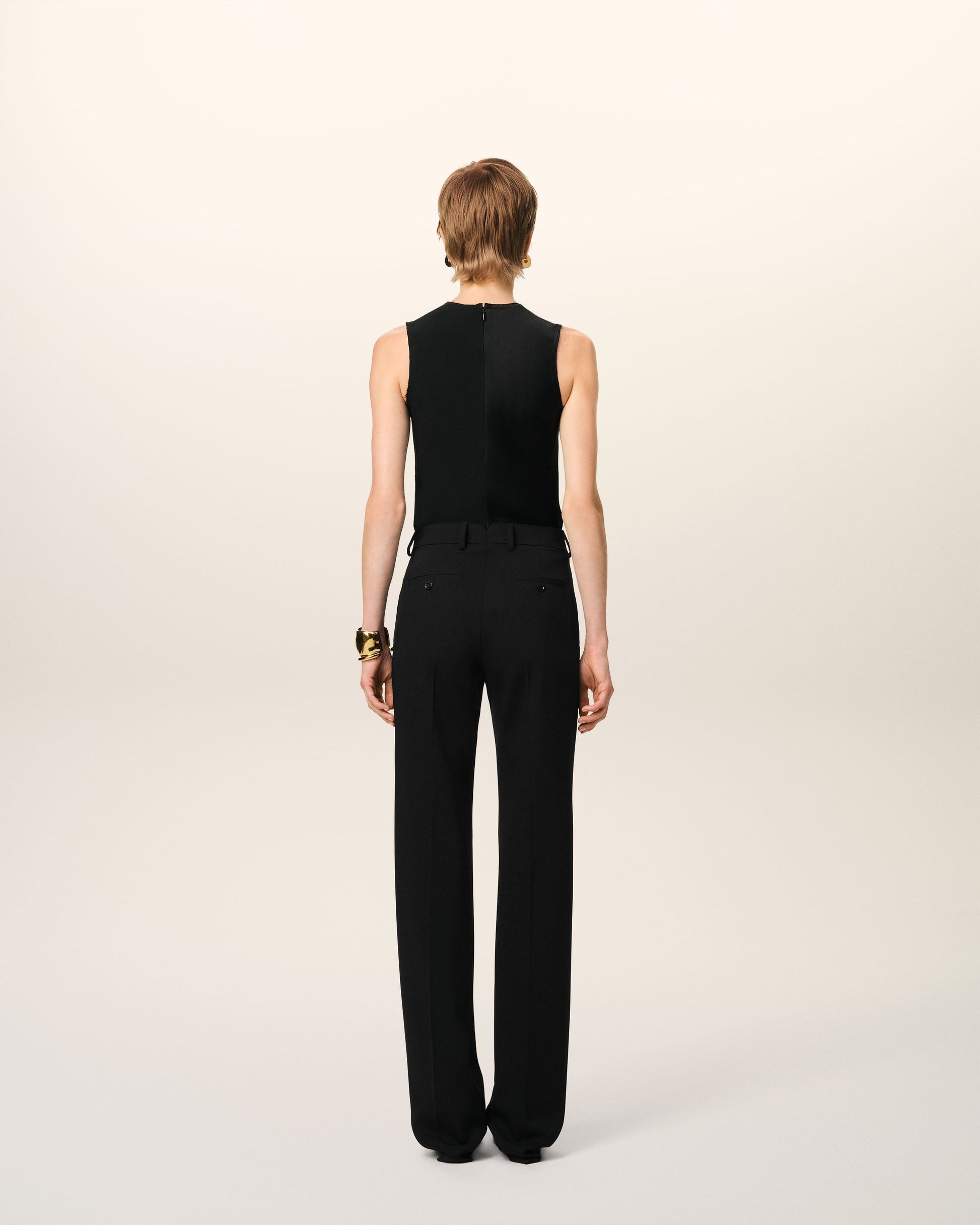 Straight trousers in wool gabardine. Straight fit 23 cm bottom leg width (size 36) Front lining to knees Zip fly V detail on the back "ami" waistband Buttoned back pockets Horn buttons Made in Romania (with love) REF: FTR506.WV0067.001