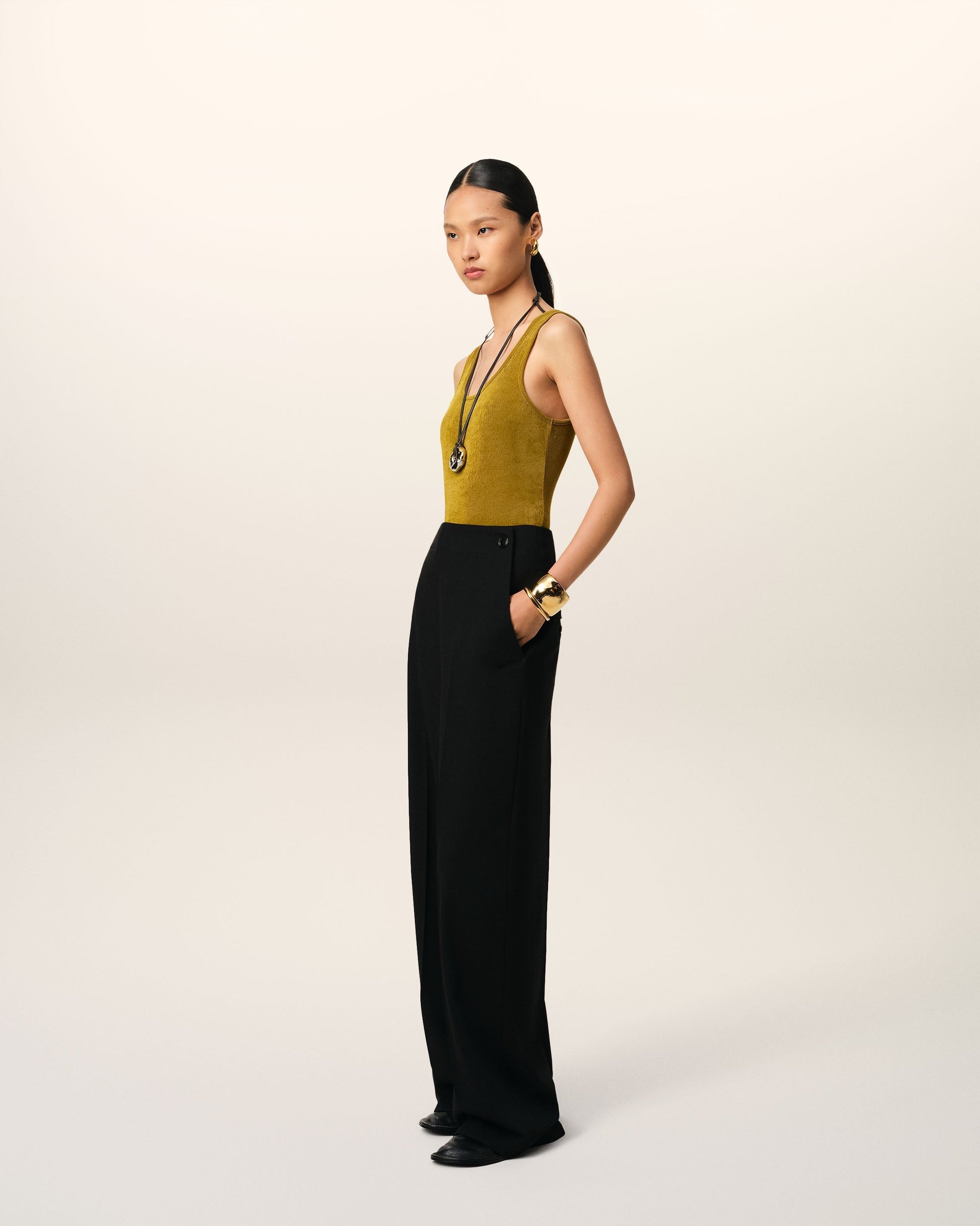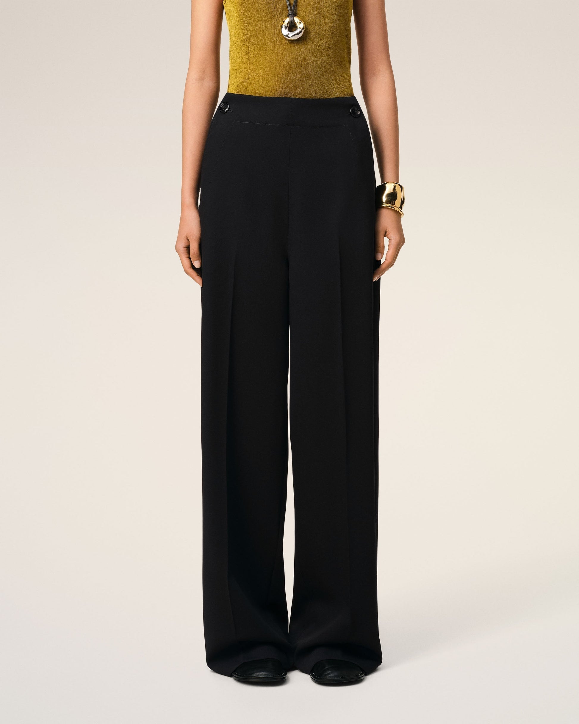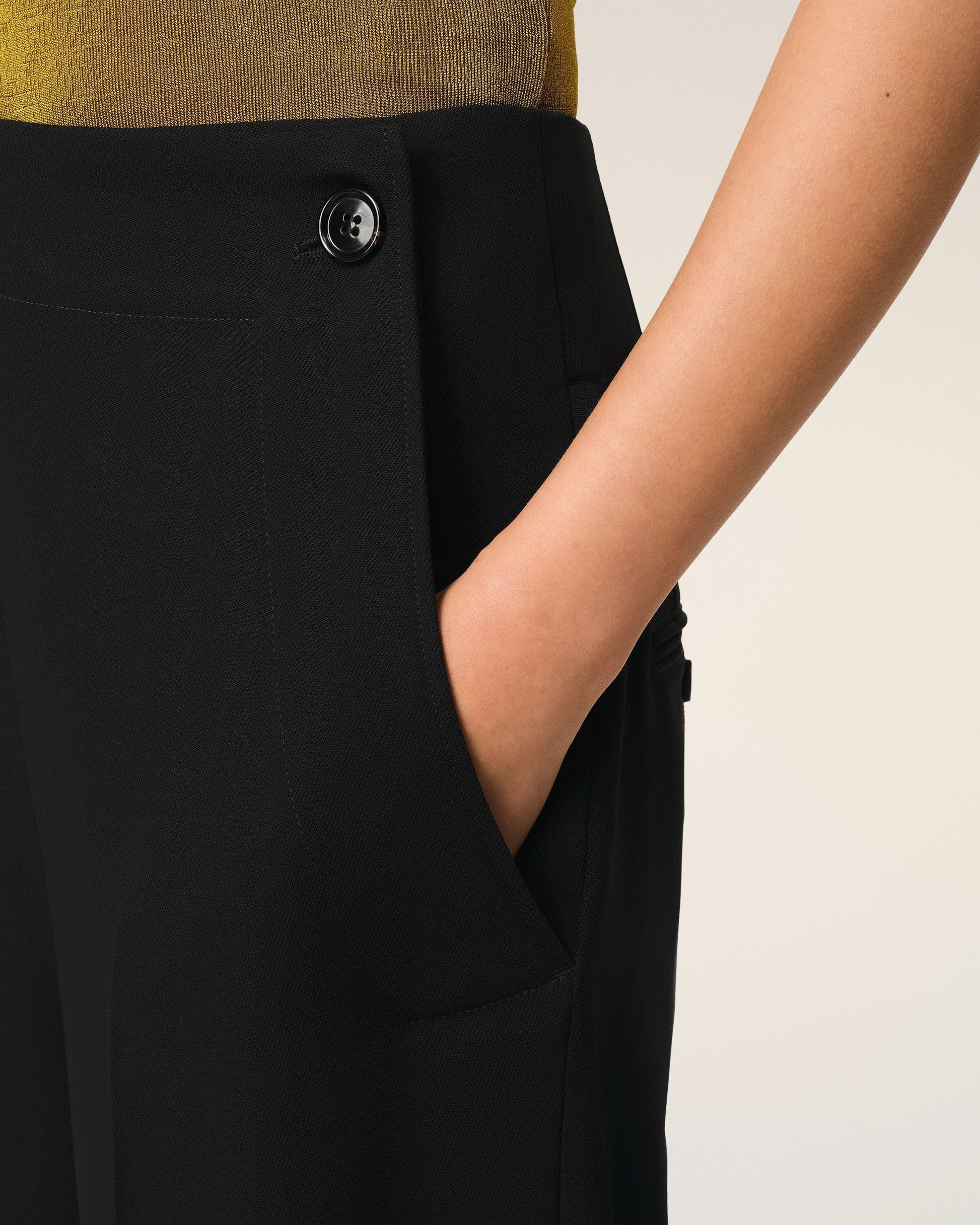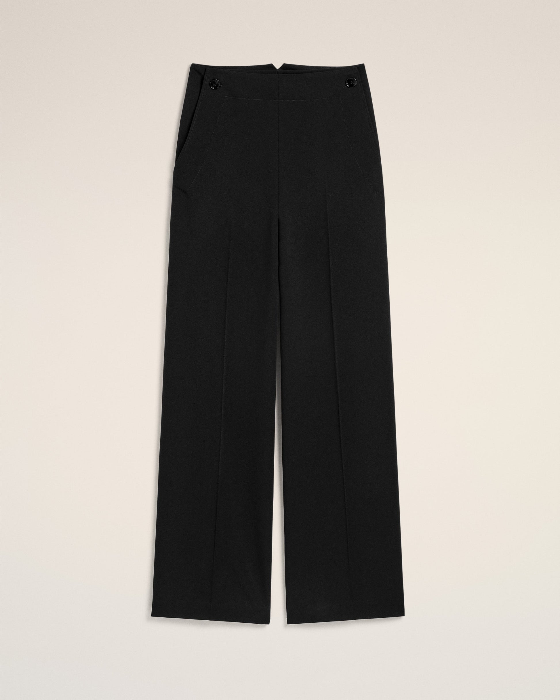 Sailor trousers in wool gabardine. Wide fit 31 cm bottom leg width (size 36) Front lining until knees Drop-front closure with buttons Side pockets Back piping pockets Horn buttons Made in Moldavia (with love) REF: FTR430.WV0067.001